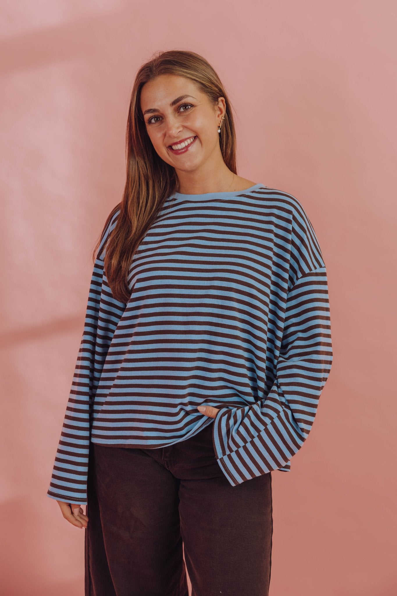 De Melanie Longsleeve in blauw met bruin is een top met een iets wijder model. De top is gemaakt van een stretchy stof, heeft lange mouwen met een hoge, ronde halslijn en een streep patroon. Deze lange mouwen top is perfect om laagjes mee te creëren in het najaar.