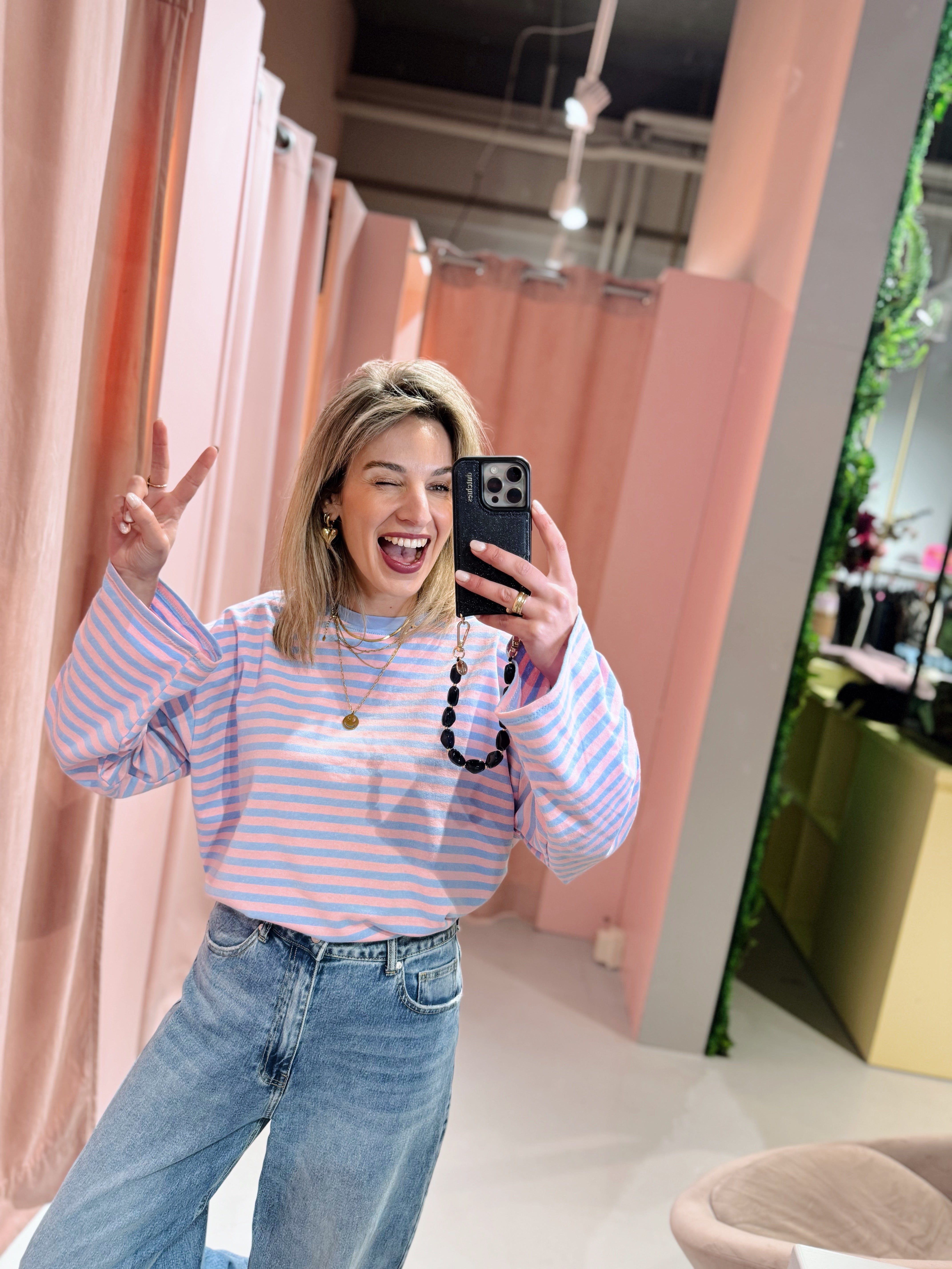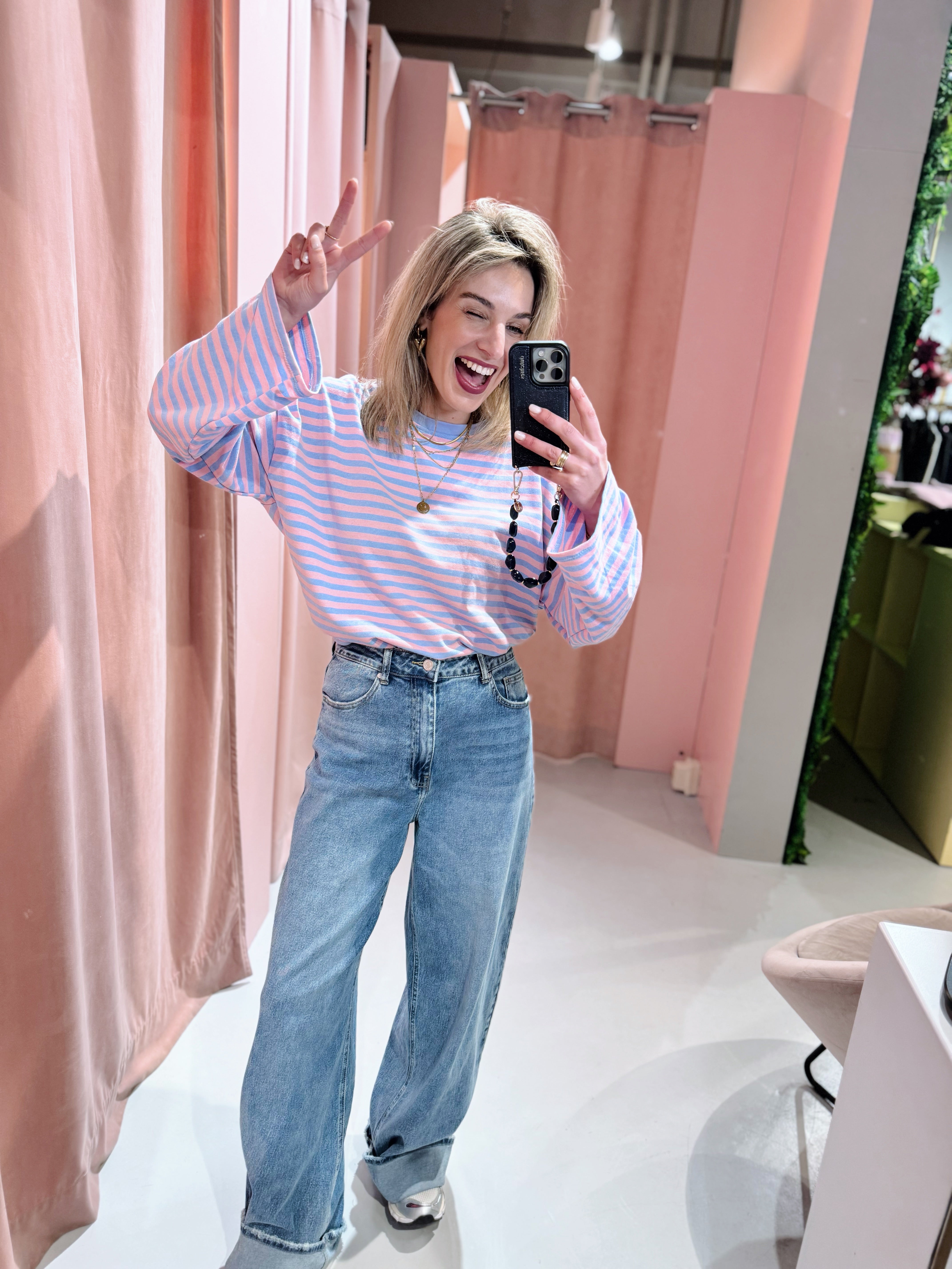 De Melanie Longsleeve in lichtblauw met roze is een top met een iets wijder model. De top is gemaakt van een stretchy stof, heeft lange mouwen met een hoge, ronde halslijn en een streep patroon. Deze lange mouwen top is perfect om laagjes mee te creëren in het najaar.