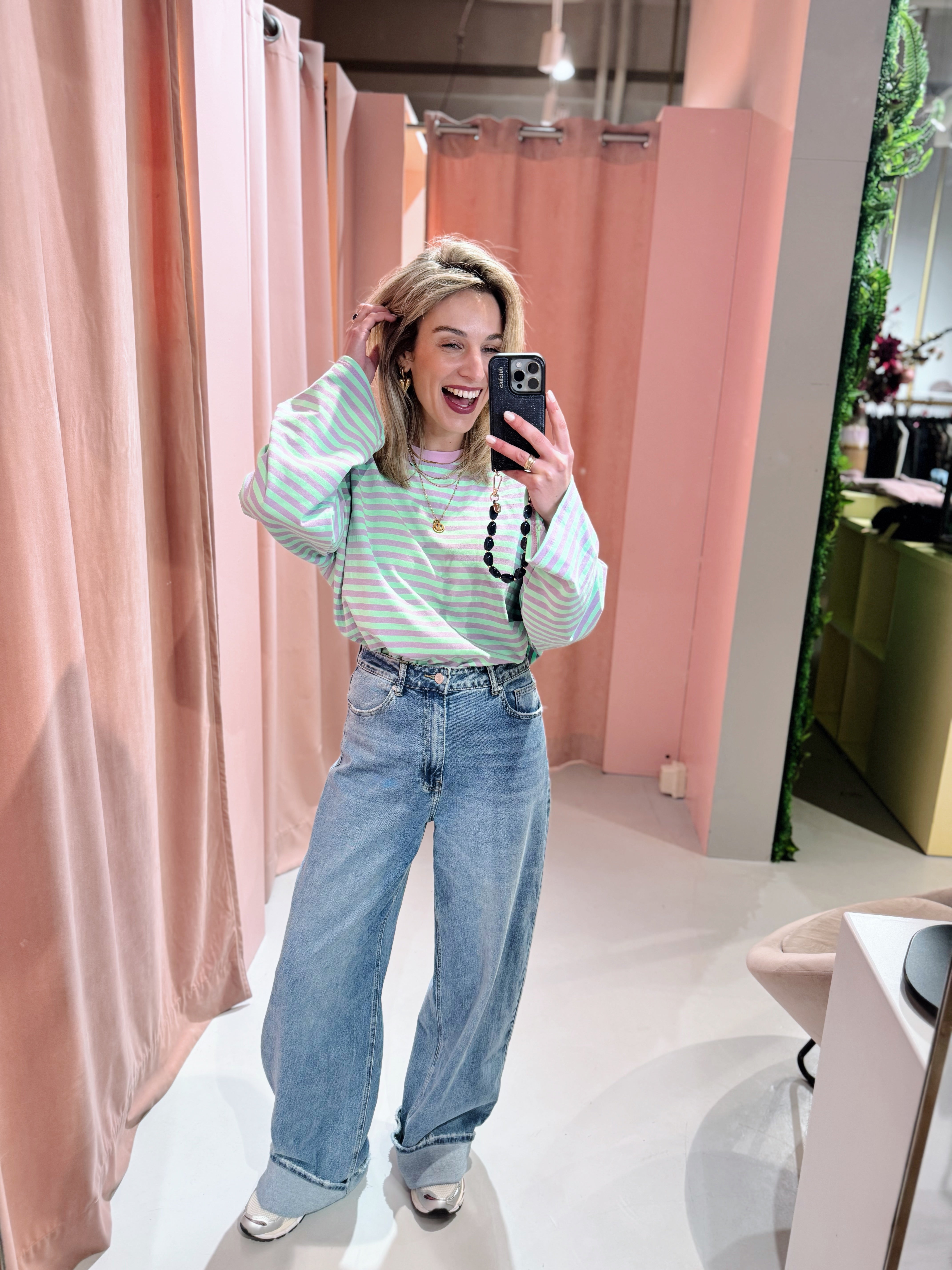 De Melanie Longsleeve in mint met lila is een top met een iets wijder model. De top is gemaakt van een stretchy stof, heeft lange mouwen met een hoge, ronde halslijn en een streep patroon. Deze lange mouwen top is perfect om laagjes mee te creëren in het najaar.