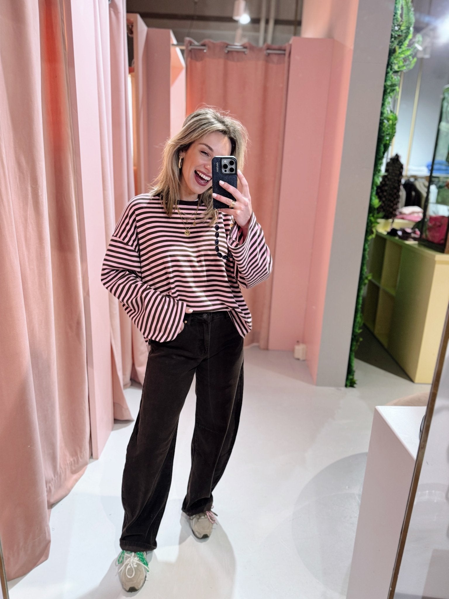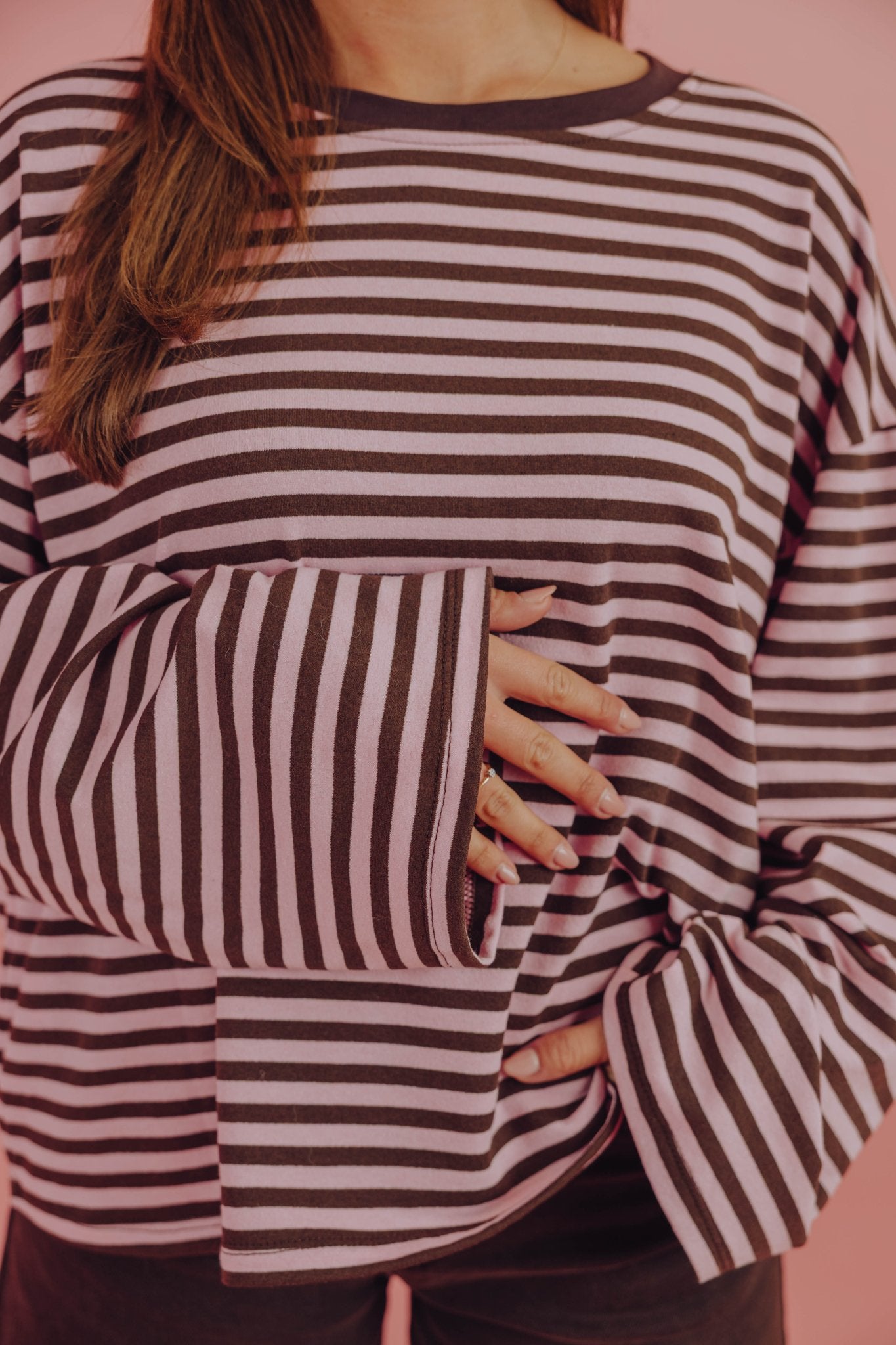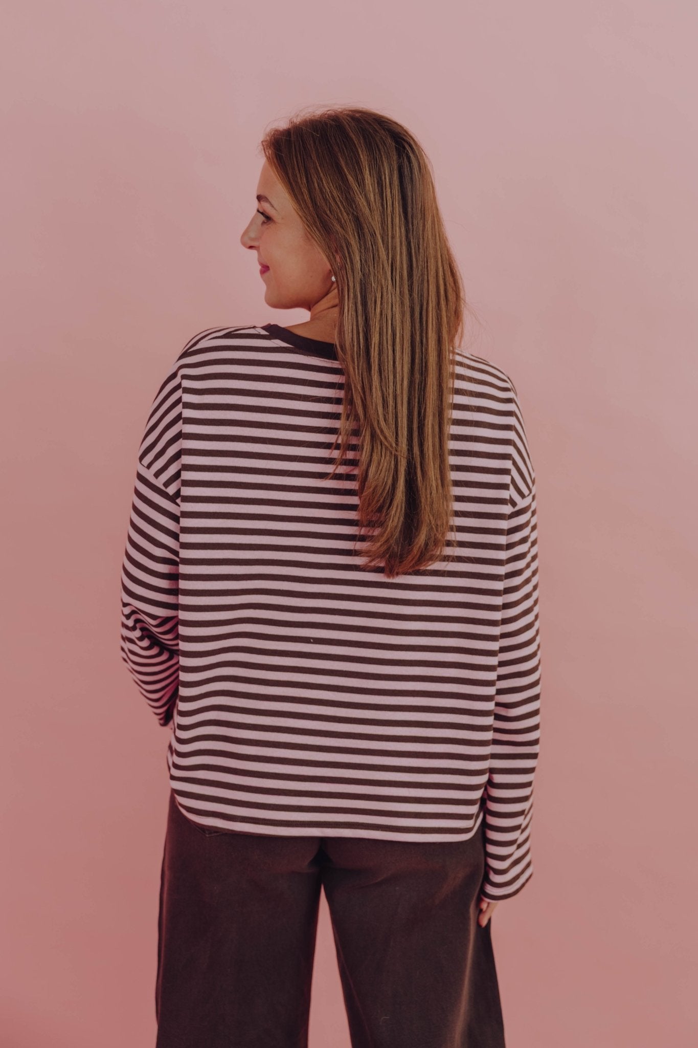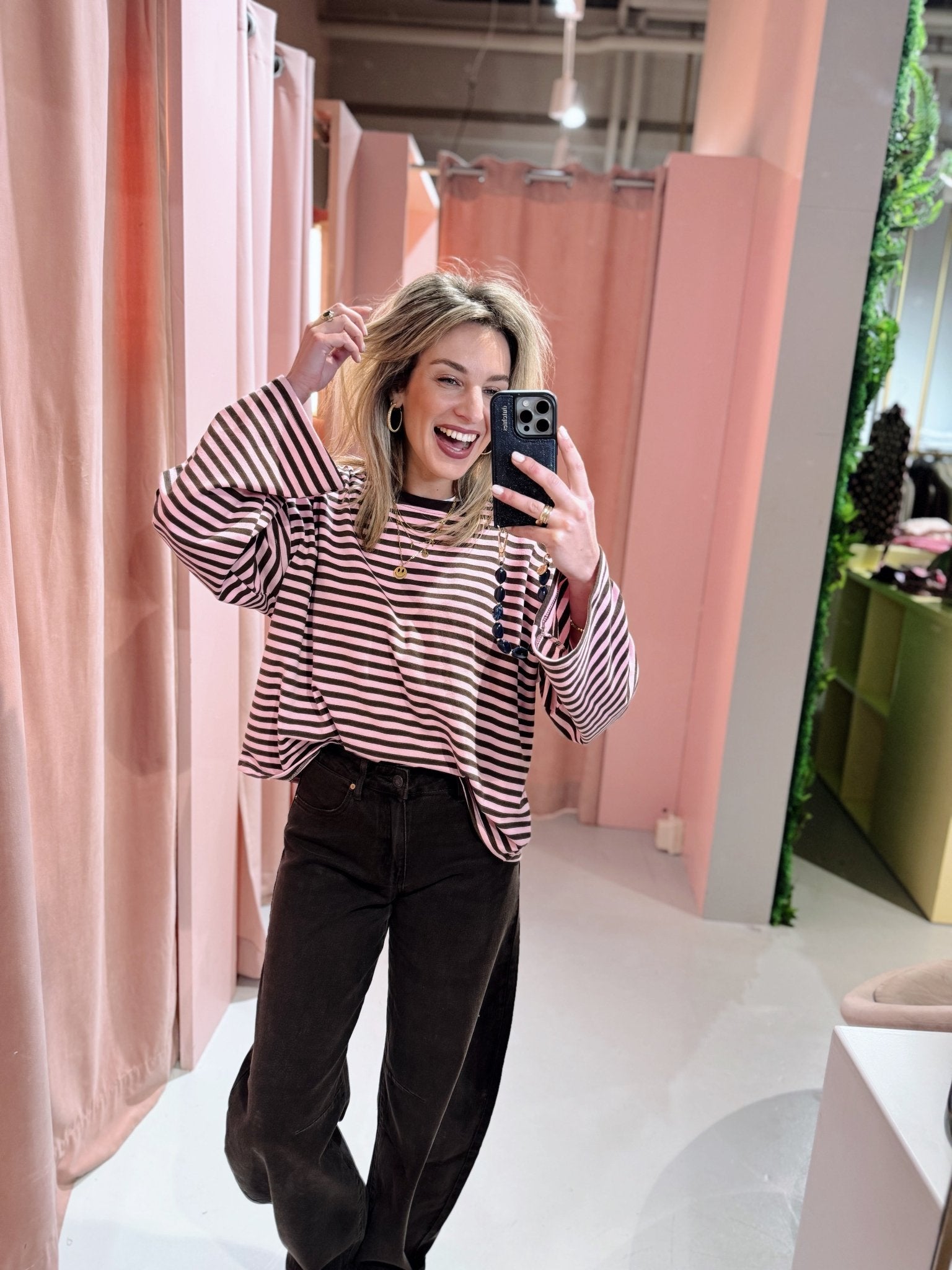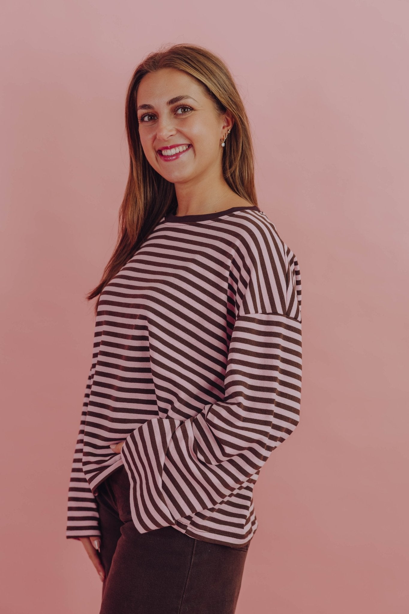 De Melanie Longsleeve in roze met bruin is een top met een iets wijder model. De top is gemaakt van een stretchy stof, heeft lange mouwen met een hoge, ronde halslijn en een streep patroon. Deze lange mouwen top is perfect om laagjes mee te creëren in het najaar.
