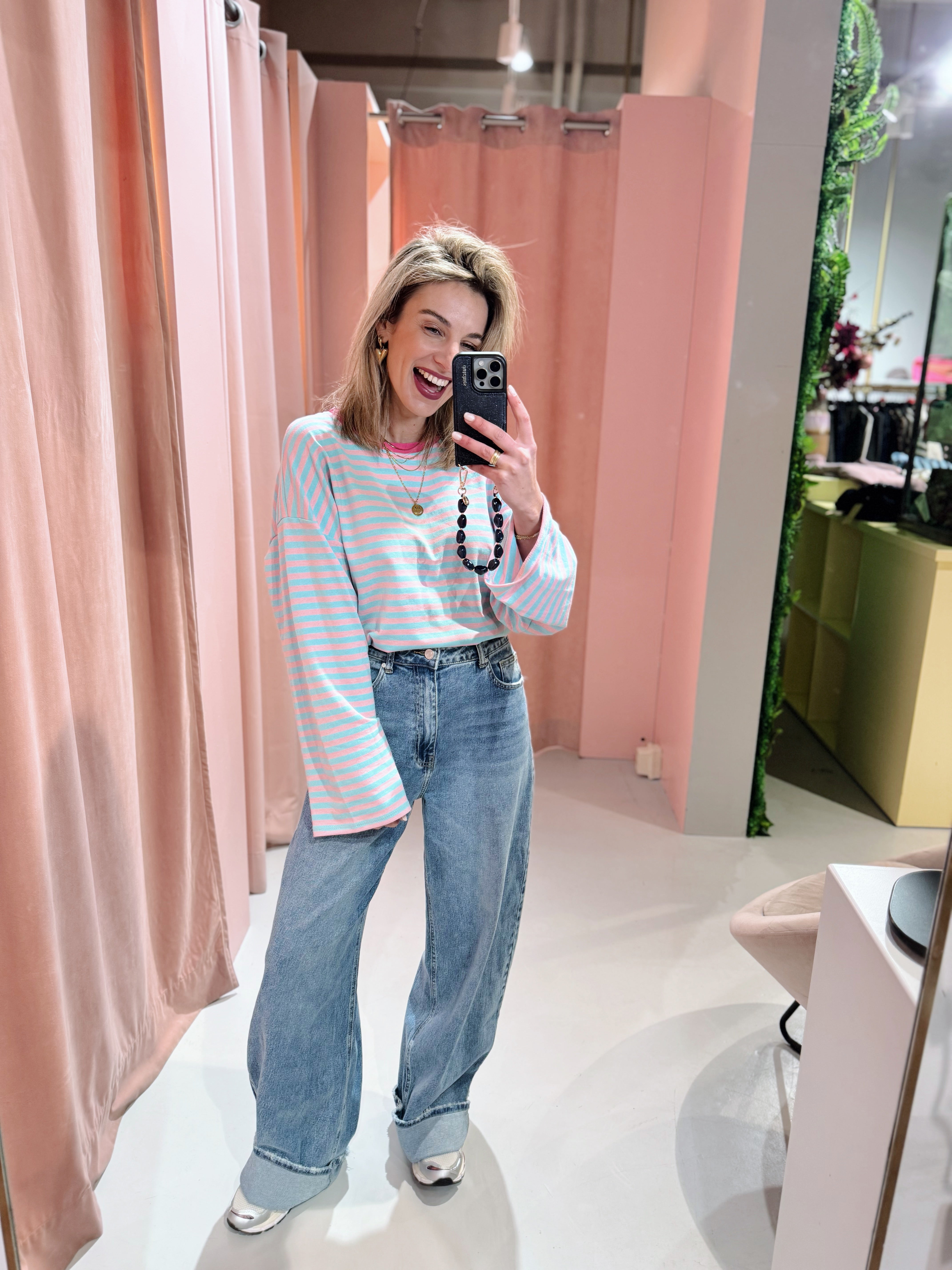 De Melanie Longsleeve in turquoise met roze is een top met een iets wijder model. De top is gemaakt van een stretchy stof, heeft lange mouwen met een hoge, ronde halslijn en een streep patroon. Deze lange mouwen top is perfect om laagjes mee te creëren in het najaar.