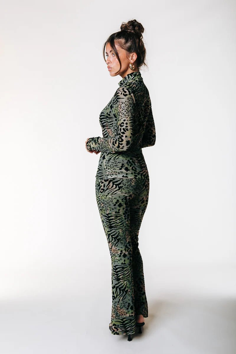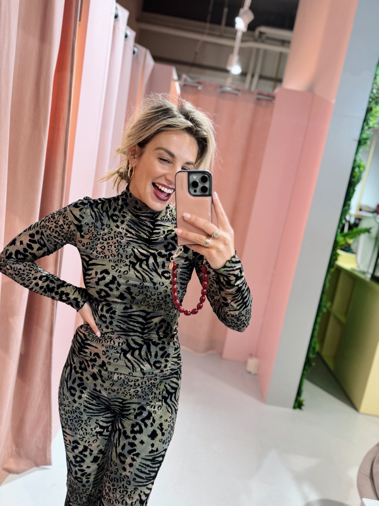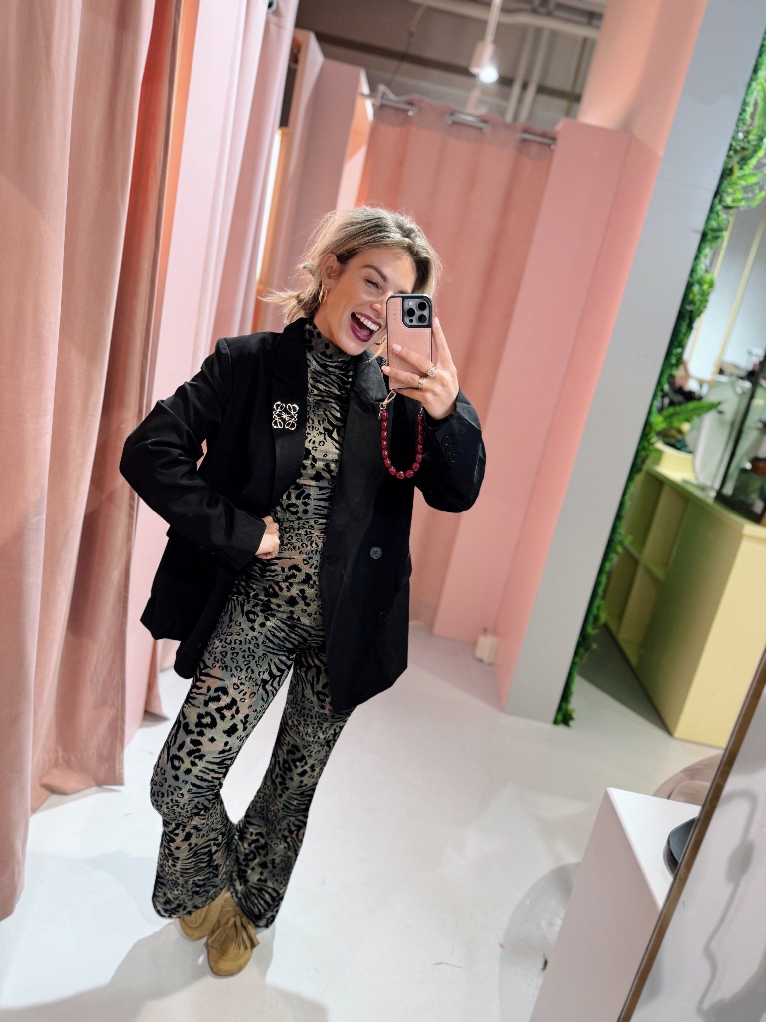 De Mesh Flare Pants in leopard is een echte statement piece. De broek heeft een aangesloten pasvorm met uitlopende pijpen en een elastische taille, waardoor hij lekker meebeweegt. Het mesh materiaal met stretch zorgt voor een opvallende look die je zowel casual als chic kunt dragen. Combineer met de bijpassende top voor een complete set, of style hem los met een oversized trui of blazer.