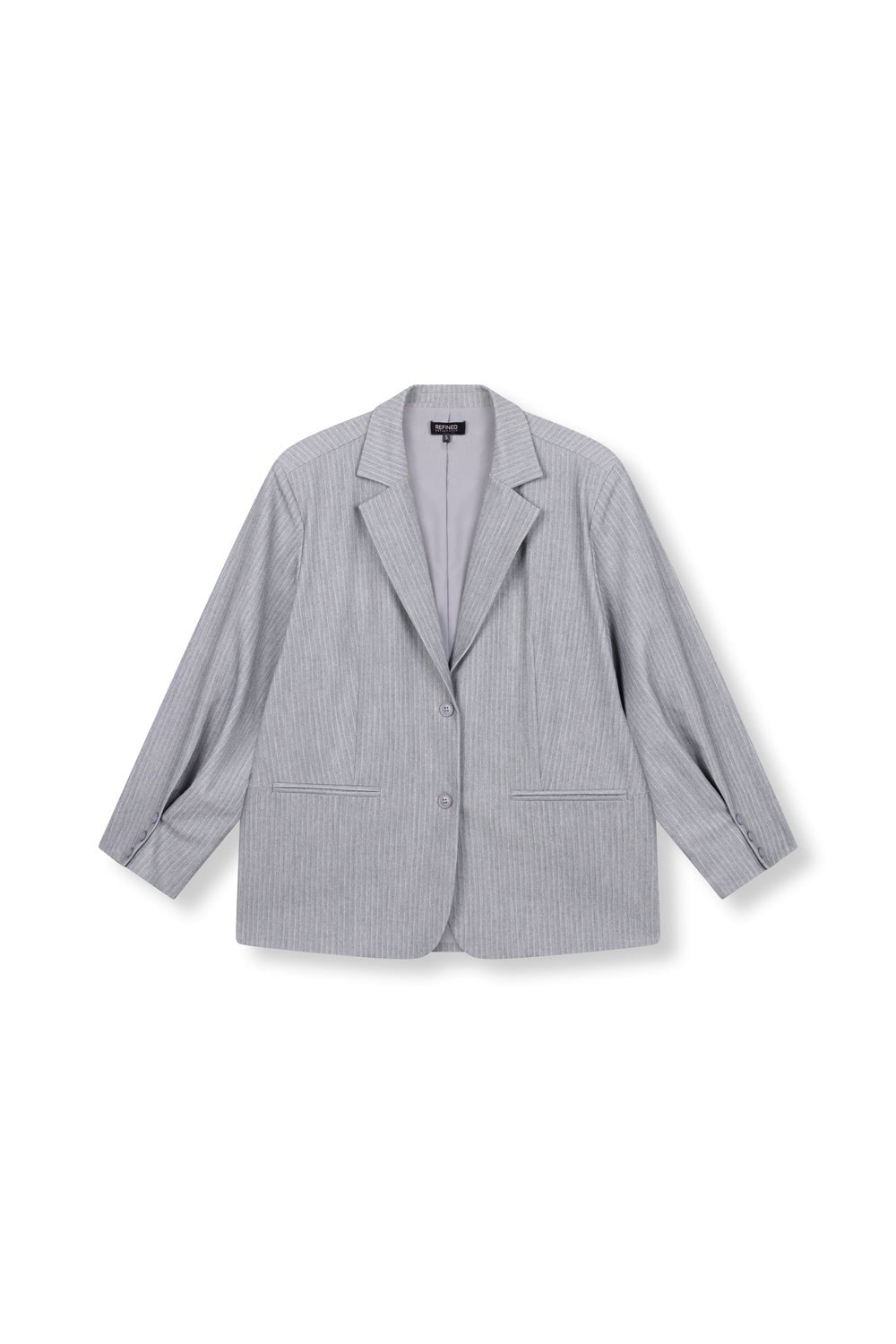De Mikky Blazer in grijs van Refined Department is een elegante, licht oversized blazer met een subtiele krijtstreep met een glittertje. De blazer heeft een klassieke reverskraag, twee knopen aan de voorkant en rechte paspelzakken. De lichte grijstint en het tijdloze streeppatroon geven de blazer een verfijnde uitstraling die zowel zakelijk als casual gedragen kan worden. Combineer hem met de bijpassende pantalon voor een complete set.