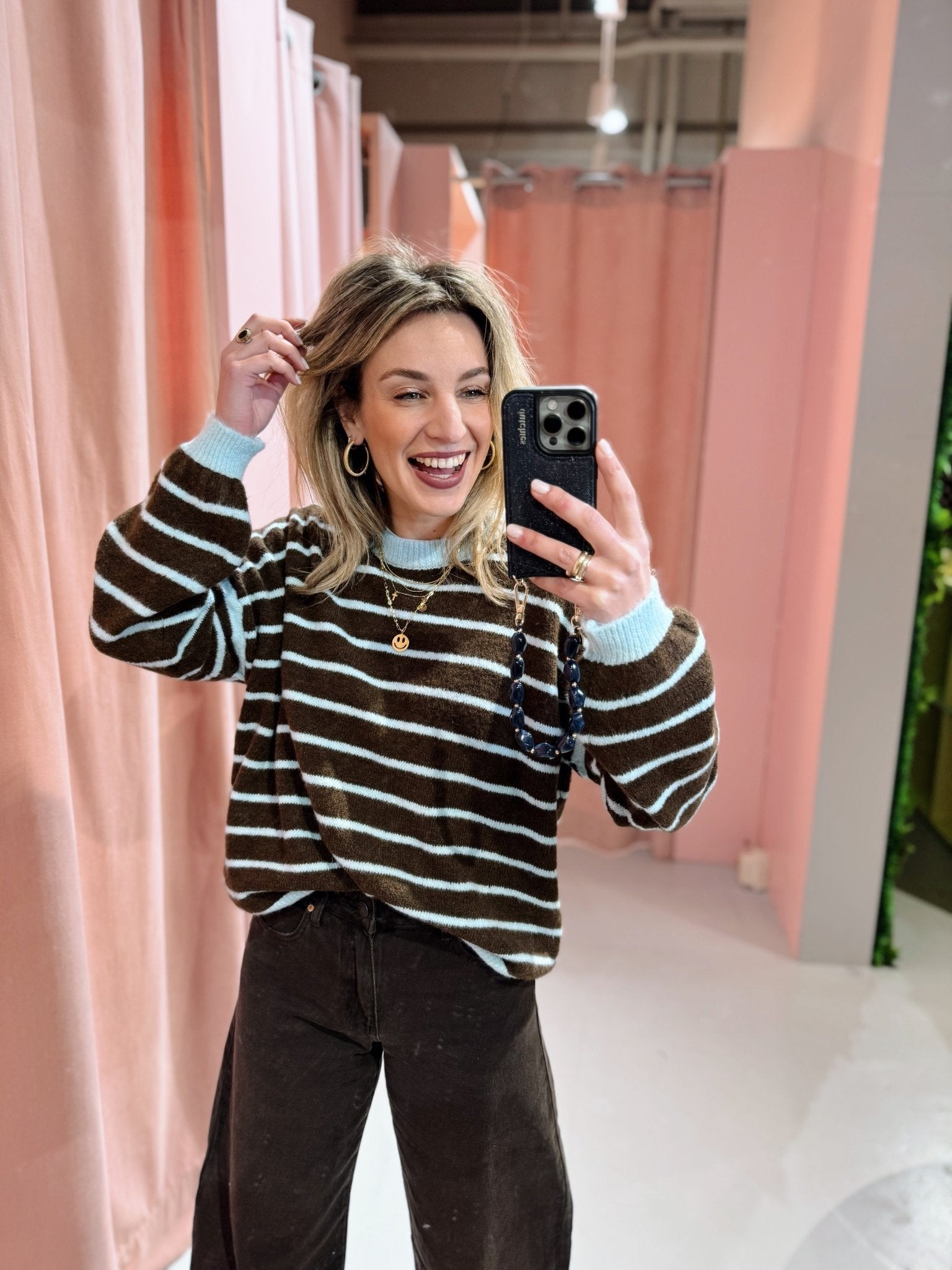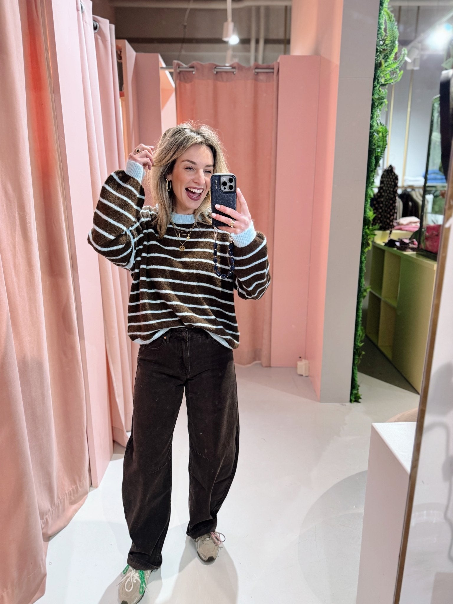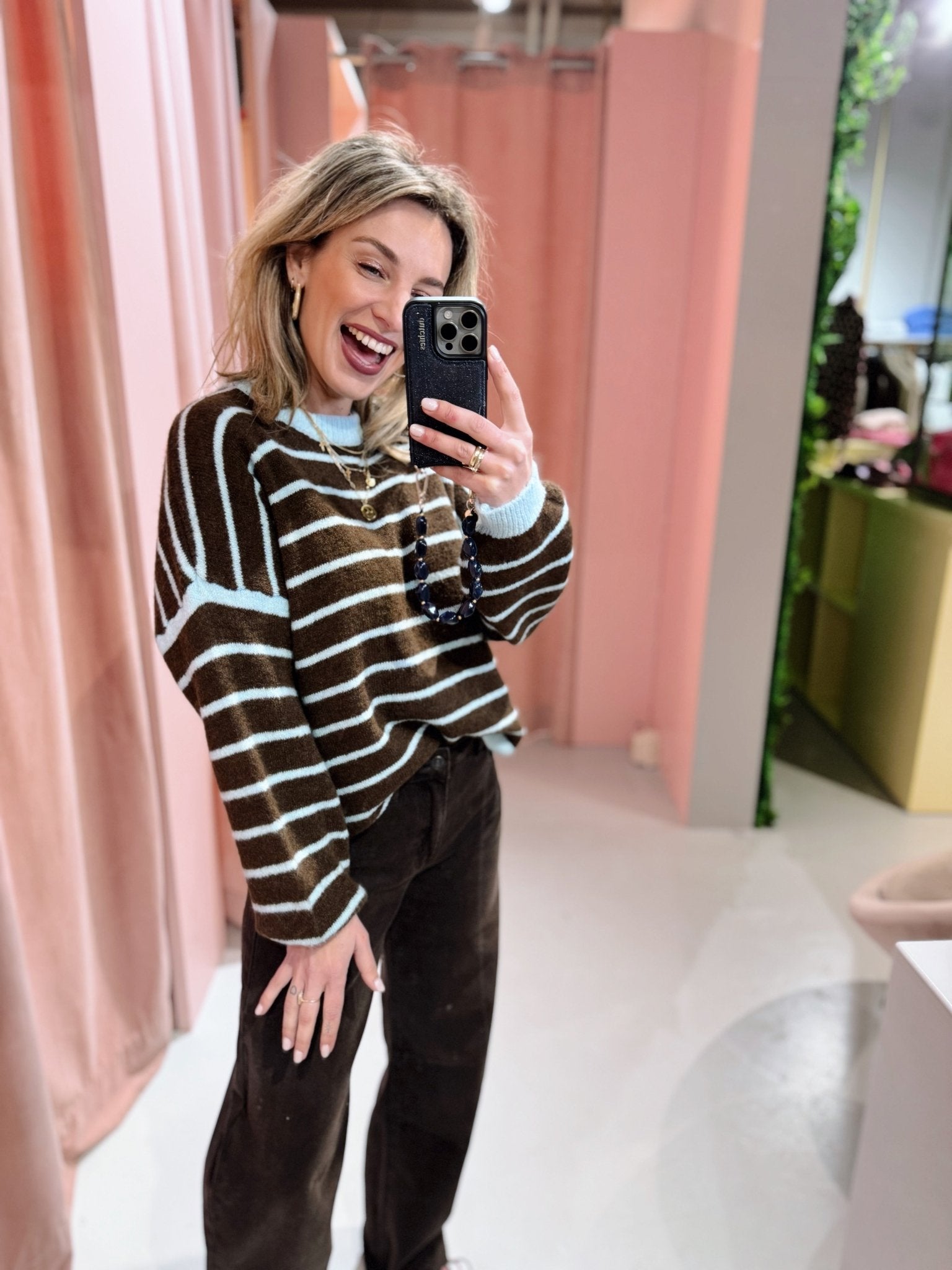 De Mila Knit in blauw is een knit met een boxy model. De trui is gemaakt van een gebreid materiaal, heeft lange mouwen en een ronde halslijn. Doordat de trui voorzien is van een streep patroon, is het een leuke kleurrijke toevoeging aan je outfit!
