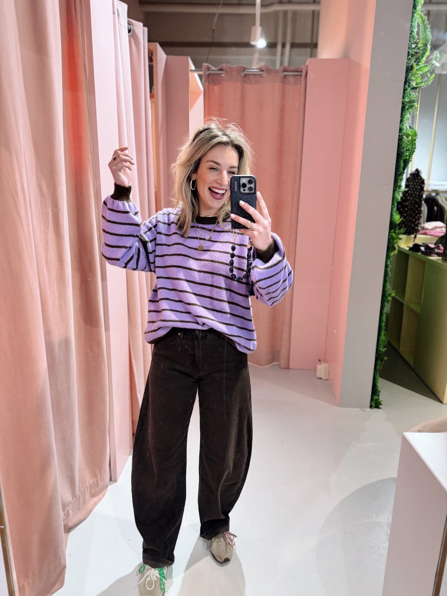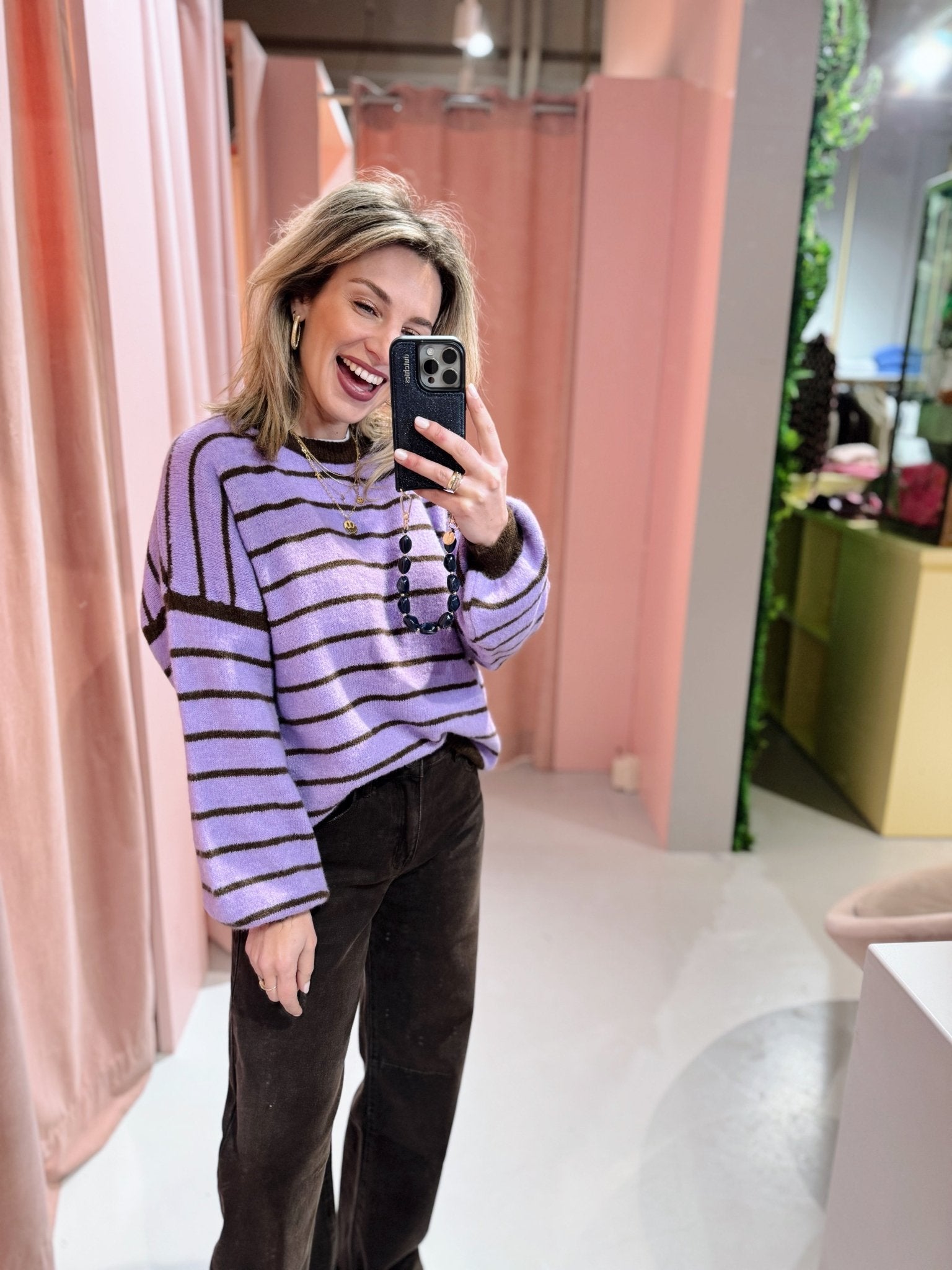 De Mila Knit in paars is een knit met een boxy model. De trui is gemaakt van een gebreid materiaal, heeft lange mouwen en een ronde halslijn. Doordat de trui voorzien is van een streep patroon, is het een leuke kleurrijke toevoeging aan je outfit!