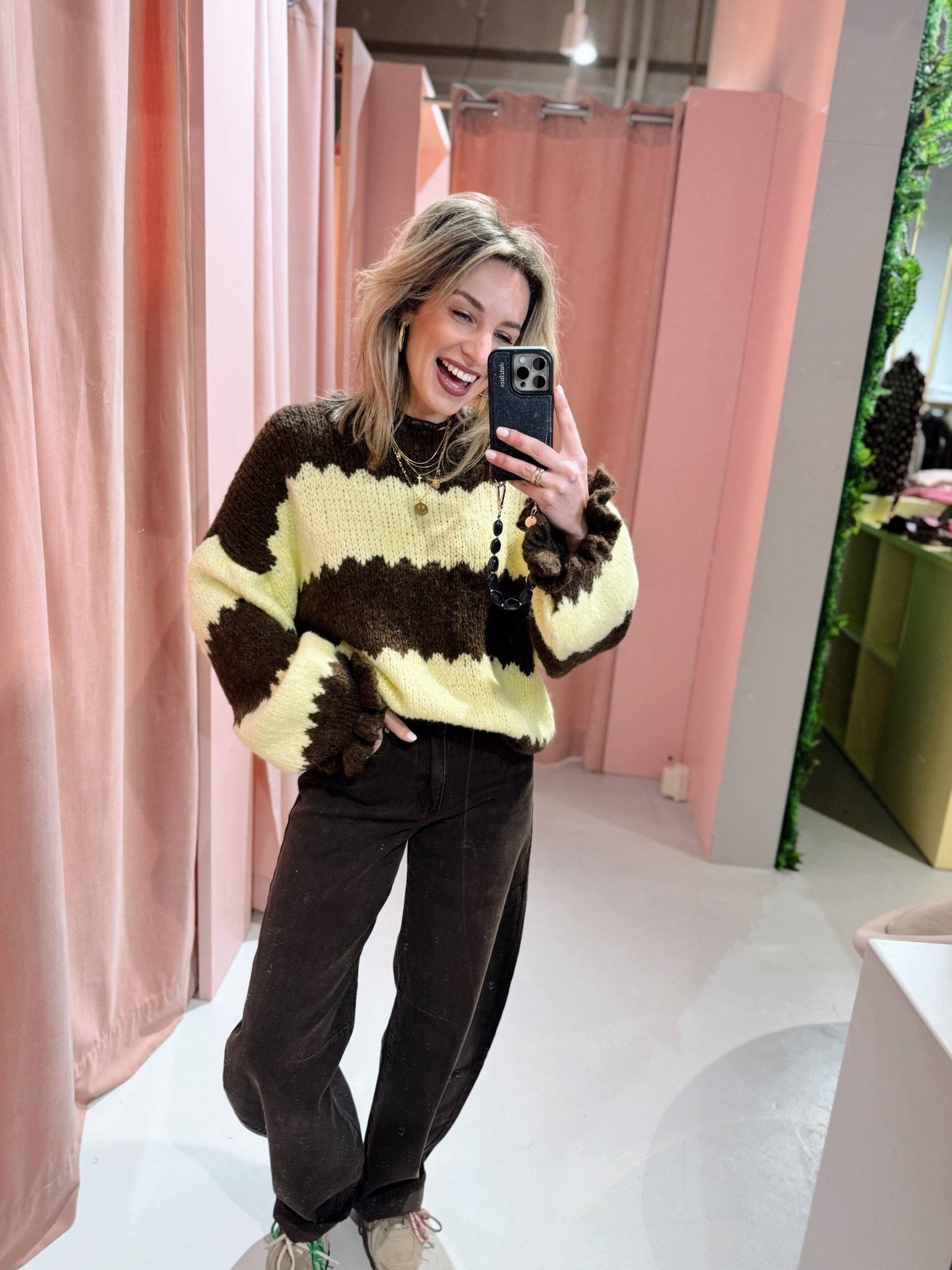 De Milly Knit in geel is een knit met een oversized model. De trui is gemaakt van een gebreid materiaal, heeft lange mouwen met ruches met een ronde halslijn. Doordat de trui voorzien is van een streep patroon, is het een leuke kleurrijke toevoeging aan je outfit!