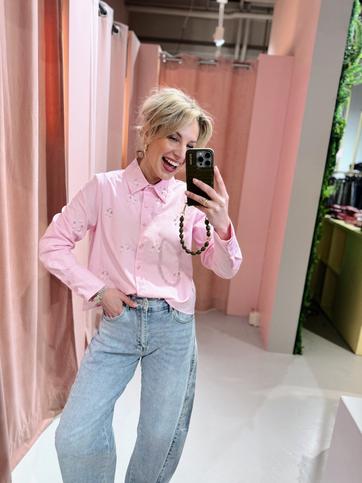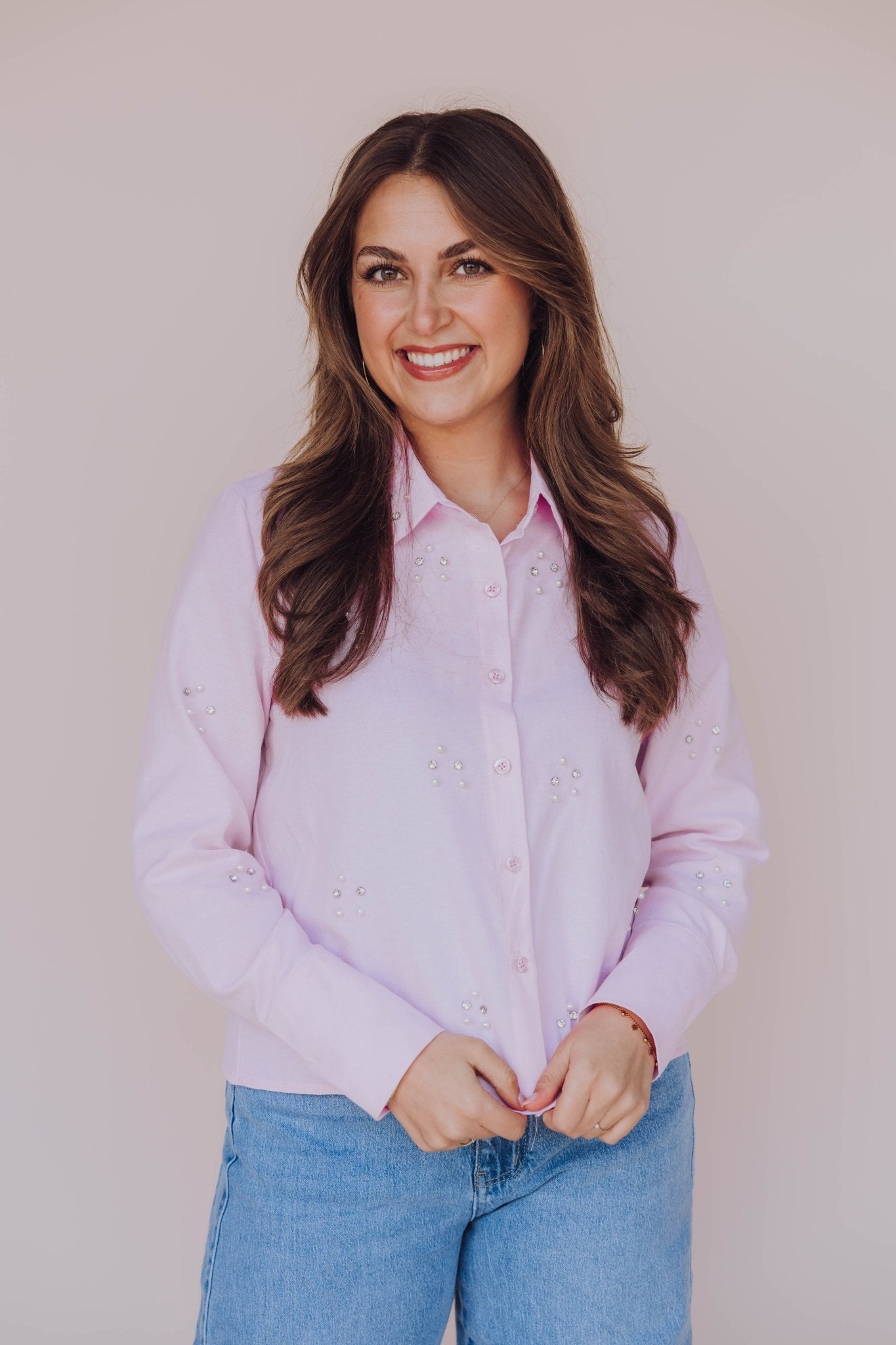 De Mira Blouse in roze is een kort blousje met een kraagje en een knoopsluiting aan de voorkant. De blouse is voorzien van parels en diamantjes, wat hem een leuke touch geeft.
