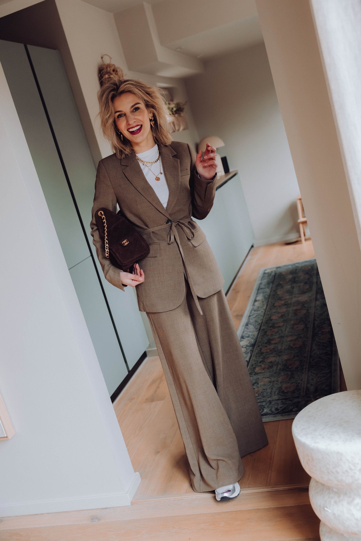 Deze broek heeft een mooie wide leg fit met een hoge taille en rechte pijpen. De stof voelt stevig maar soepel aan en geeft de broek een nette, rustige uitstraling. De voorkant is clean afgewerkt, terwijl de riemlussen en achterzakken zorgen voor een klassiek detail. De pasvorm is los en comfortabel, waardoor de broek fijn draagt en mooi valt. De bruine melange kleur is warm en makkelijk te combineren met zowel lichte als donkere items. Een fijne broek die er verzorgd uitziet, maar toch relaxed aanvoelt en die je er elke dag zo bij pakt.