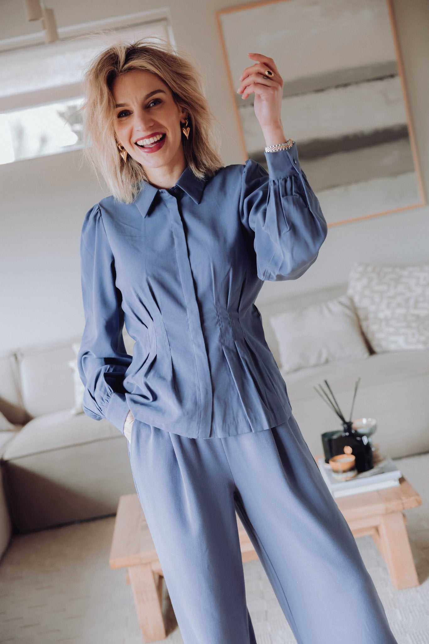 Dit blauwe blouse shirt heeft een nette uitstraling met een vrouwelijke vorm. De blouse heeft een klassieke kraag en een blinde knoopsluiting aan de voorkant, waardoor de look clean blijft. De taille is licht gevormd en sluit mooi aan, terwijl er bij de schouders subtiel volume zit voor een fijne pasvorm. De lange mouwen zijn afgewerkt met manchetten en vallen soepel langs de armen. De stof voelt licht en zacht aan en draagt prettig gedurende de dag. Door de egale blauwe kleur is deze blouse makkelijk te combineren.