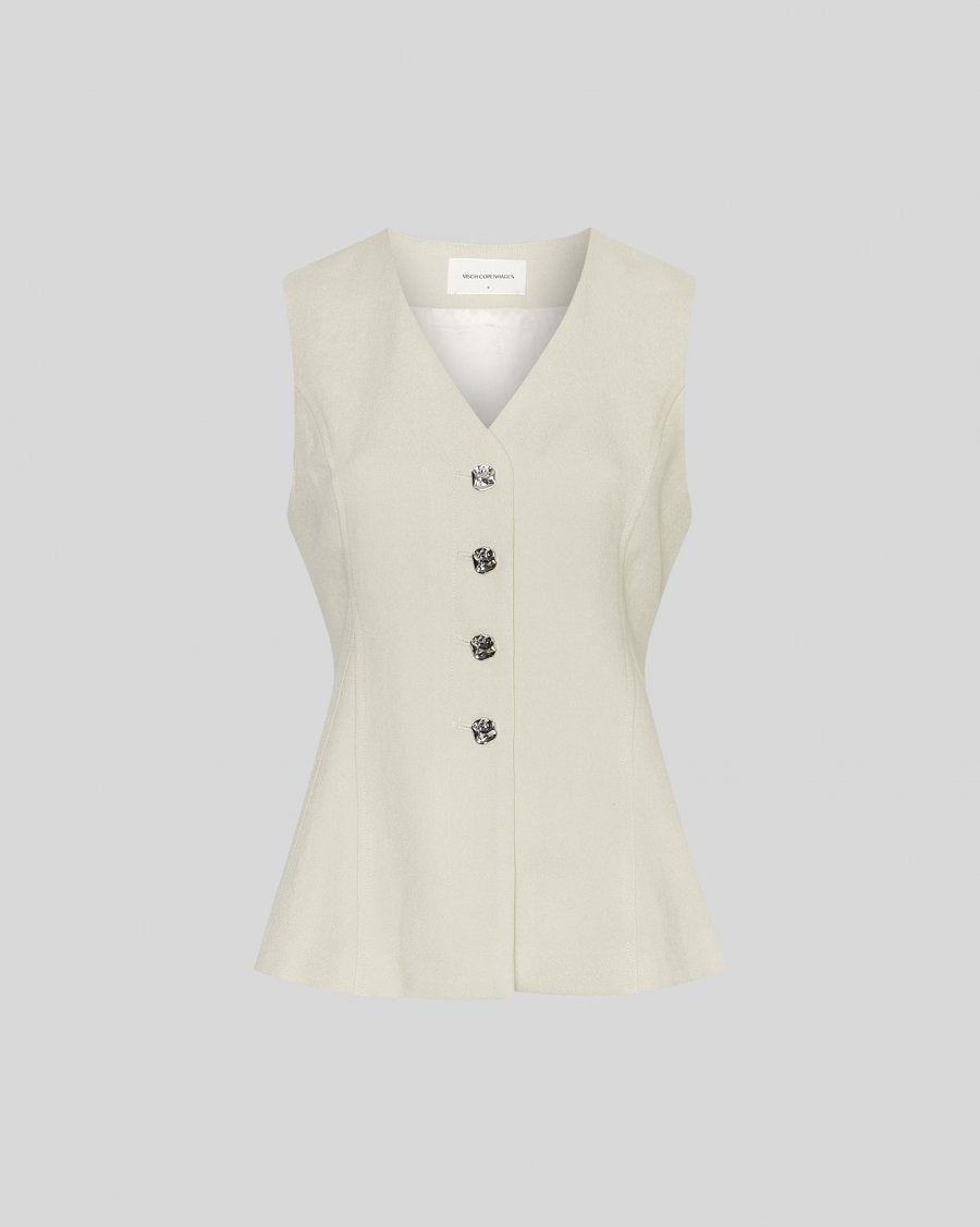 Aan de voorkant sluit het gilet met opvallende sierknopen die zorgen voor een luxe detail. De lichte oatmeal melange kleur maakt het een tijdloos item dat je makkelijk combineert. Draag hem chic met de bijpassende pantalon of juist casual met een jeans en sneakers.