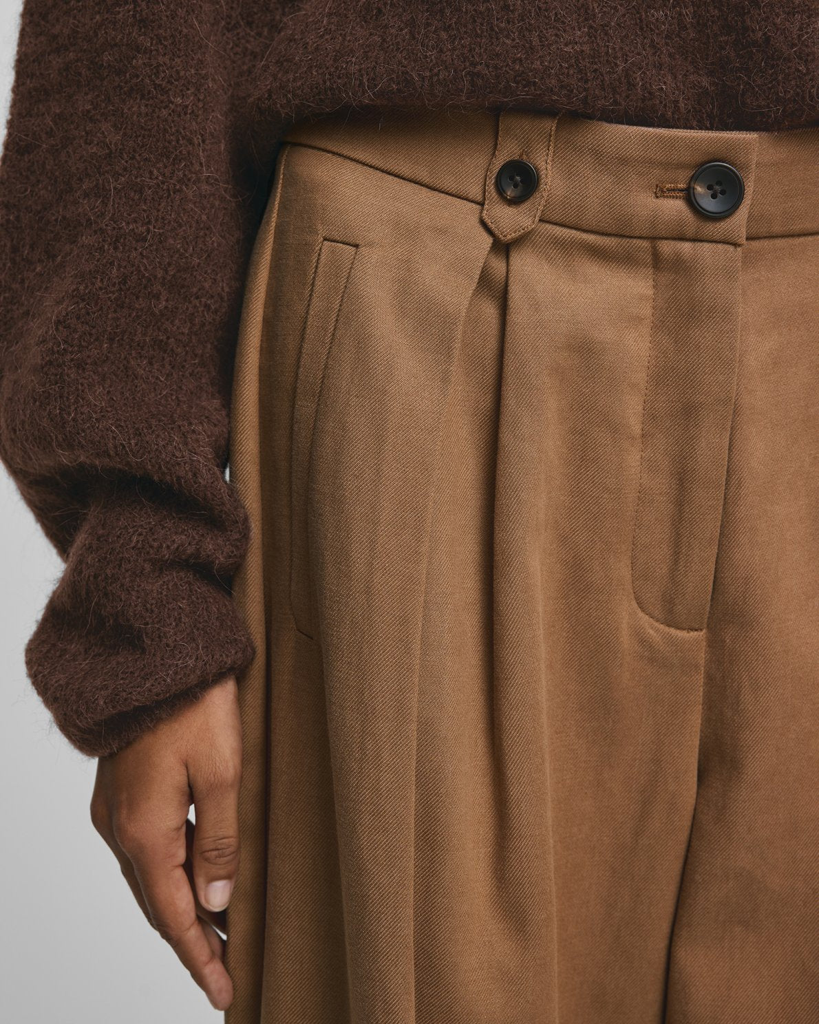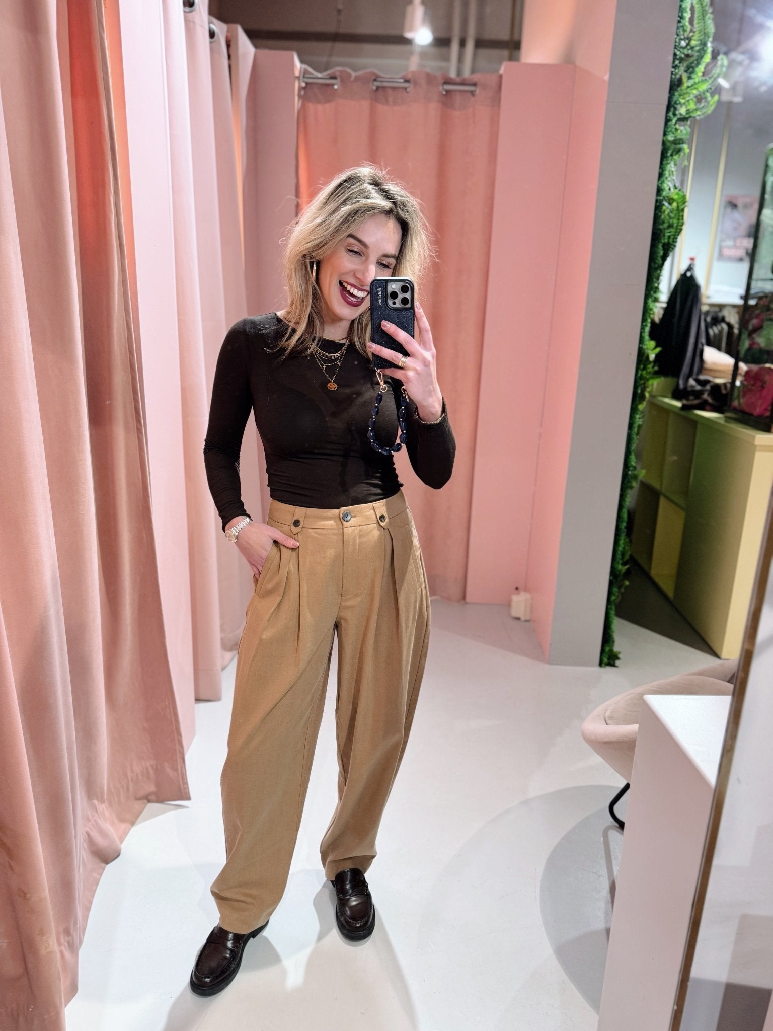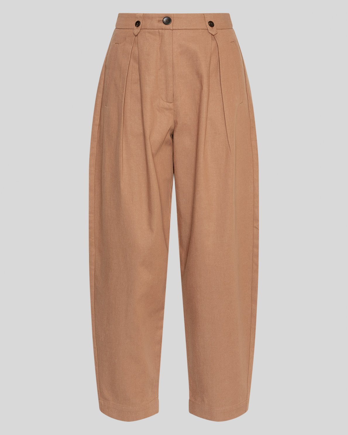 DeMSCHGweneth HW Pants is een geweven broek met een comfortabele, losse pasvorm en een modern barrel-leg silhouet. De broek heeft een hoge taille, plooien aan de voorkant en elastische inzetstukken aan de zijkant, waardoor hij mooi aansluit zonder strak te zitten. Aan de achterkant vind je twee paspelzakken met klep en knoop, wat de broek een nette, stijlvolle uitstraling geeft. De pantalon sluit met een knoop en rits en is afgewerkt met riemlusjes, waardoor je hem ook makkelijk kunt combineren met een ceintuur. De lengte valt tot aan de enkel en het lichte bruin maakt ‘m ideaal voor zowel casual als nette looks.