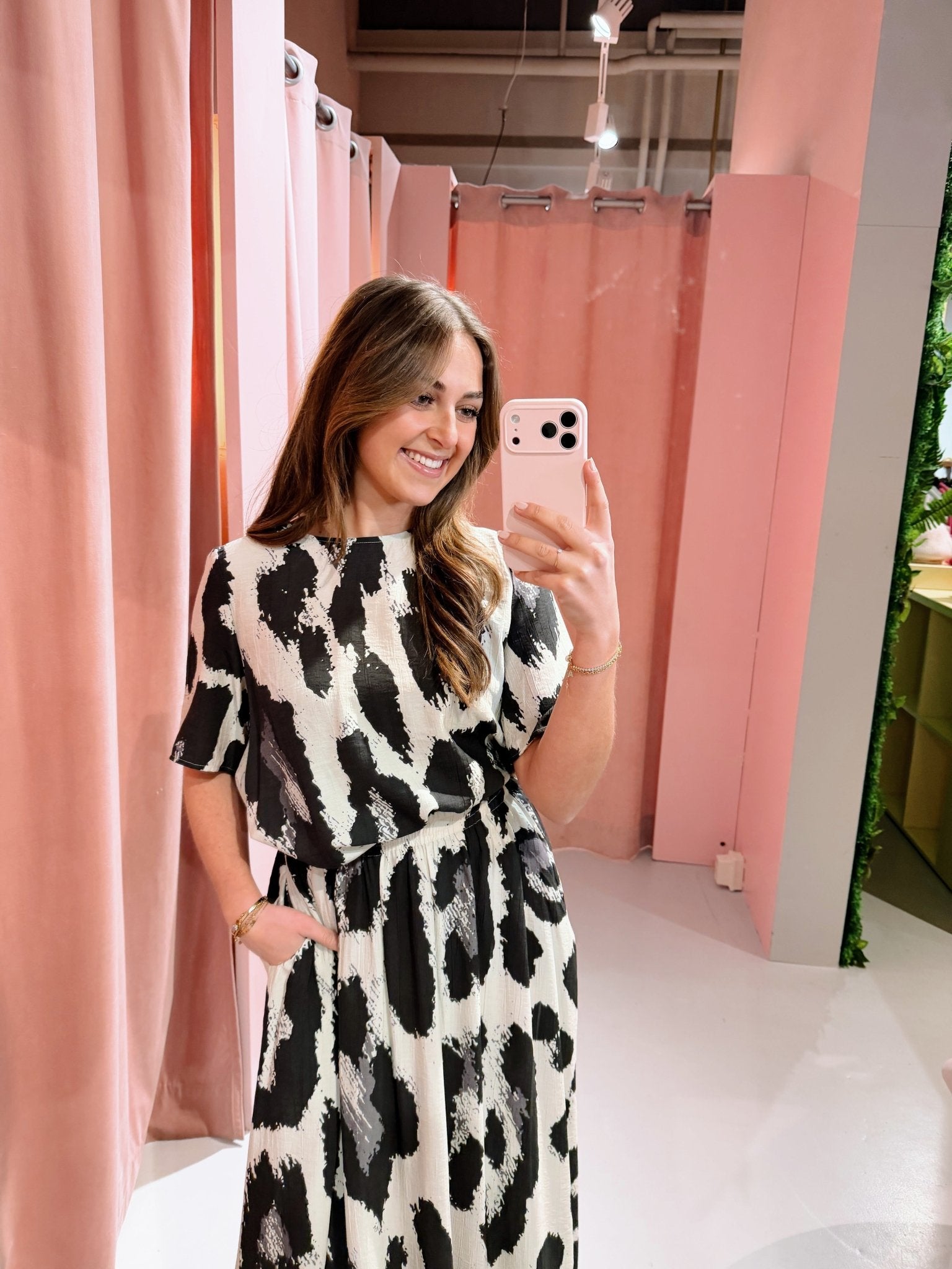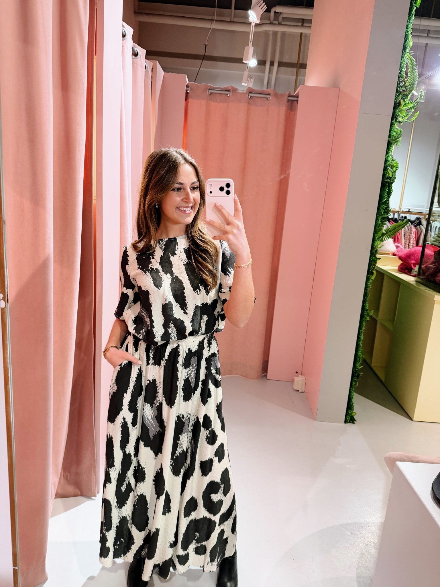 Deze lange rok heeft een opvallende leopard print en een mooie, soepele valling. De lichte stof beweegt fijn mee en draagt lekker comfortabel. Dankzij de elastische tailleband zit de rok relaxed en trek je ’m makkelijk aan. De lengte zorgt voor een vrouwelijke look die je zowel casual als netter kunt dragen. Perfect voor elke dag, maar ook leuk voor een etentje of dagje weg.