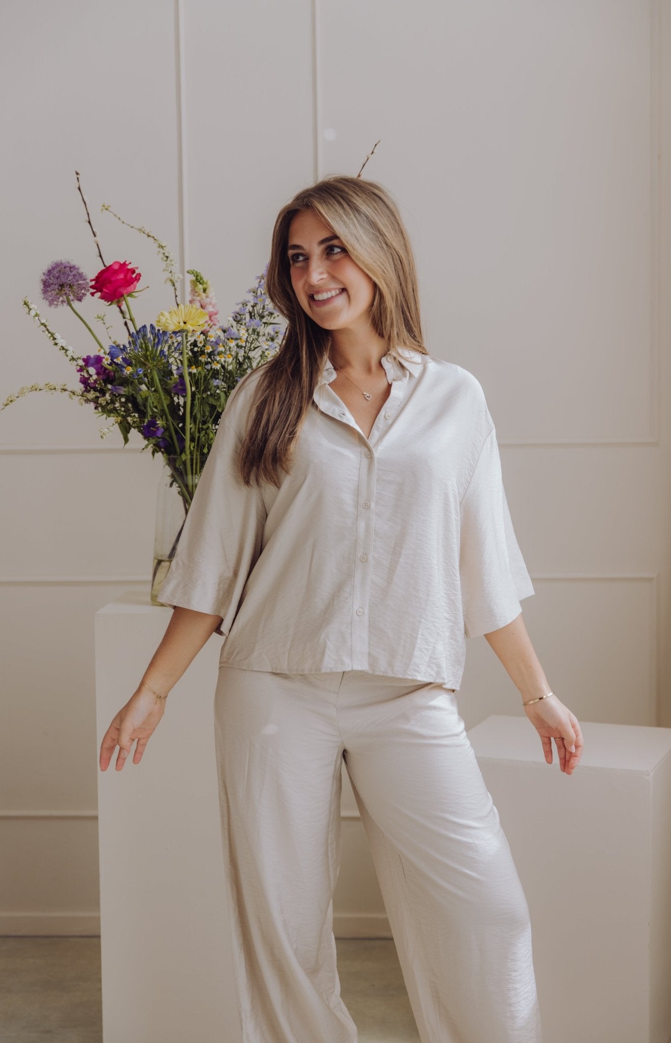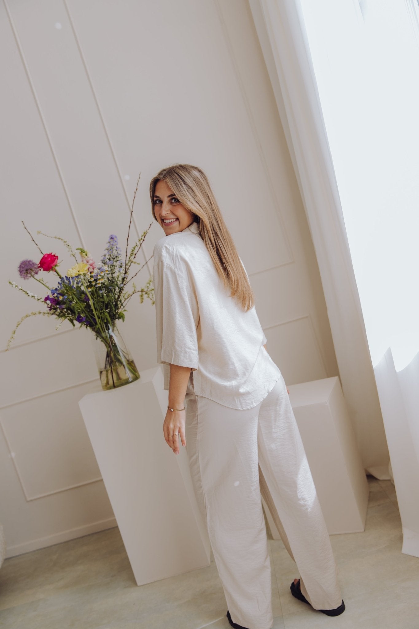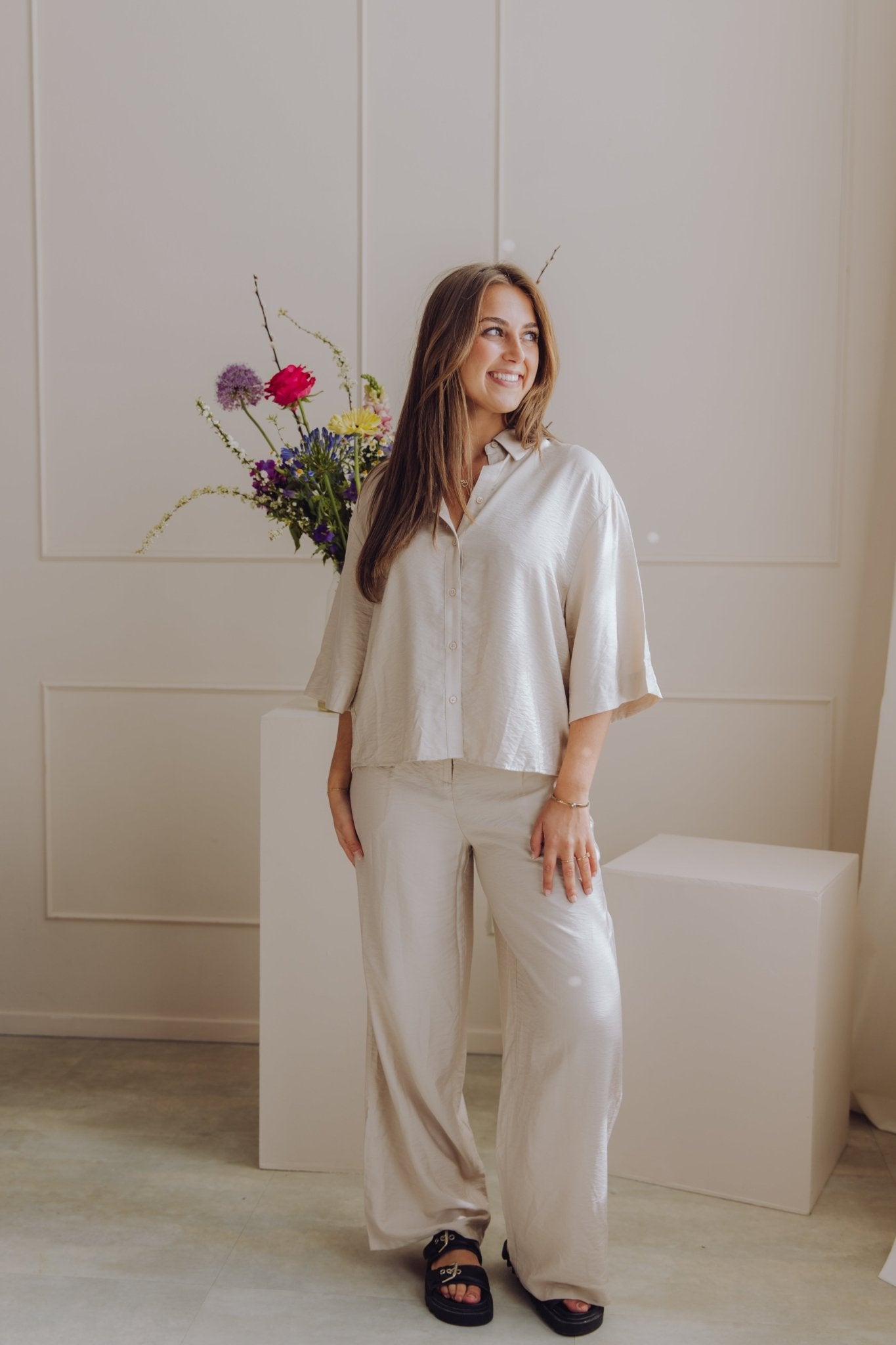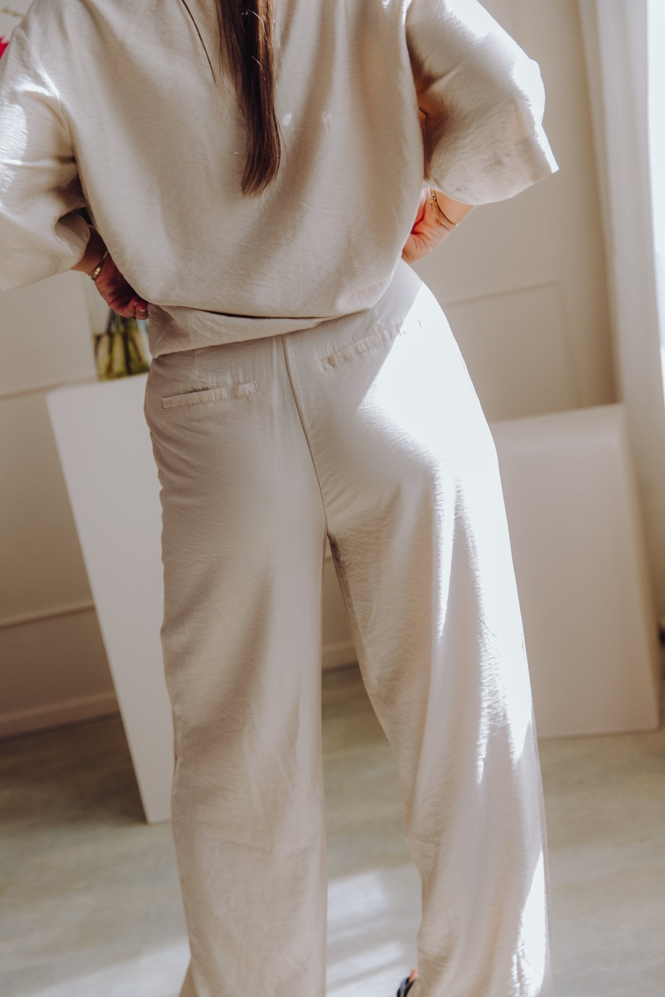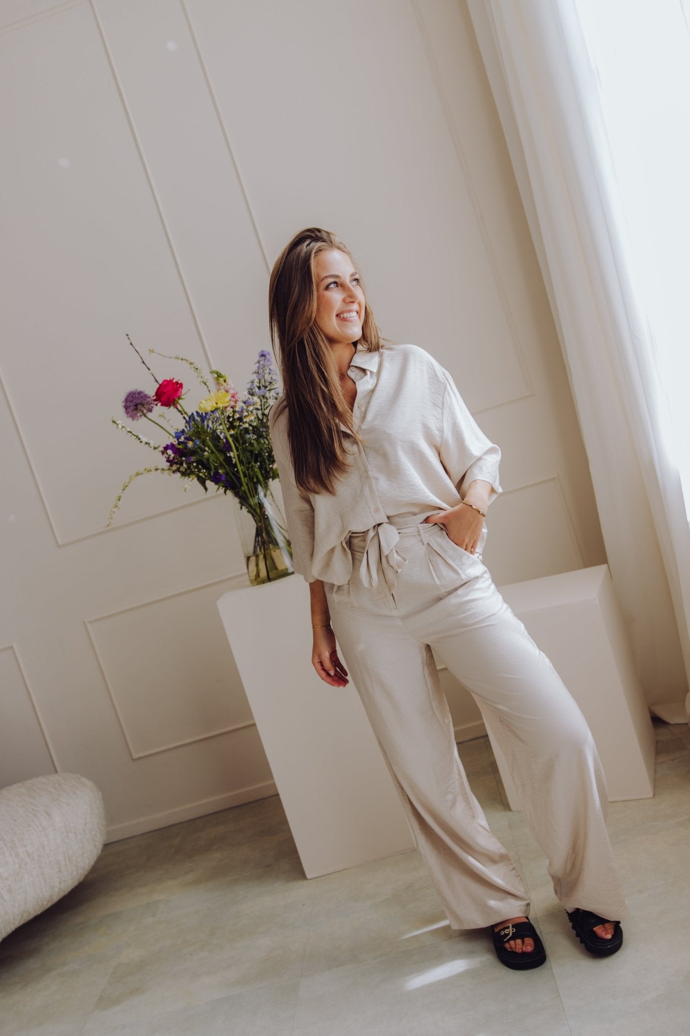 De MSCHNyla Amabella Pants is een fijne broek met een wide leg model. De broek is voorzien van een schuif knoopsluiting en heeft als detail een ceintuur in dezelfde stof. Daarnaast heeft de broek twee steekzakken en twee nep zakken aan de achterkant. Combineer deze broek met het MSCHNyla Amabella 2/4 Shirt voor een complete set!