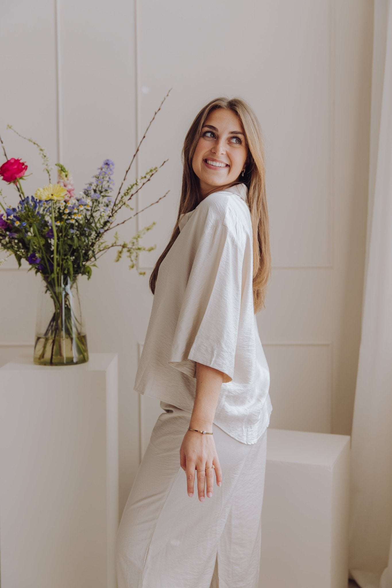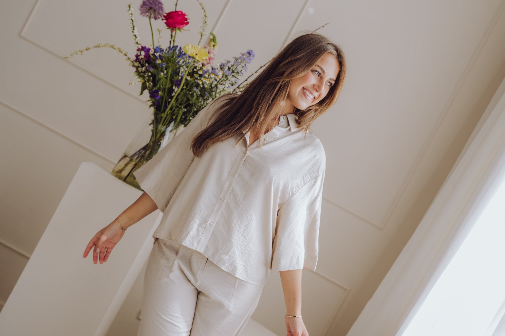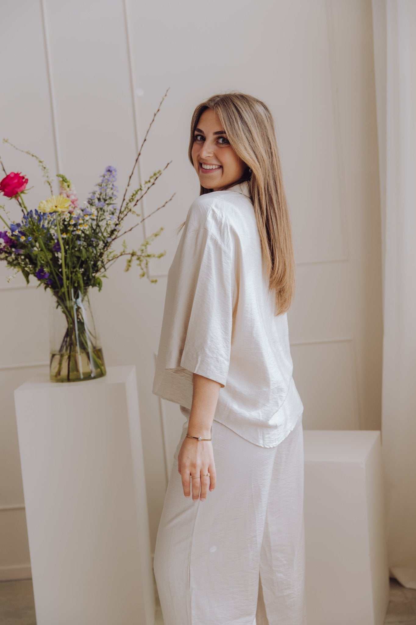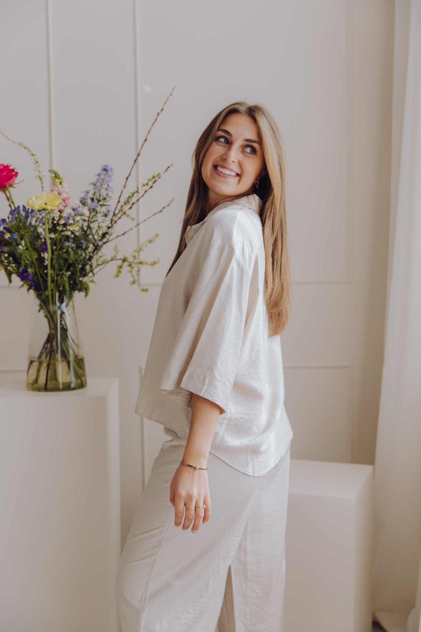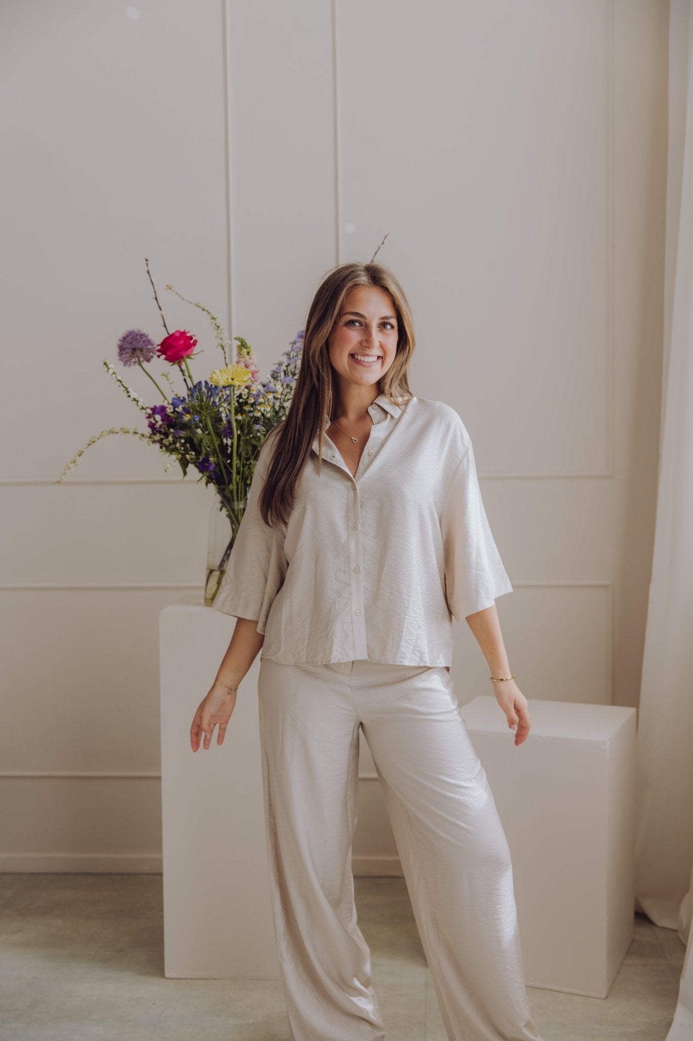 De MSCHNyla Amabella Pants is een fijne broek met een wide leg model. De broek is voorzien van een schuif knoopsluiting en heeft als detail een ceintuur in dezelfde stof. Daarnaast heeft de broek twee steekzakken en twee nep zakken aan de achterkant. Combineer deze broek met het MSCHNyla Amabella 2/4 Shirt voor een complete set!