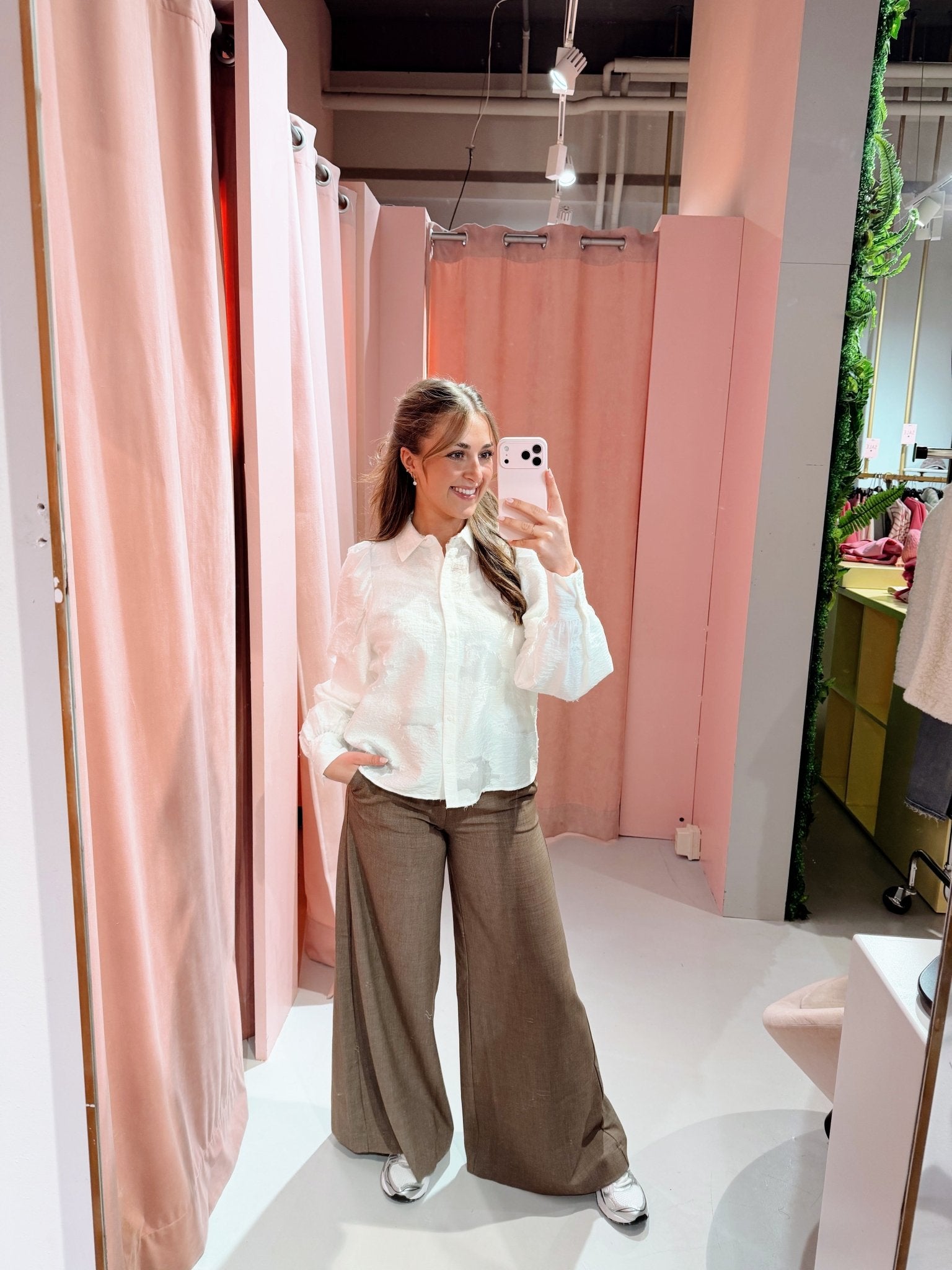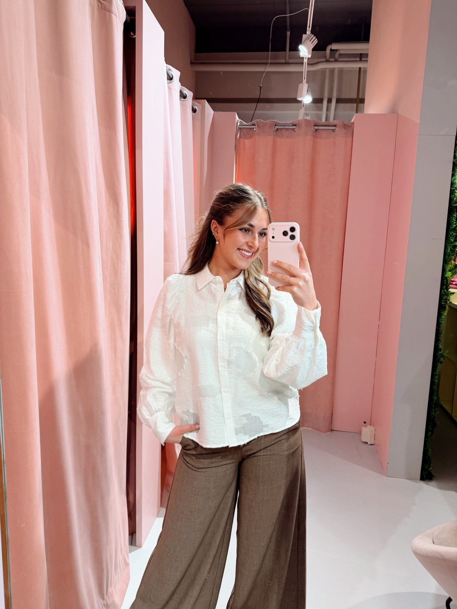 Deze blouse heeft een frisse en vrouwelijke uitstraling door de lichte stof en subtiele structuur in het materiaal. De stof valt soepel en voelt zacht aan, waardoor de blouse comfortabel draagt en mooi in vorm blijft. Het model heeft een klassieke kraag en een volledige knoopsluiting aan de voorkant. De lange mouwen zijn afgewerkt met manchetten, wat zorgt voor een nette en verzorgde look. De pasvorm is recht en niet te strak, waardoor de blouse makkelijk te dragen is voor elke dag, maar ook geschikt is voor momenten waarop je iets netter gekleed wilt zijn. Een fijn item dat rustig oogt, maar door de structuur toch net dat beetje extra heeft.