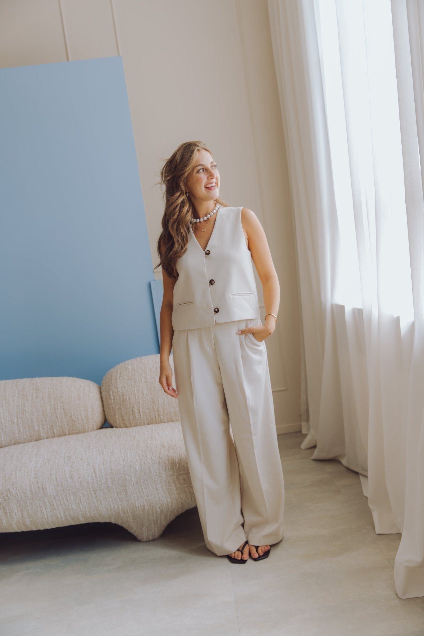 De MSCHRosina Michelle HW Pants is een stijlvolle pantalon met een hoge taille en een losvallende pasvorm. De broek is gemaakt van een lichte, soepelvallende stof met een lichte stretch. De pantalon is voorzien van plooien aan de voorzijde, een knoop- en ritssluiting, steekzakken en een zak met knoop aan de achterkant. De subtiele V-vormige uitsnede in de tailleband aan de achterzijde geeft de broek een luxe detail.