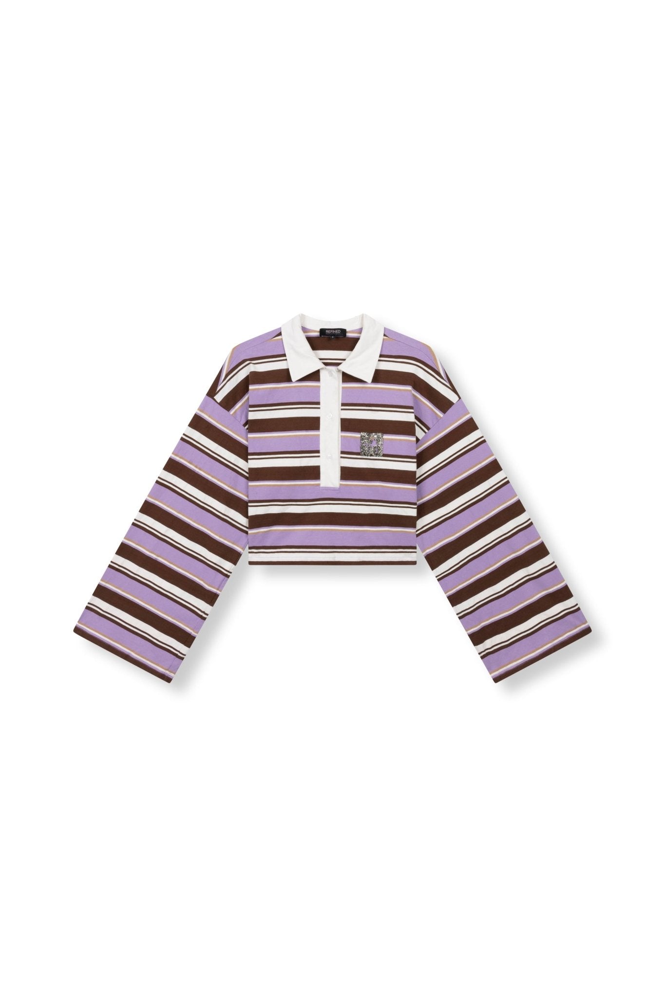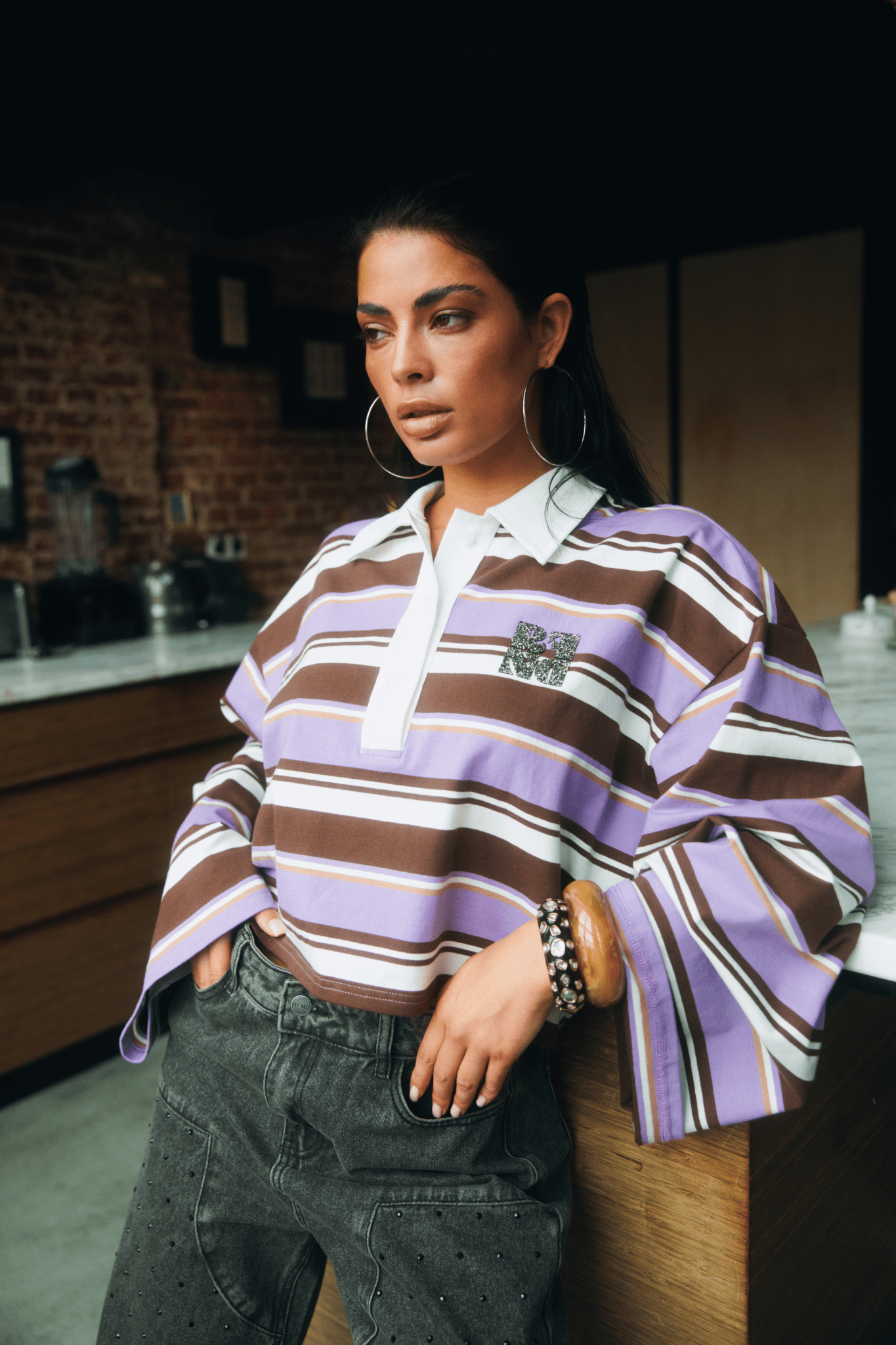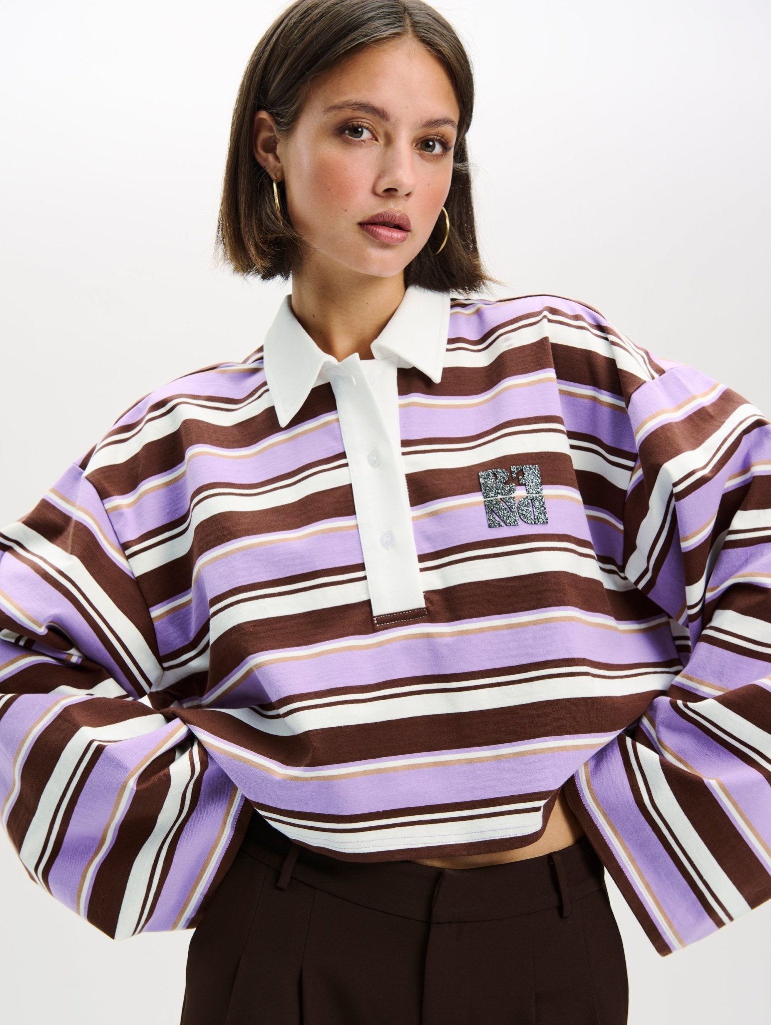 Deze gestreepte polo top heeft lange mouwen en een cropped pasvorm. Het ontwerp heeft een witte polokraag met knoopsluiting en is voorzien van een opvallende streepprint in bruin, paars en wit. Op de borst is een klein glitter detail toegevoegd dat de top een speelse finishing touch geeft. De wijde mouwen en korte lengte zorgen voor een unieke uitstraling.