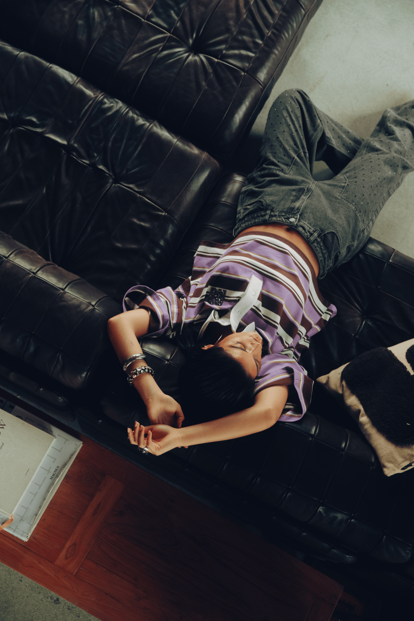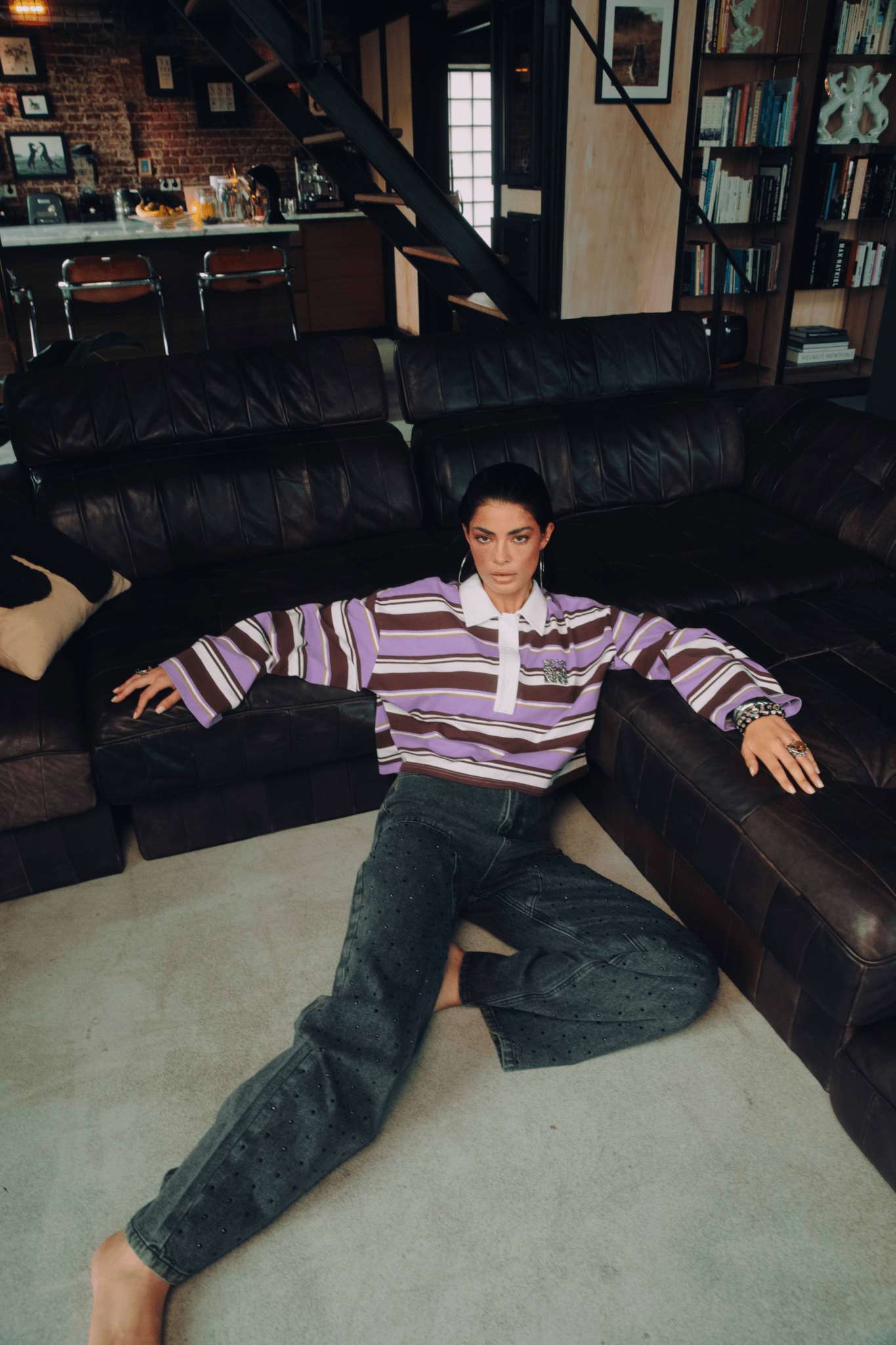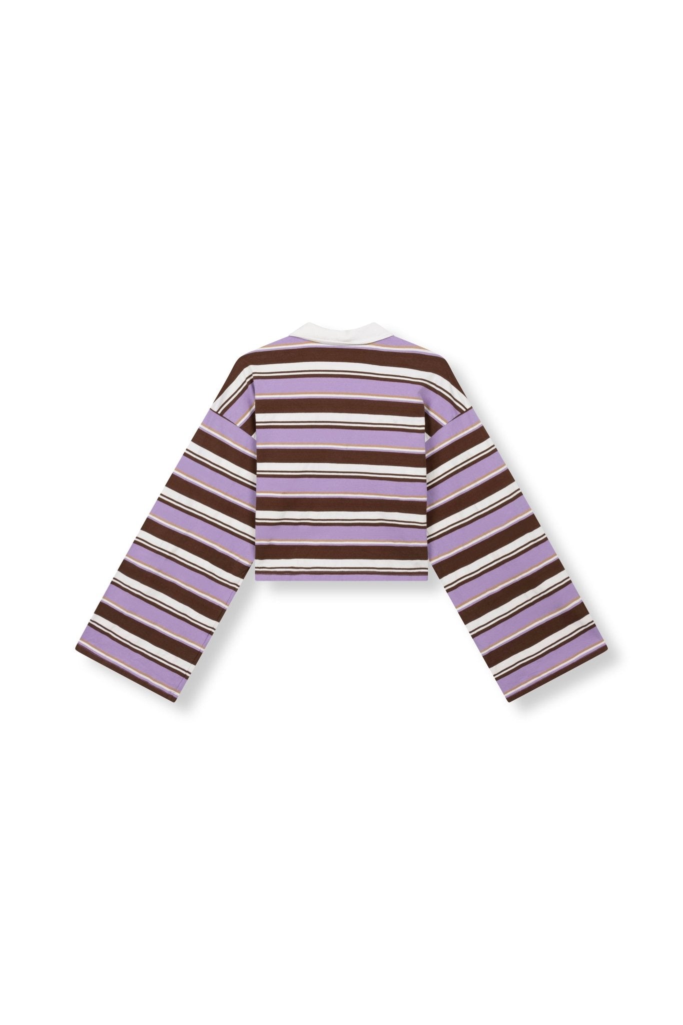 Deze gestreepte polo top heeft lange mouwen en een cropped pasvorm. Het ontwerp heeft een witte polokraag met knoopsluiting en is voorzien van een opvallende streepprint in bruin, paars en wit. Op de borst is een klein glitter detail toegevoegd dat de top een speelse finishing touch geeft. De wijde mouwen en korte lengte zorgen voor een unieke uitstraling.