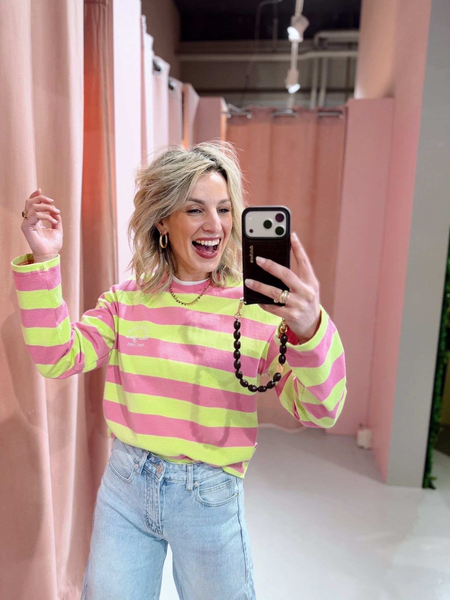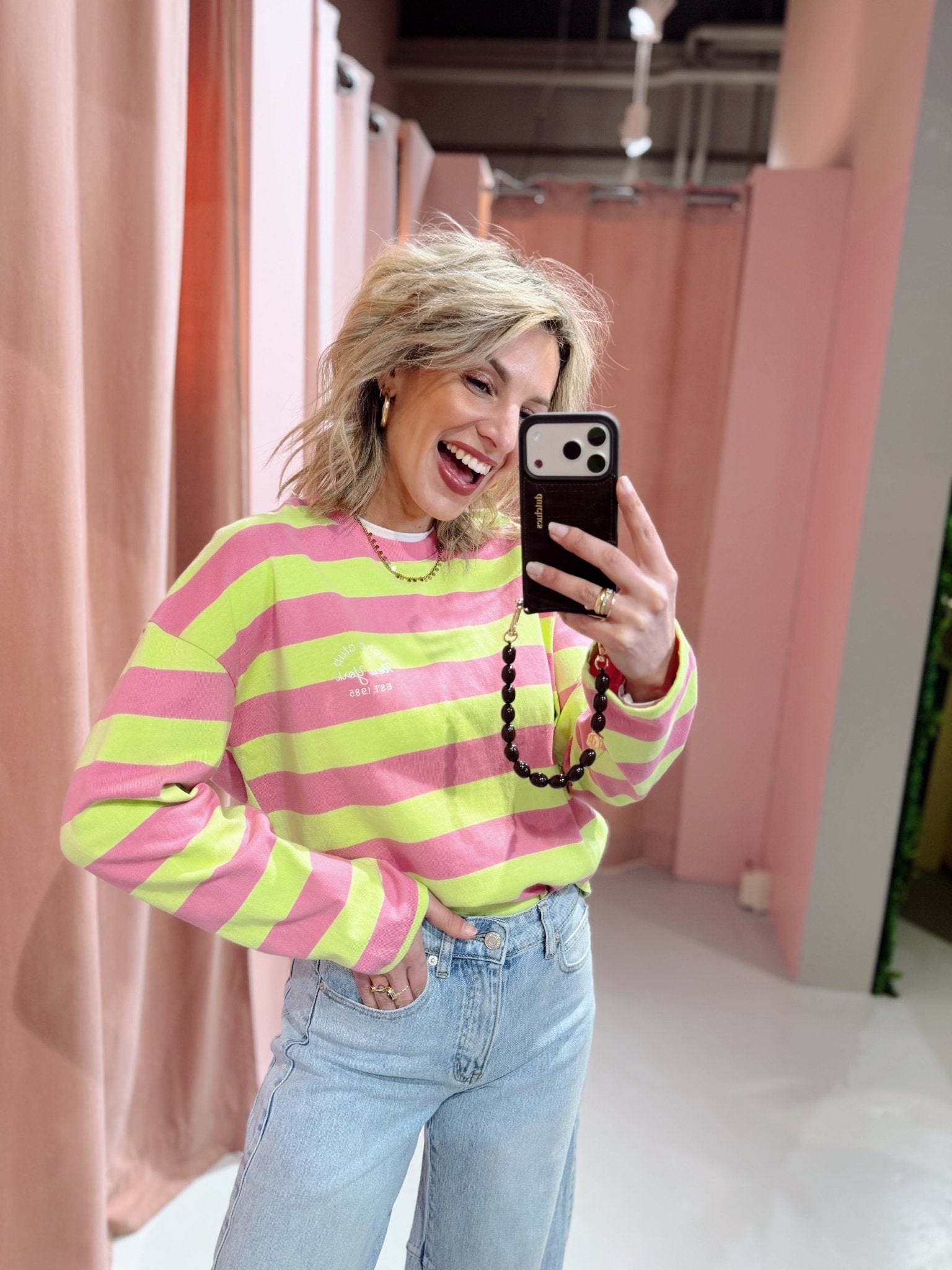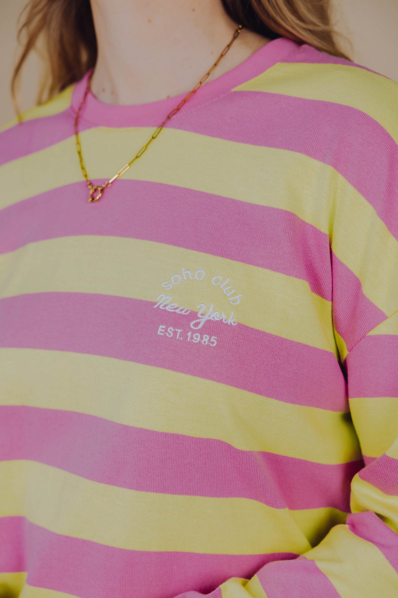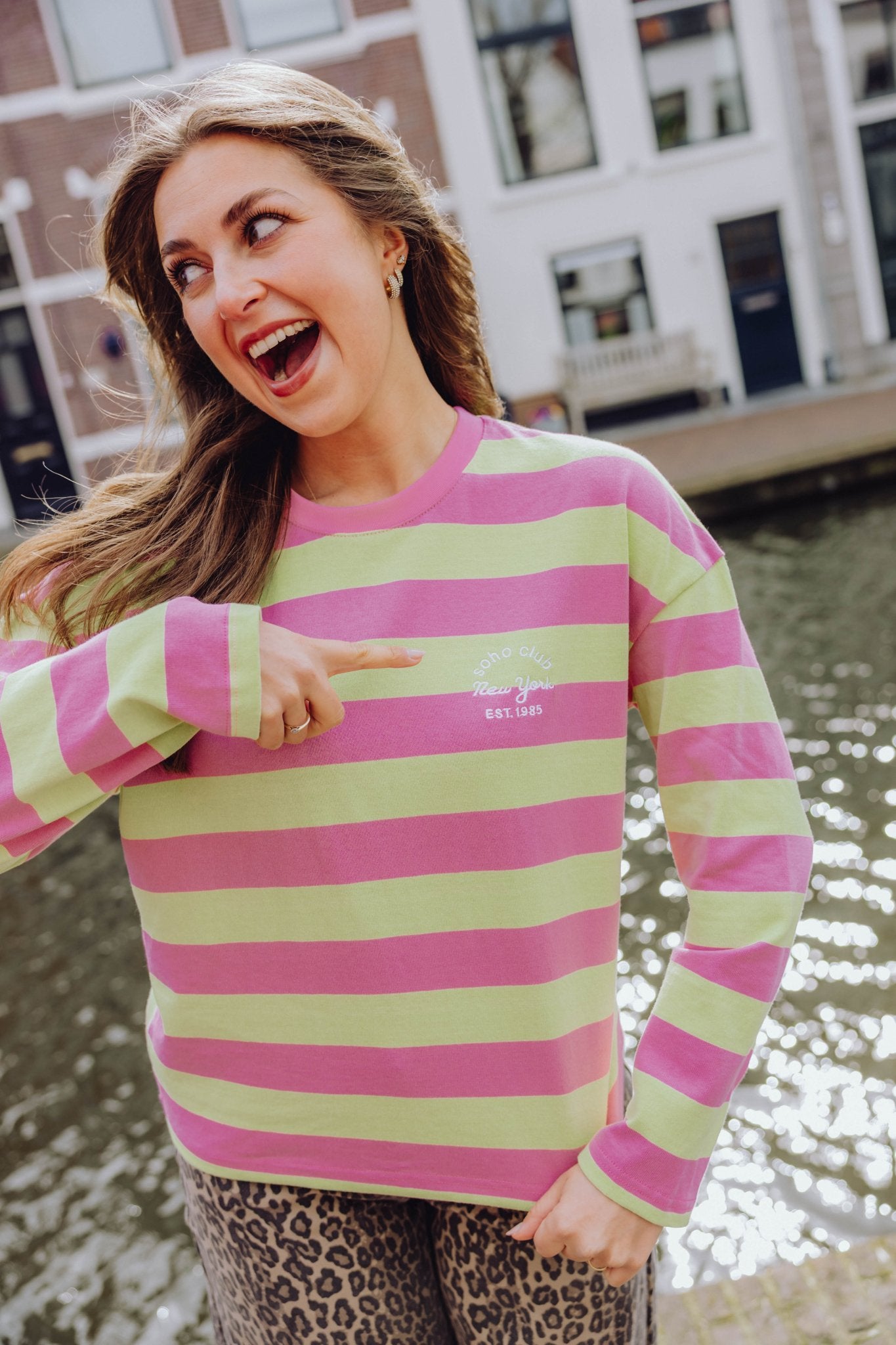De Nance Longsleeve in roze met lime is een top met een iets wijder model. De top is gemaakt van een katoenen stof, heeft lange mouwen met een hoge, ronde halslijn en een streep patroon. Op de borst is de top voorzien van een geborduurde tekst. Deze lange mouwen top is perfect om laagjes mee te creëren!