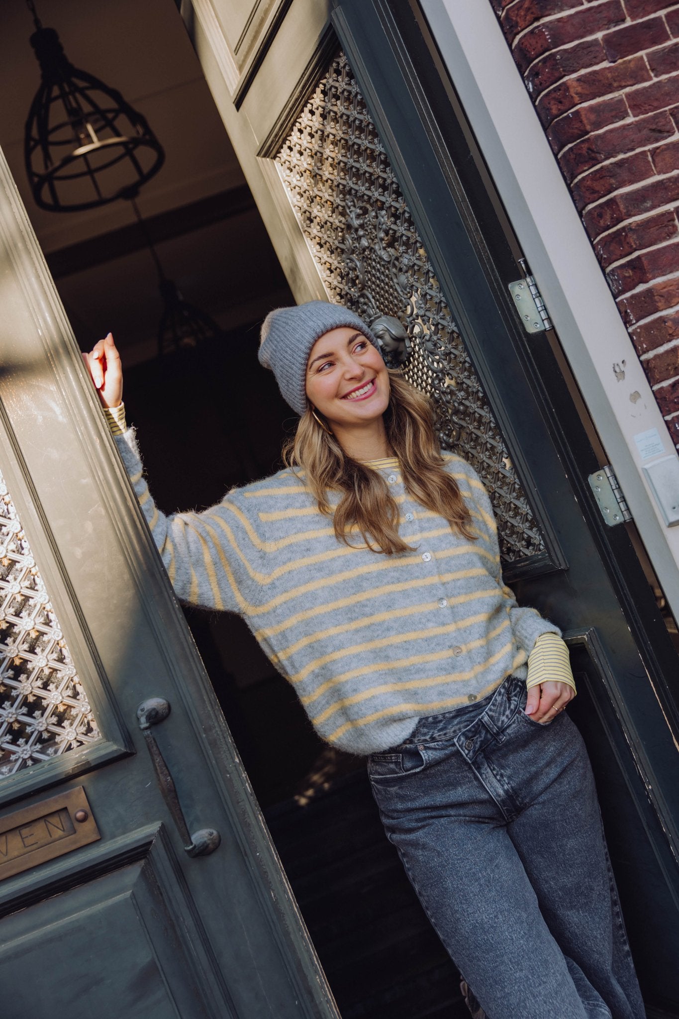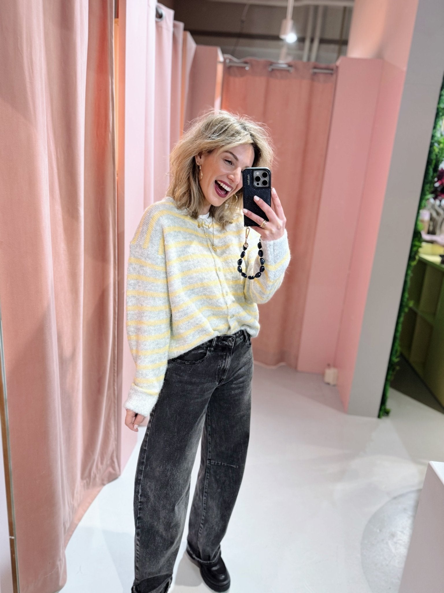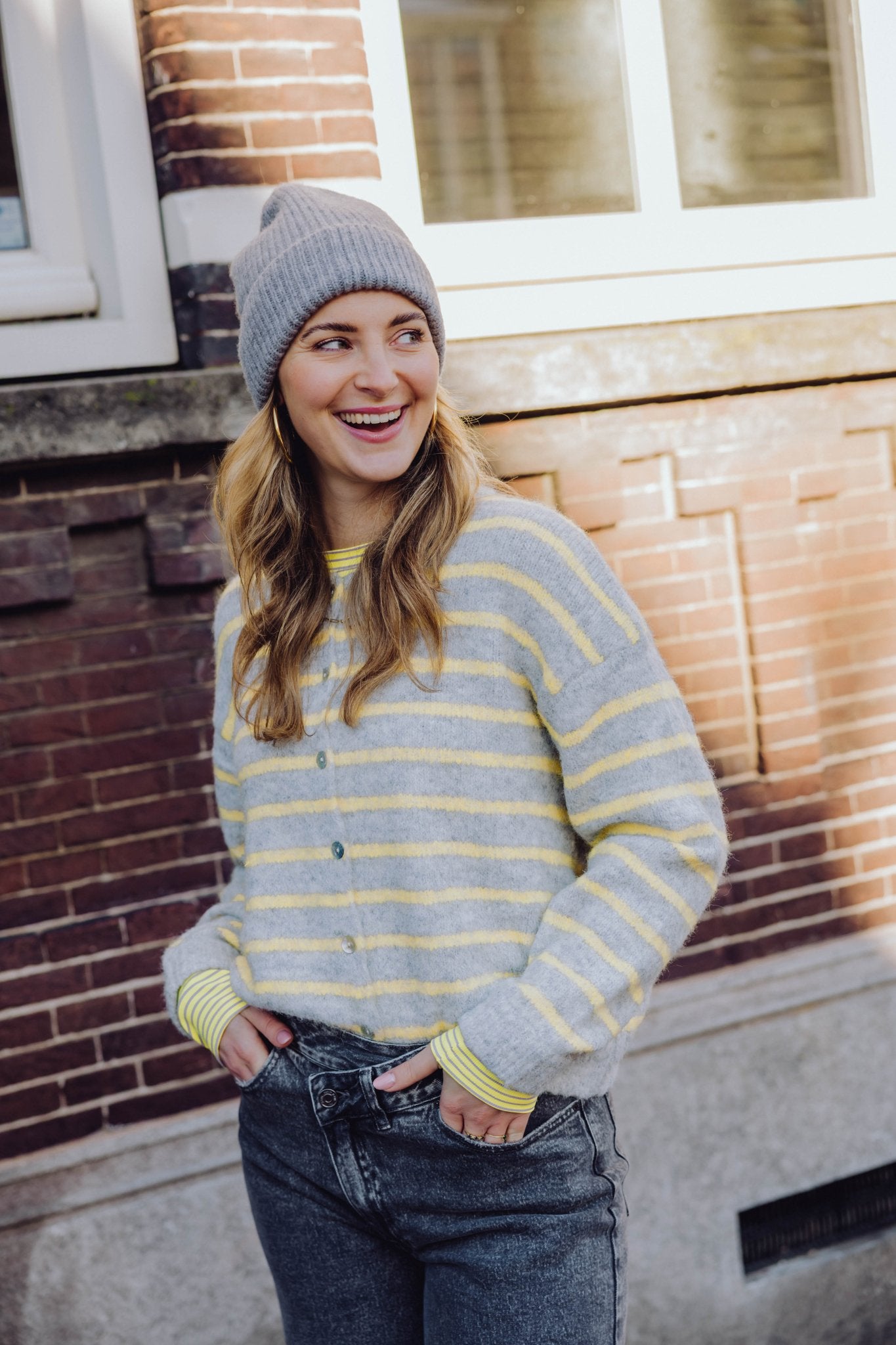De Naomi Cardigan in grijs heeft een boxy oversized fit en is gemaakt van een zachte, gebreide stof. Het vest heeft lange mouwen, een ronde hals en holografische knoopjes. Doordat dit vestje voorzien is van een geel streep patroon, maakt hij je outfit meteen lekker vrolijk! Ideaal om te dragen in laagjes met het koude weer!
