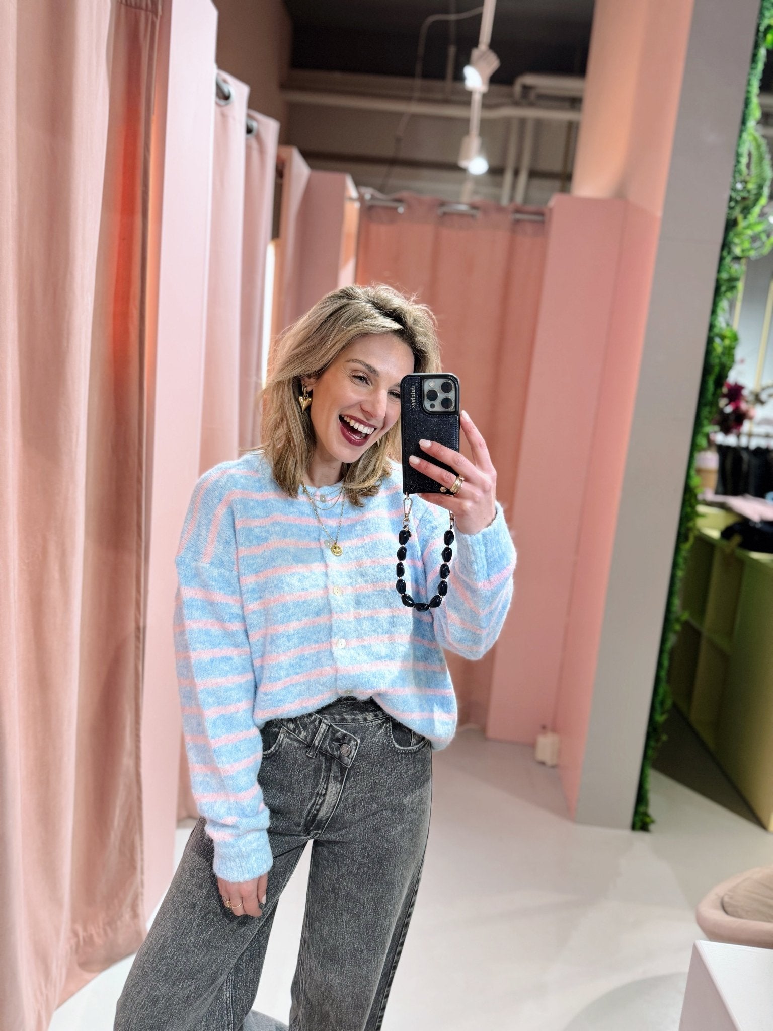 De Naomi Cardigan in lichtblauw heeft een boxy oversized fit en is gemaakt van een zachte, gebreide stof. Het vest heeft lange mouwen, een ronde hals en holografische knoopjes. Doordat dit vestje voorzien is van een roze streep patroon, maakt hij je outfit meteen lekker vrolijk! Ideaal om te dragen in laagjes met het koude weer!