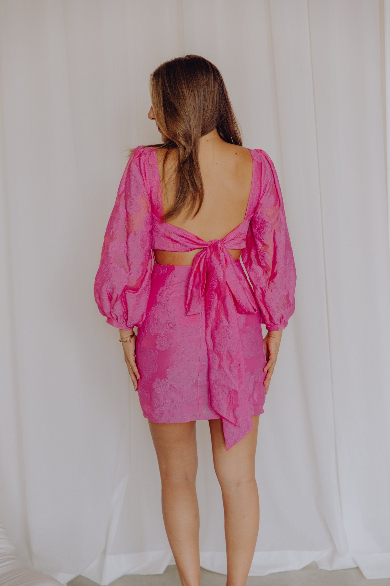 De Nayeli Dress is een korte jurk met pofmouwen, gemaakt van een transparante stof met all-over bloemenborduursel. De taille is subtiel getailleerd voor een vrouwelijke shape en de open rug met strikdetail maakt de jurk extra bijzonder. Perfect voor zonnige dagen, feestjes of wanneer je gewoon zin hebt in iets speciaals.