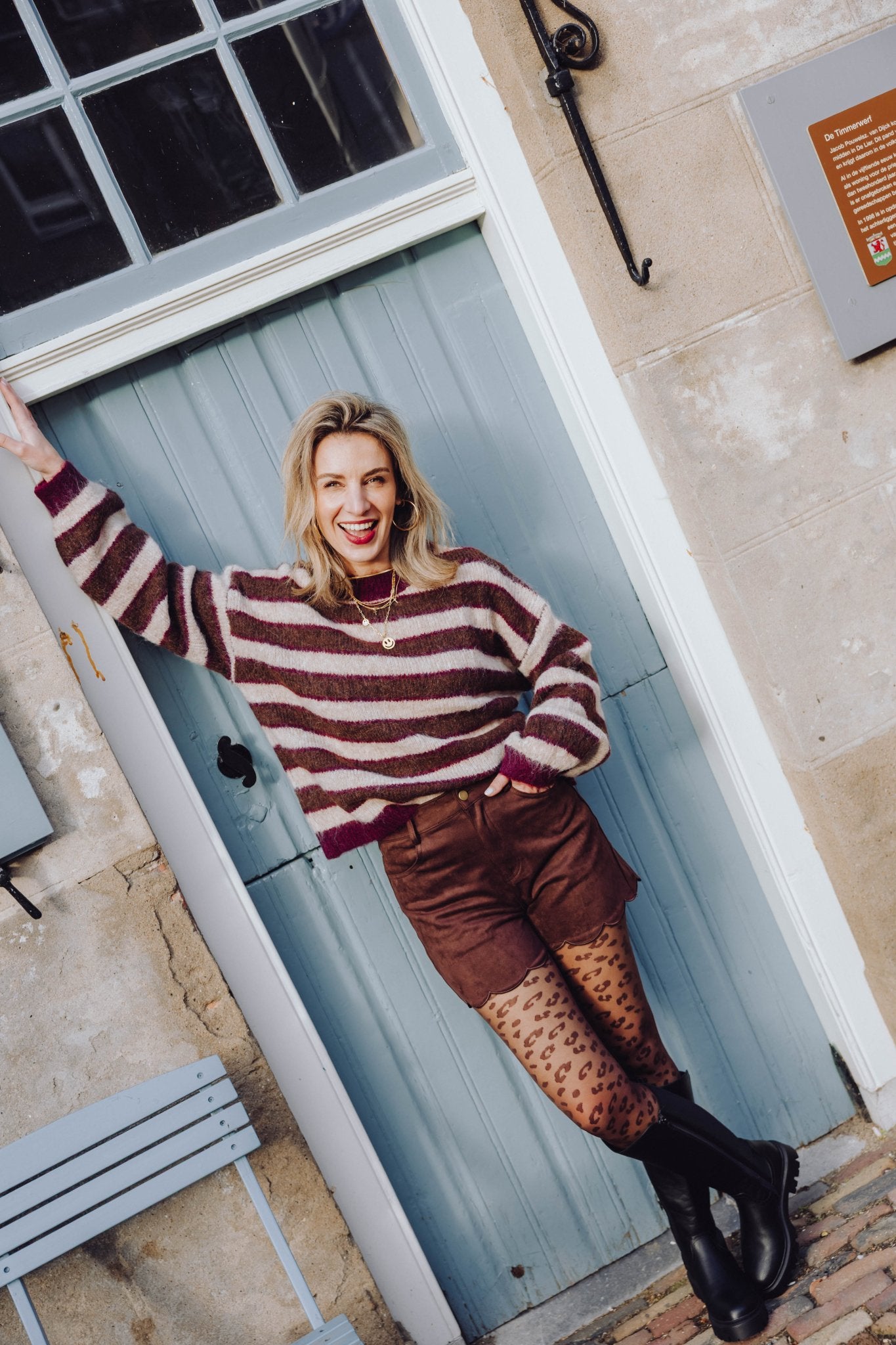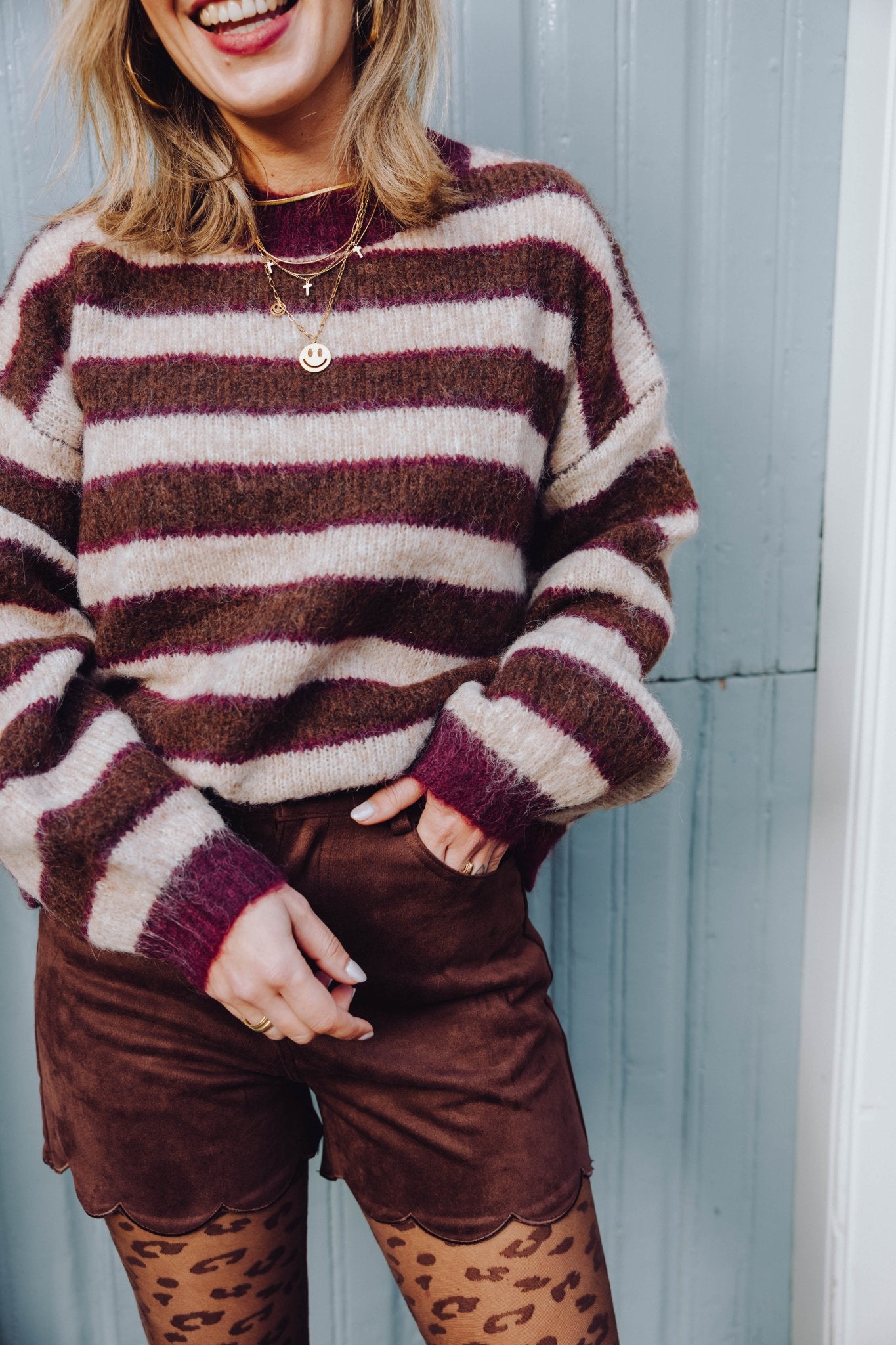 De Noah Knit in bordeaux is een knit met een oversized model. De trui is gemaakt van een gebreid materiaal, heeft lange mouwen en een ronde halslijn. Doordat de trui voorzien is van een streep patroon, is het een leuke kleurrijke toevoeging aan je outfit!