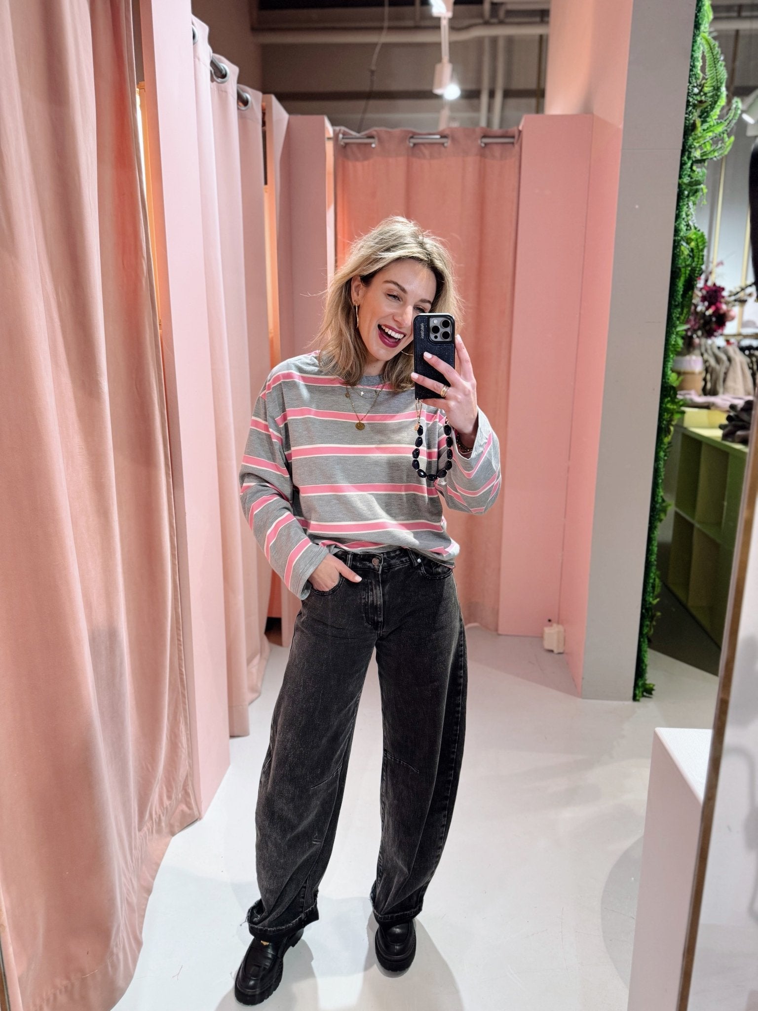 De Oana Longsleeve in grijs met roze is een top met een iets wijder model. De top is gemaakt van een stretchy stof, heeft lange mouwen met een hoge, ronde halslijn en een streep patroon. Deze lange mouwen top is perfect om laagjes mee te creëren in het najaar.