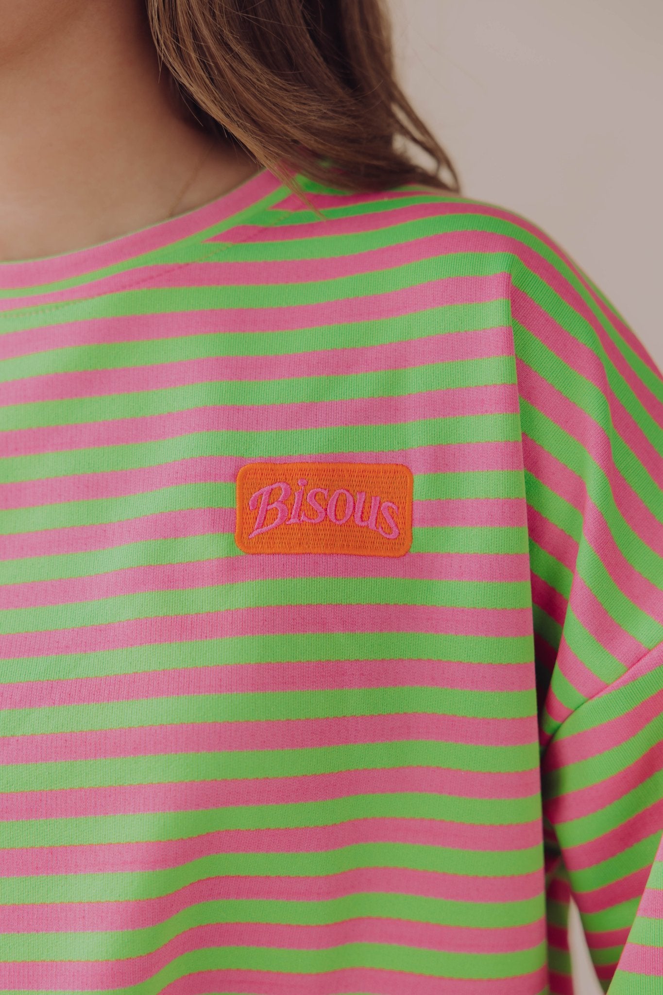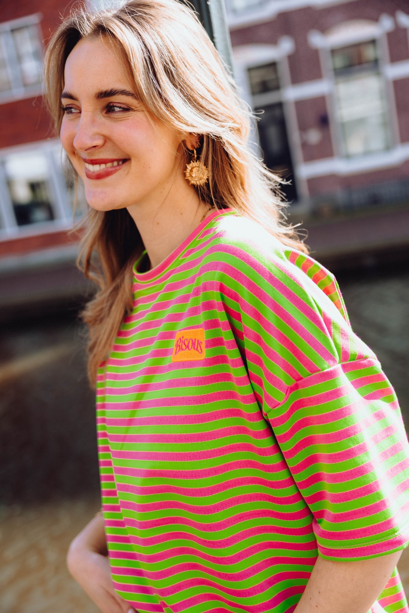 De Odette Tee in groen met roze is een top met een iets wijder model. De top is gemaakt van stevige stof, heeft korte mouwen met een hoge, ronde halslijn en een streep patroon. Deze korte mouwen top is perfect voor het komende seizoen! Ook heeft deze tee een kleurrijke patch op de borst.