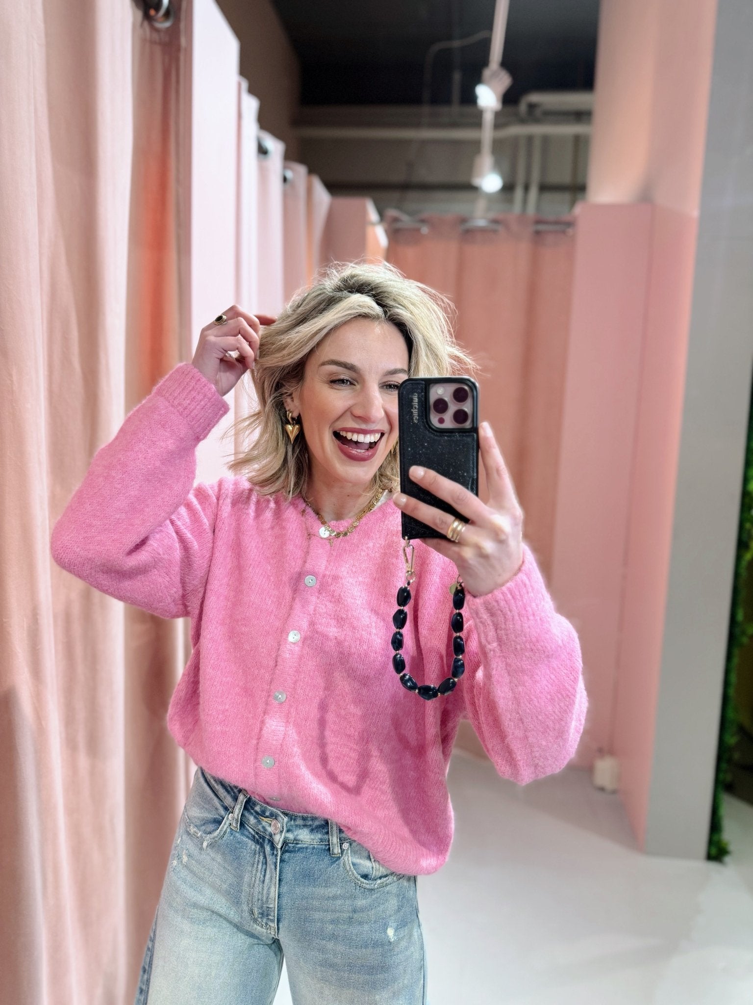 De Olly Cardigan in roze heeft een boxy oversized fit en is gemaakt van een zachte, gebreide stof. Het vest heeft lange mouwen, een ronde hals en holografische knoopjes. Ideaal om te dragen in laagjes met het koude weer!