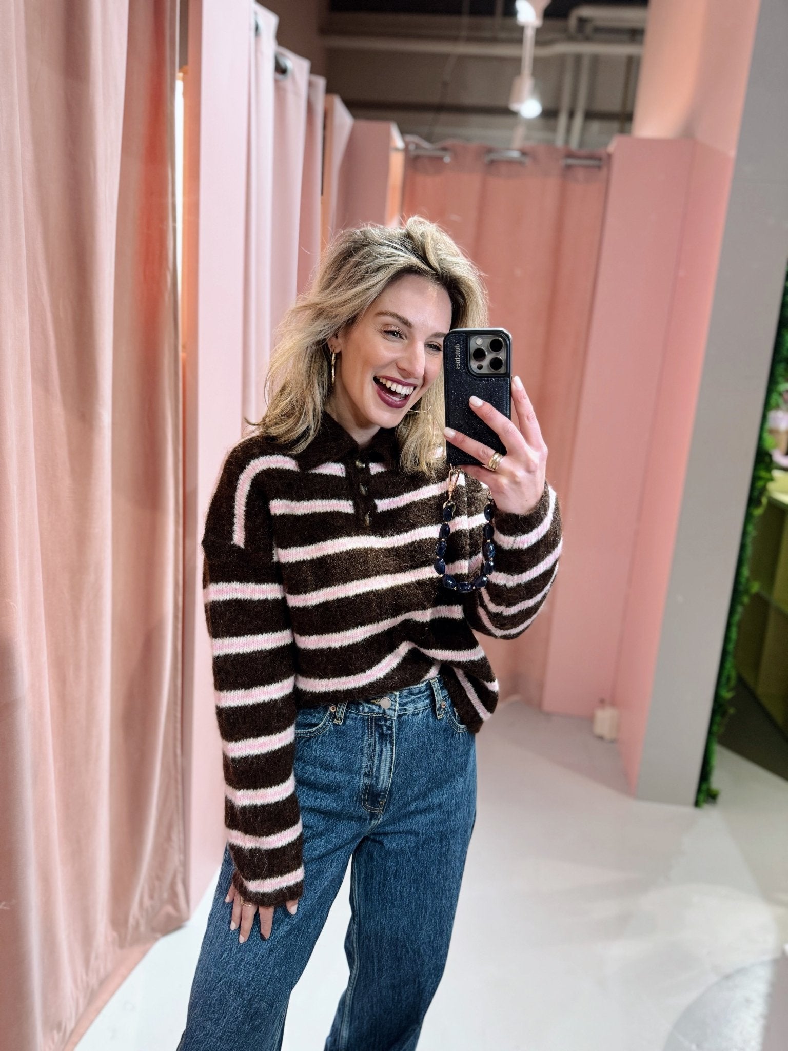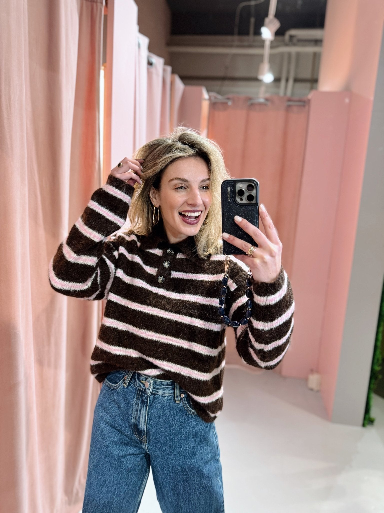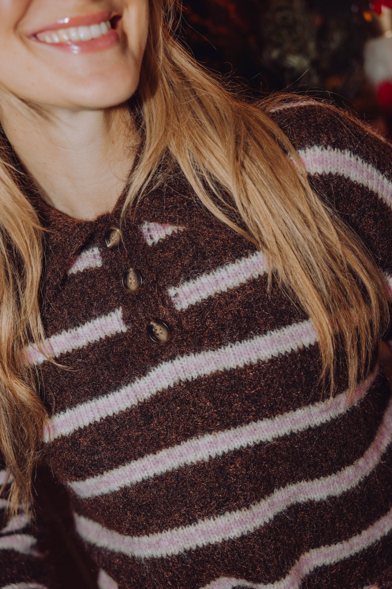 De Onur Knit in bruin is gemaakt van een gebreid materiaal, waardoor hij heerlijk warm is! De trui heeft een kraagje met knopen en is voorzien van een lichtroze streep patroon.