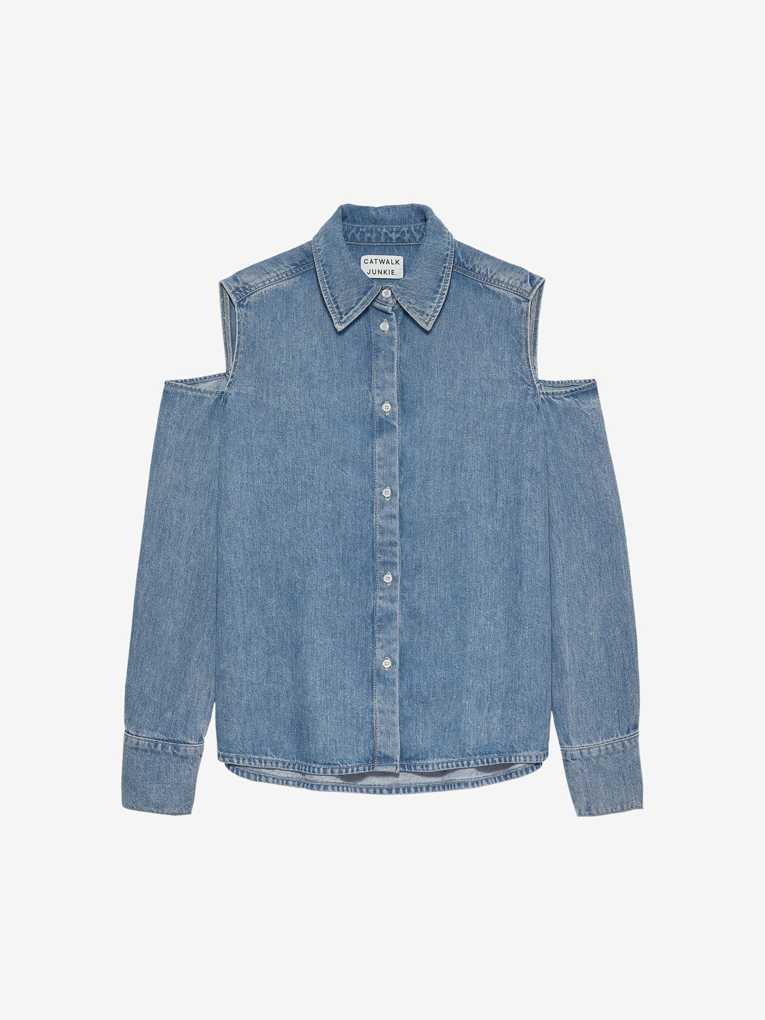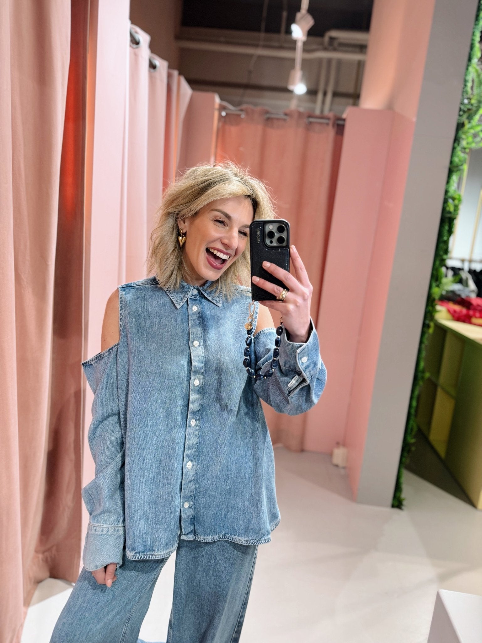 Deze denim blouse heeft een stoere look door de open schouders. Het model sluit met knoopjes aan de voorkant en heeft een rechte, iets lossere fit. De denimstof voelt stevig aan maar draagt comfortabel, waardoor de blouse mooi in vorm blijft. De open schouderdetails geven net wat extra’s, zonder dat het te veel wordt.