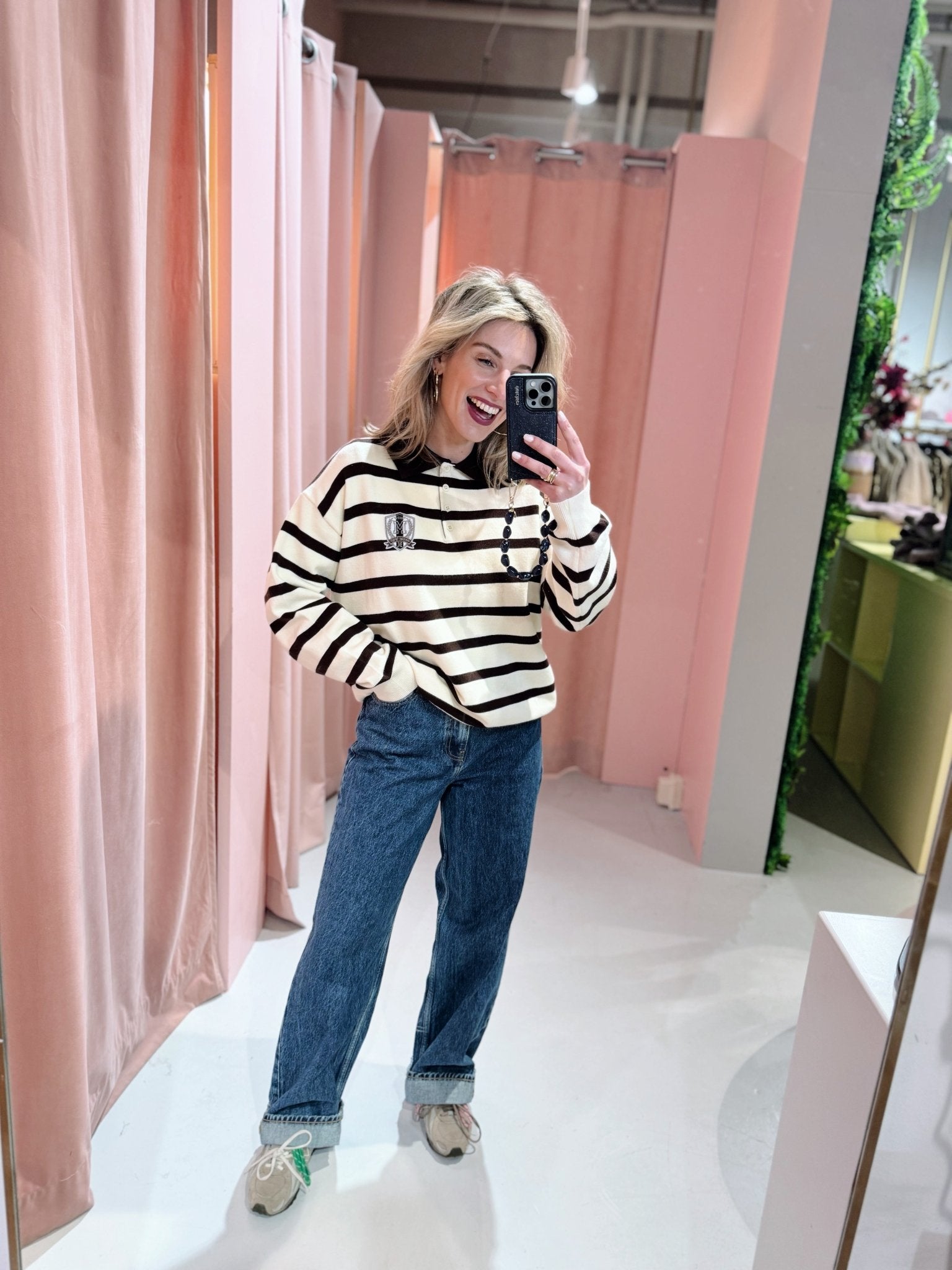 De Oriana Polo in off white heeft een oversized model en een kraagje met knoopjes. De polo is voorzien van een off white met bruin streep patroon en een patch op de borst.