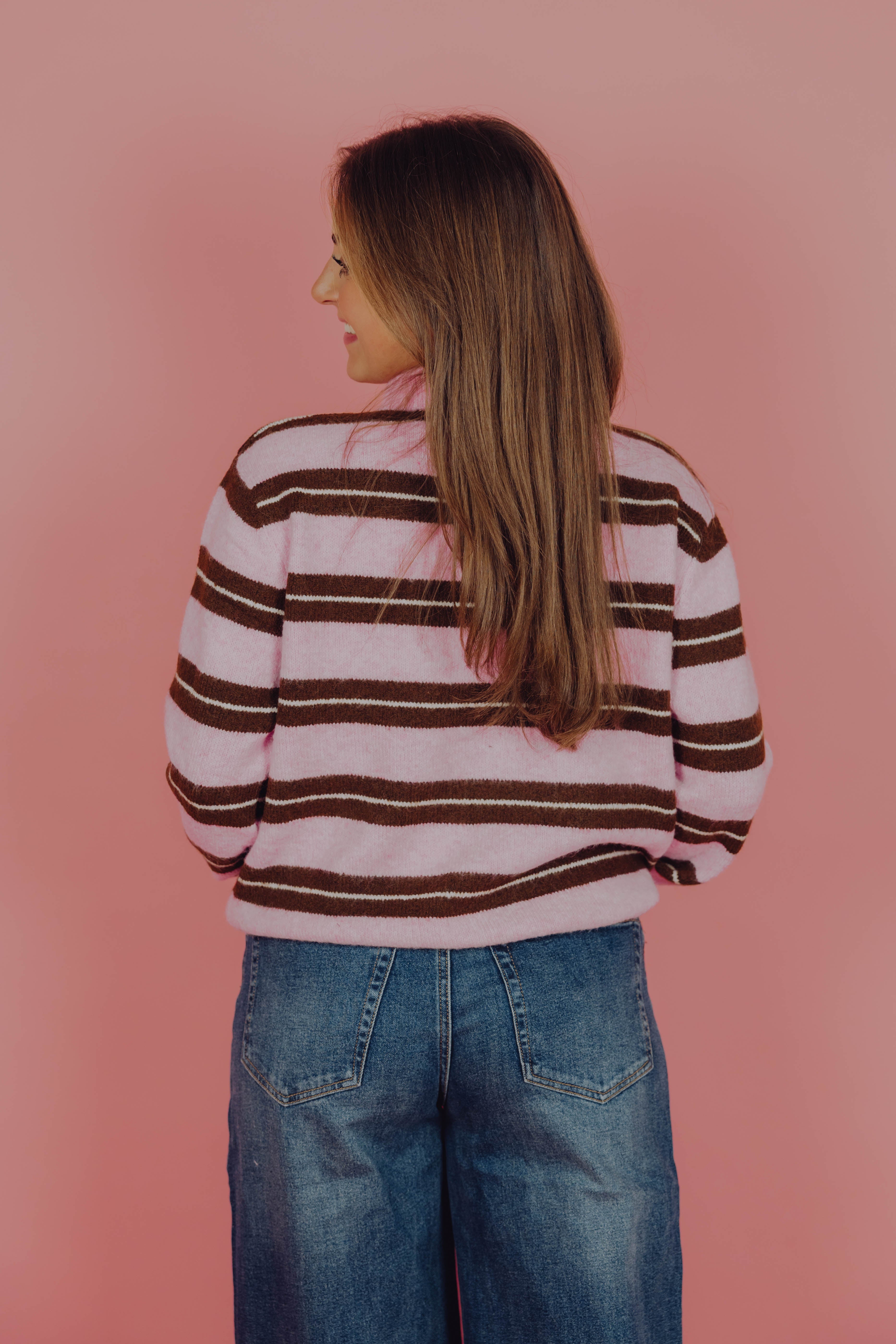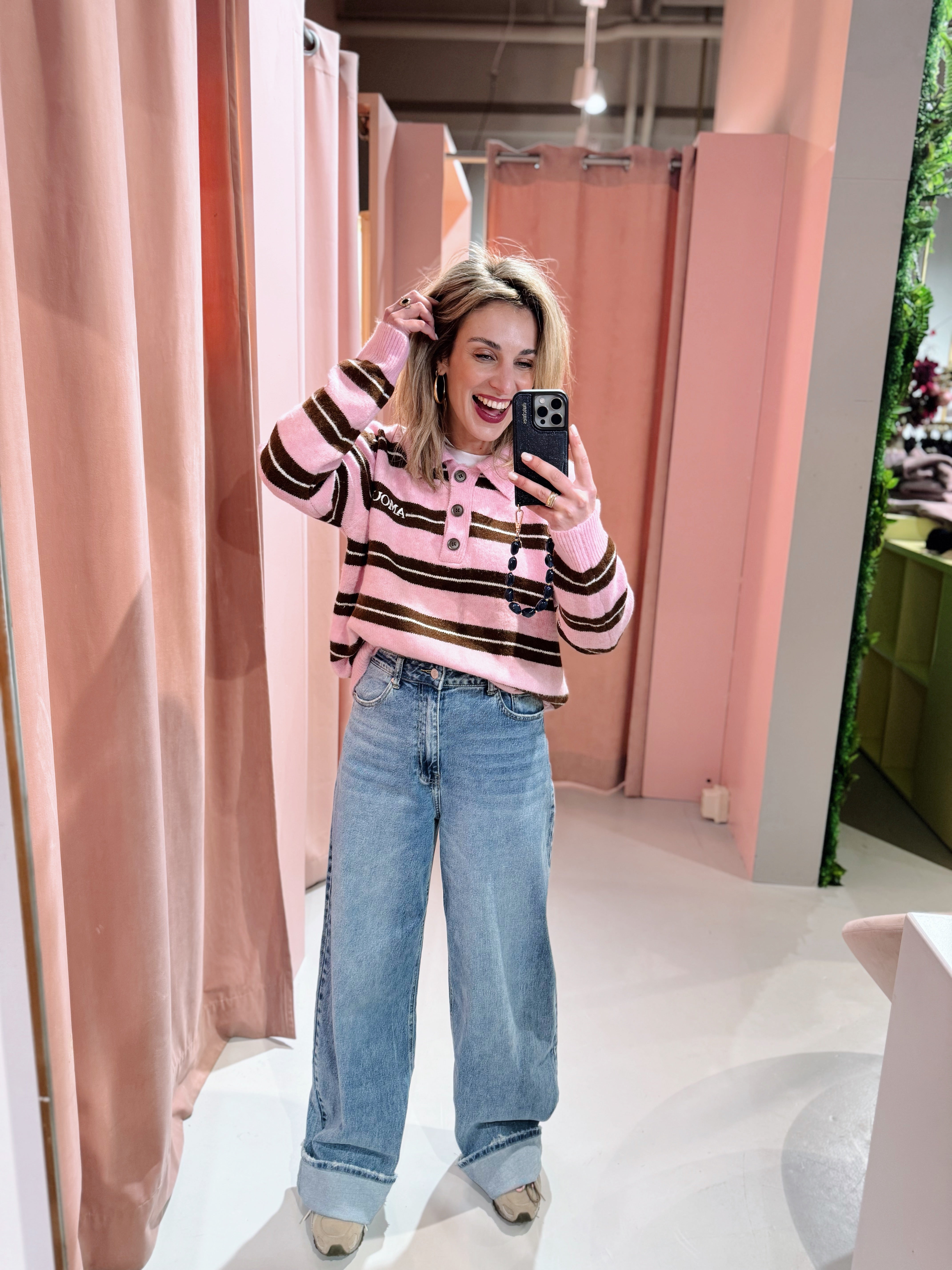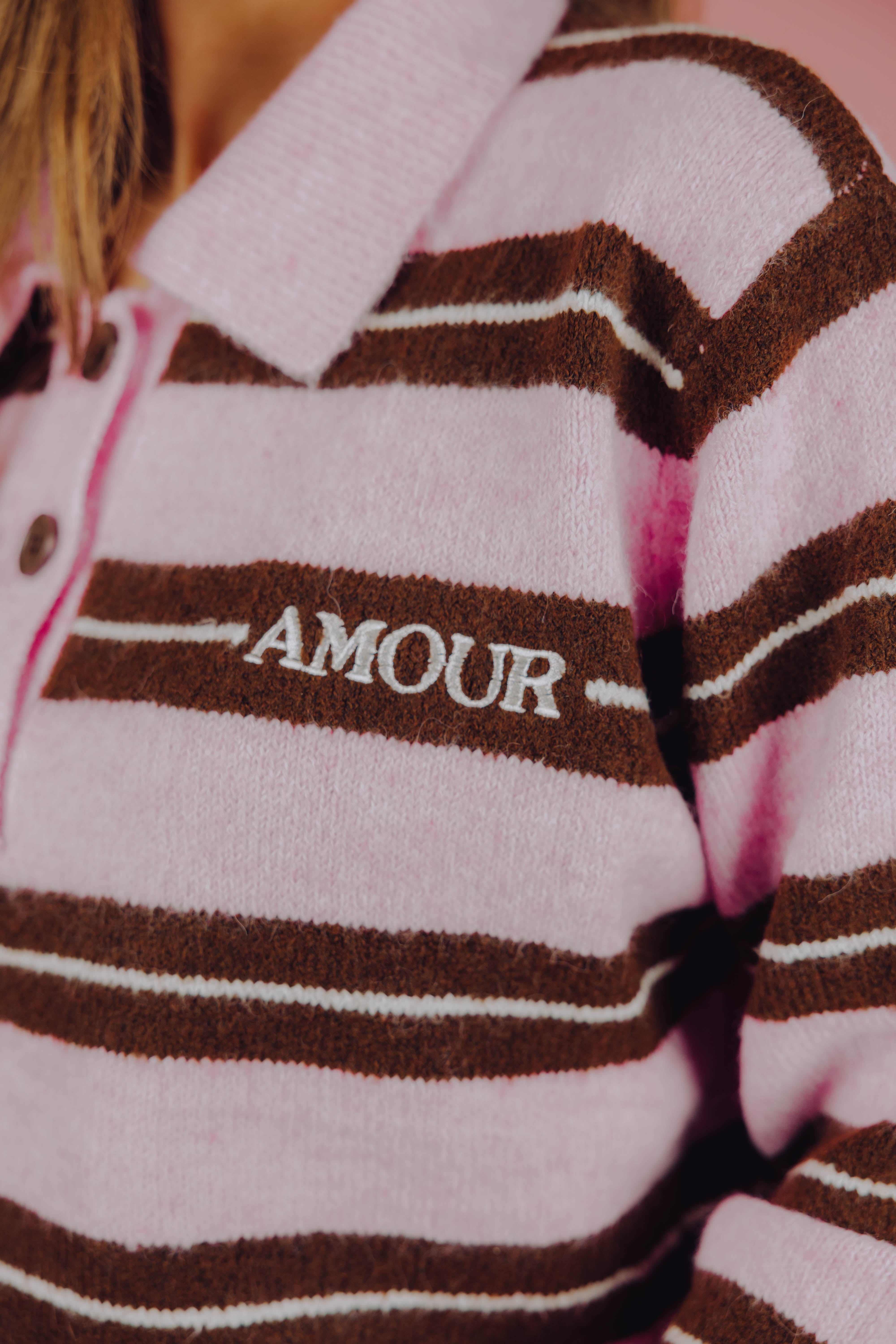 De Paige Polo in roze is gemaakt van een gebreid materiaal met een kraagje en knopen aan de voorkant. De sweater is voorzien van een roze met bruin streeppatroon en heeft een geborduurde tekst “amour” op de borst, wat zorgt voor een leuk detail.