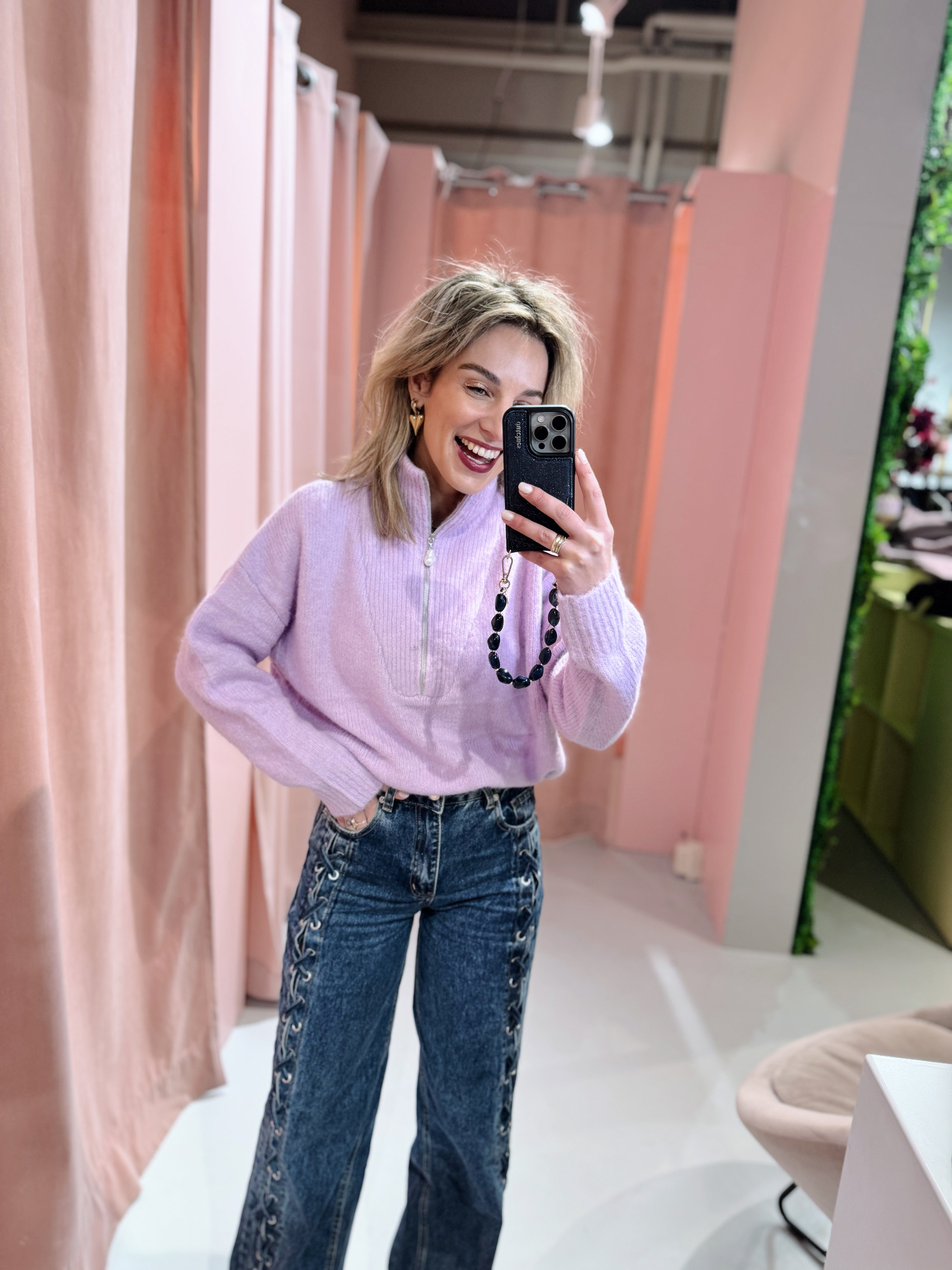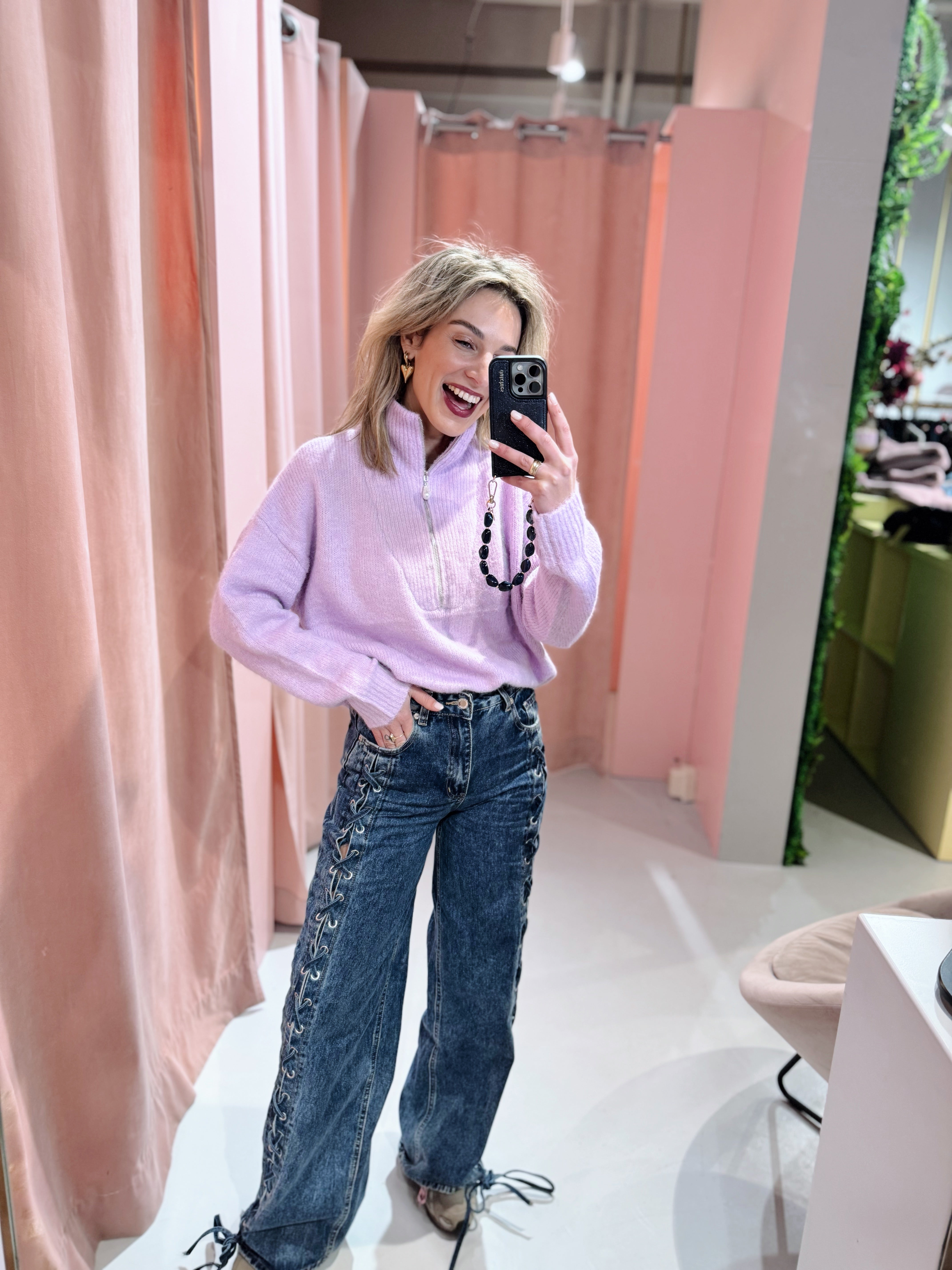 De Pearl Zip Up Knit in lila is gemaakt van een gebreid materiaal, waardoor hij heerlijk warm is. Het model is voorzien een kraagje met rits en een parel als subtiel detail. Combineer deze fijne knit met een jeans voor een casual look of met een rokje voor een vrouwelijke outfit!