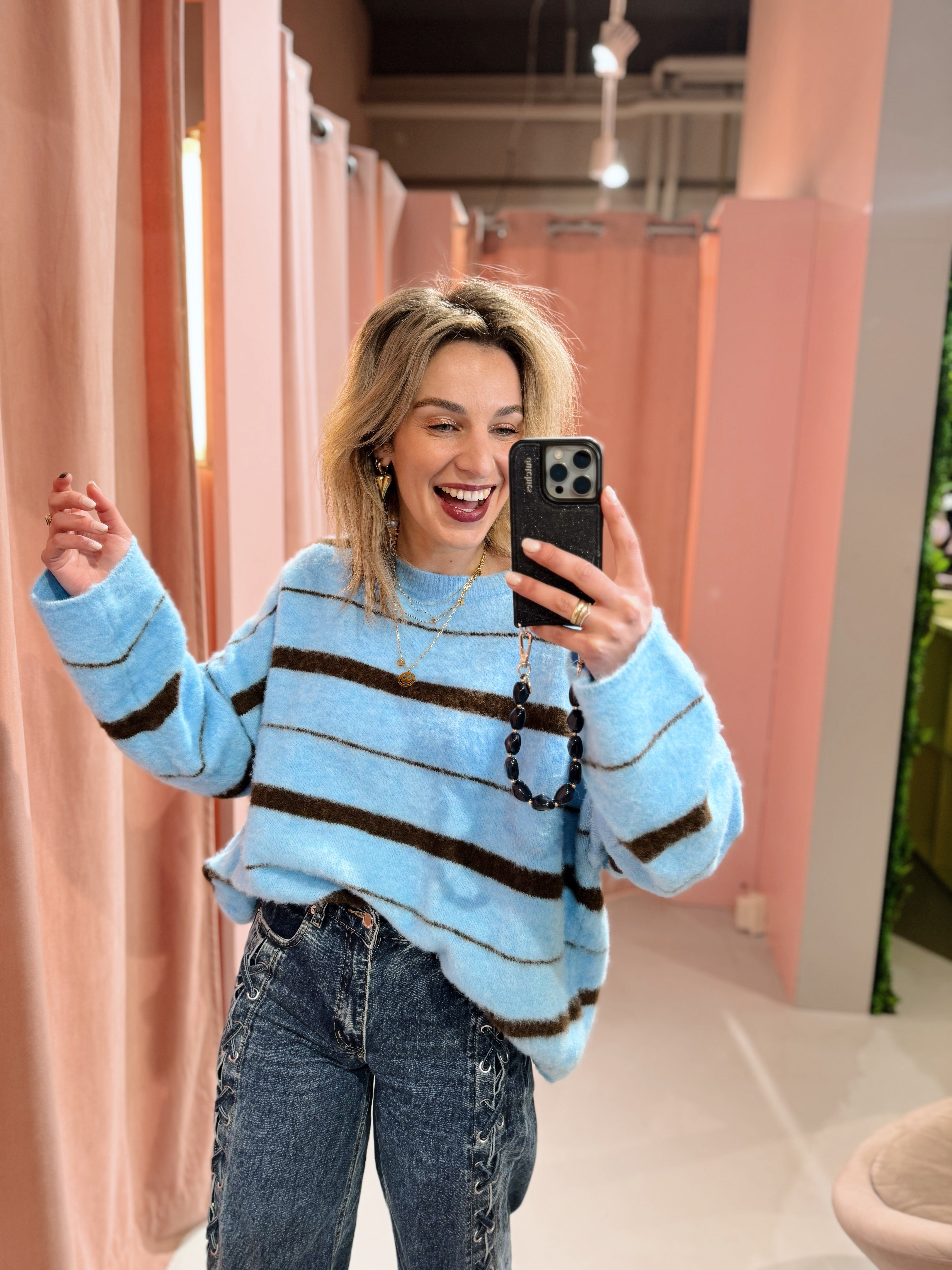 De Pia Knit in blauw is een pluizige knit met een oversized, boxy model. De trui is gemaakt van een gebreid materiaal, heeft lange mouwen en een ronde halslijn. Doordat de trui voorzien is van een streep patroon, is het een leuke kleurrijke toevoeging aan je outfit!