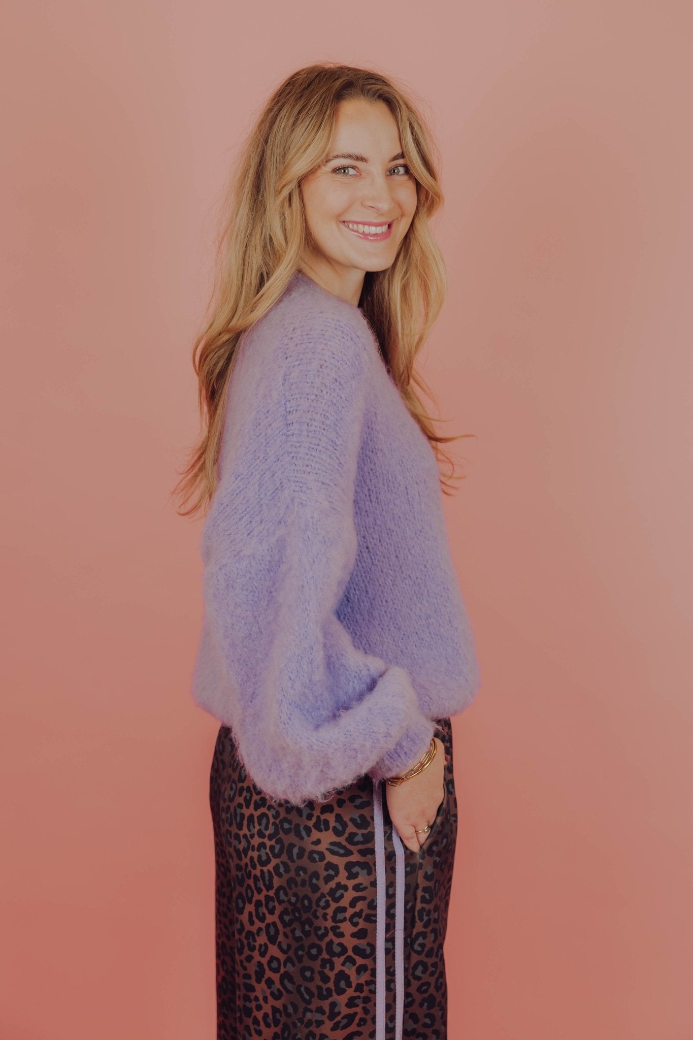De Pixie Knit in paars is een zachte, pluizige knit met een mohair look en een oversized fit. De trui is gemaakt van een heerlijk warm gebreid materiaal, heeft lange mouwen en een ronde hals. Door het losse model draagt hij heerlijk comfortabel en valt hij mooi nonchalant. De paarse kleur maakt deze knit een echte pop of color en geeft elke outfit meteen een vrolijke, opvallende touch.