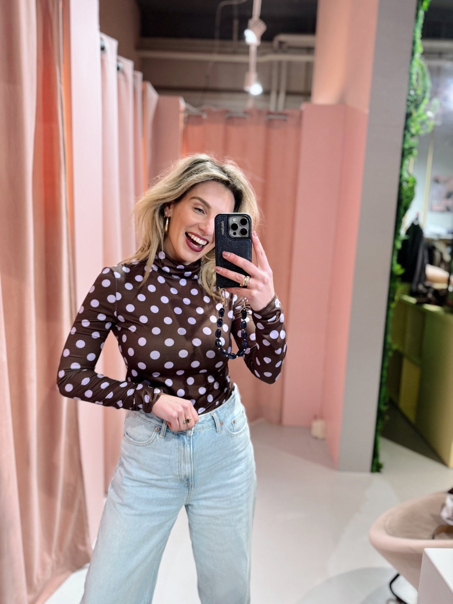 De Polkadot Col in paars is een turtleneck top met een aansluitend model. De top heeft lange mouwen met een col en is voorzien van een stippen patroon.