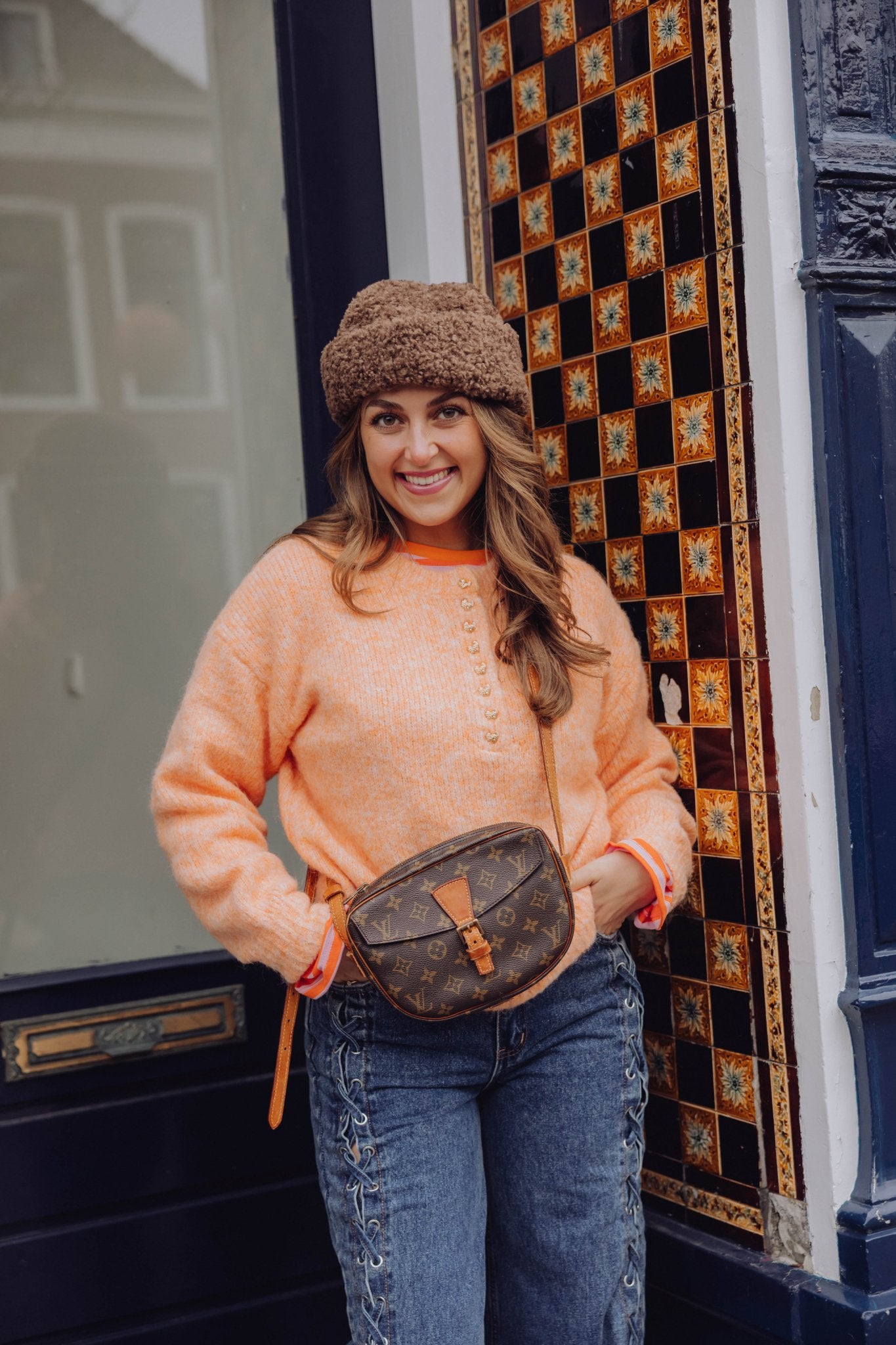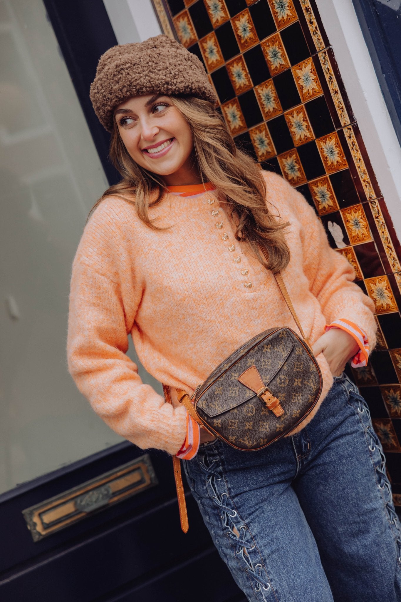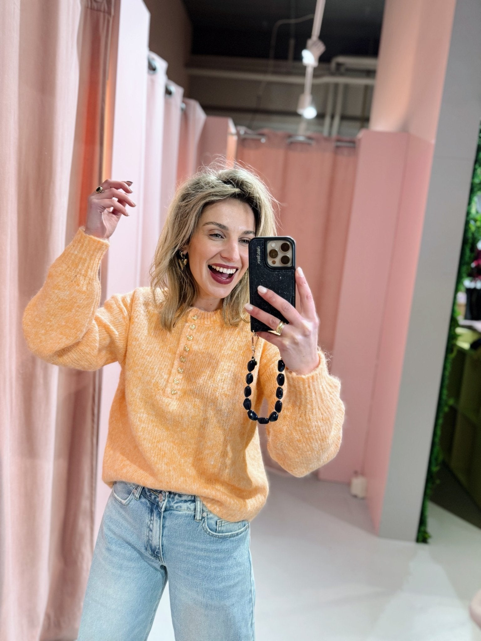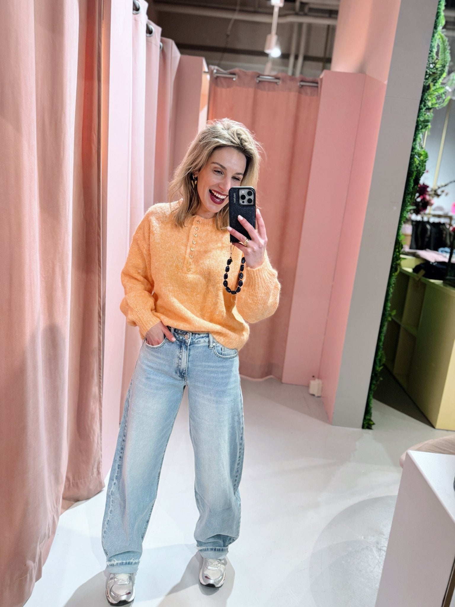 De Quitny Knit in oranje is een knit met een boxy model. De trui is gemaakt van een heerlijk warm gebreid materiaal, heeft lange mouwen met een ronde halslijn en gouden hartjes knoopjes.