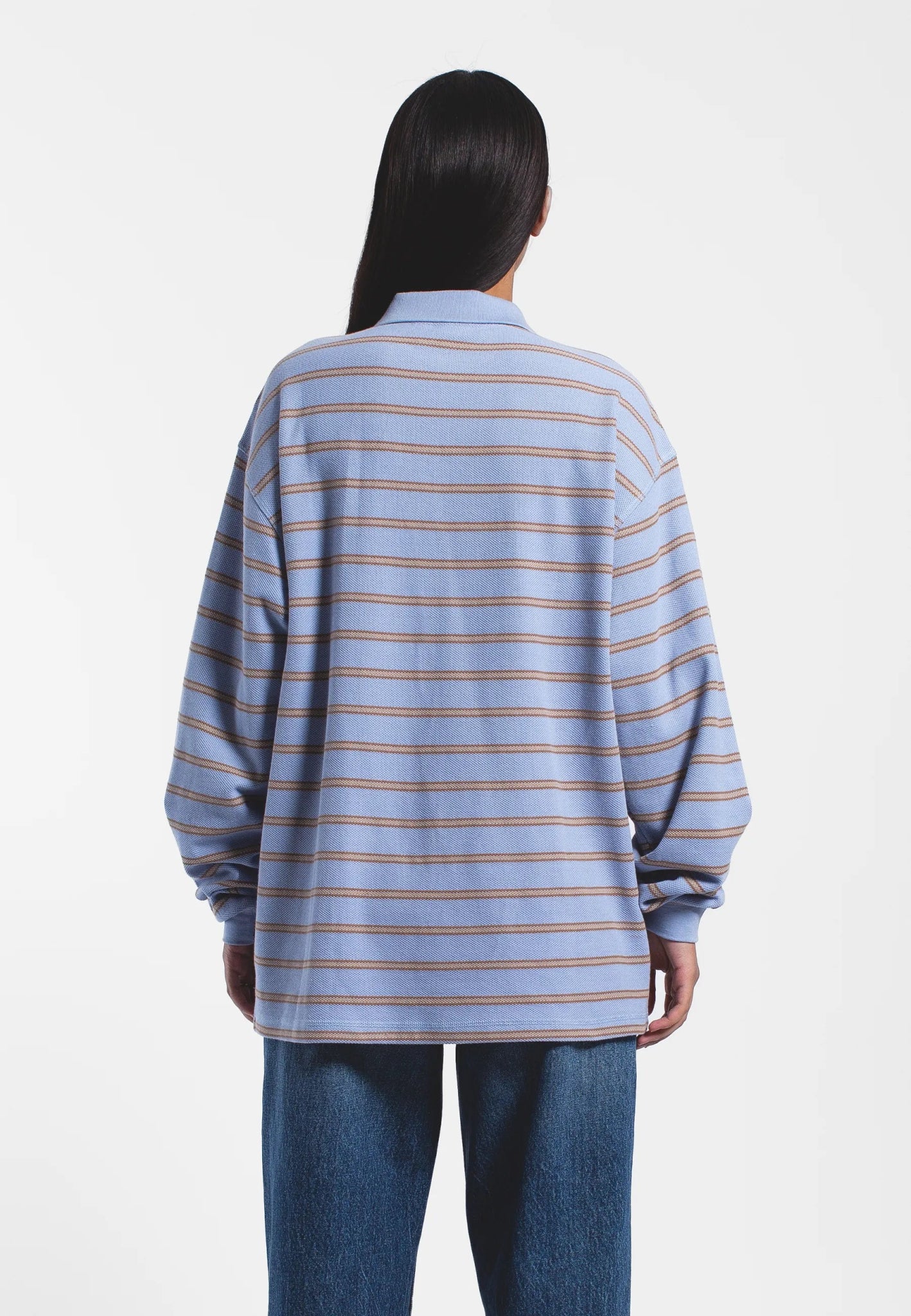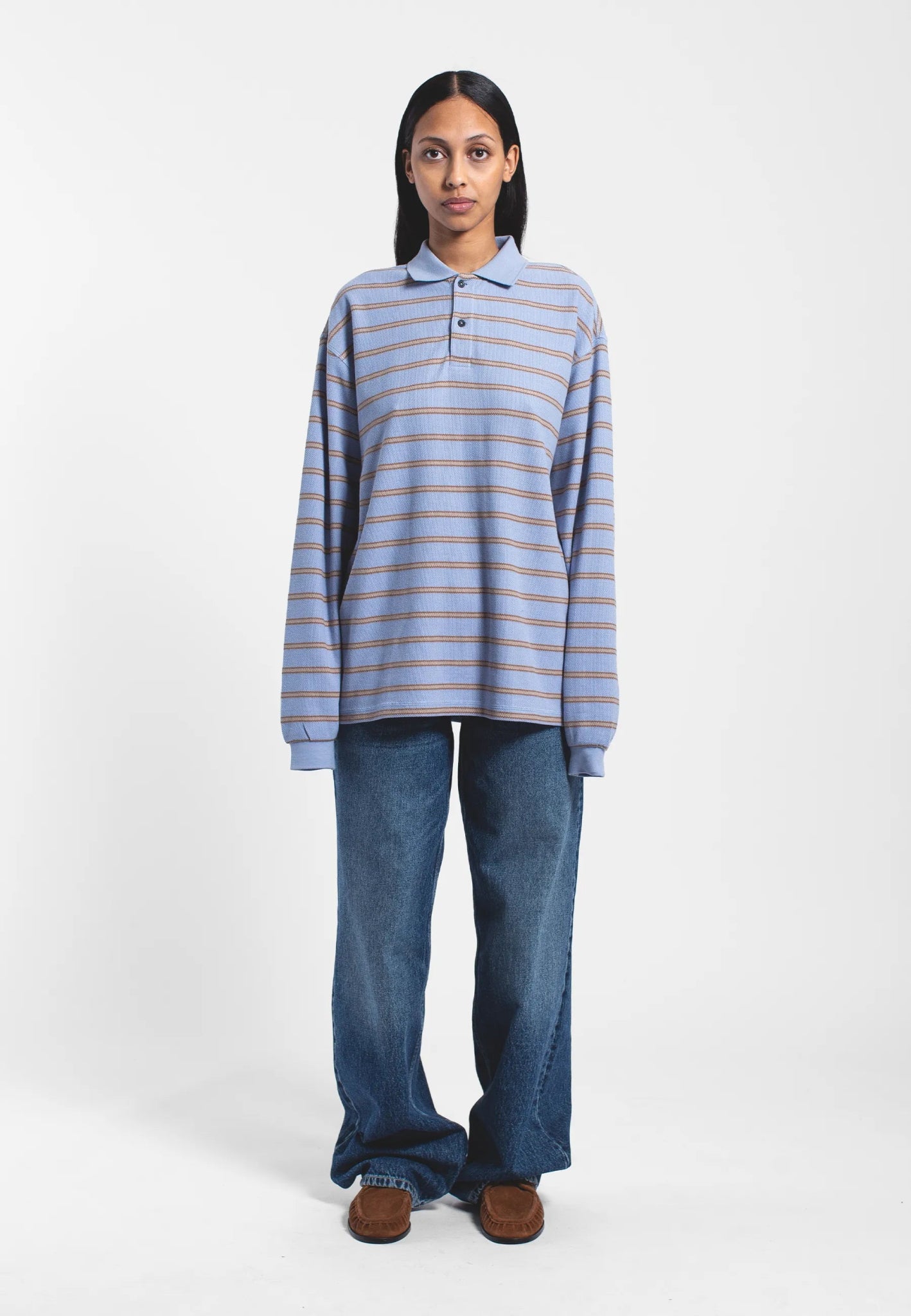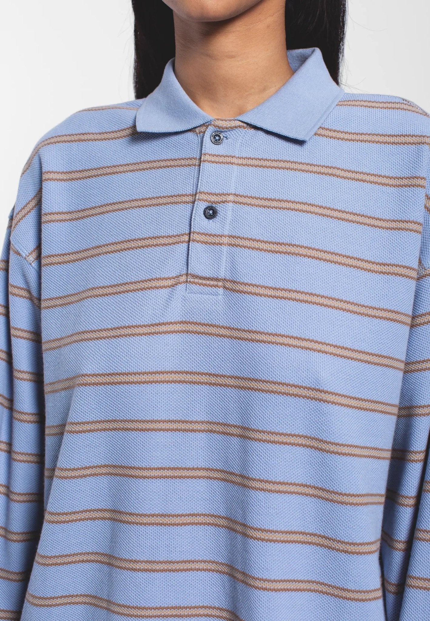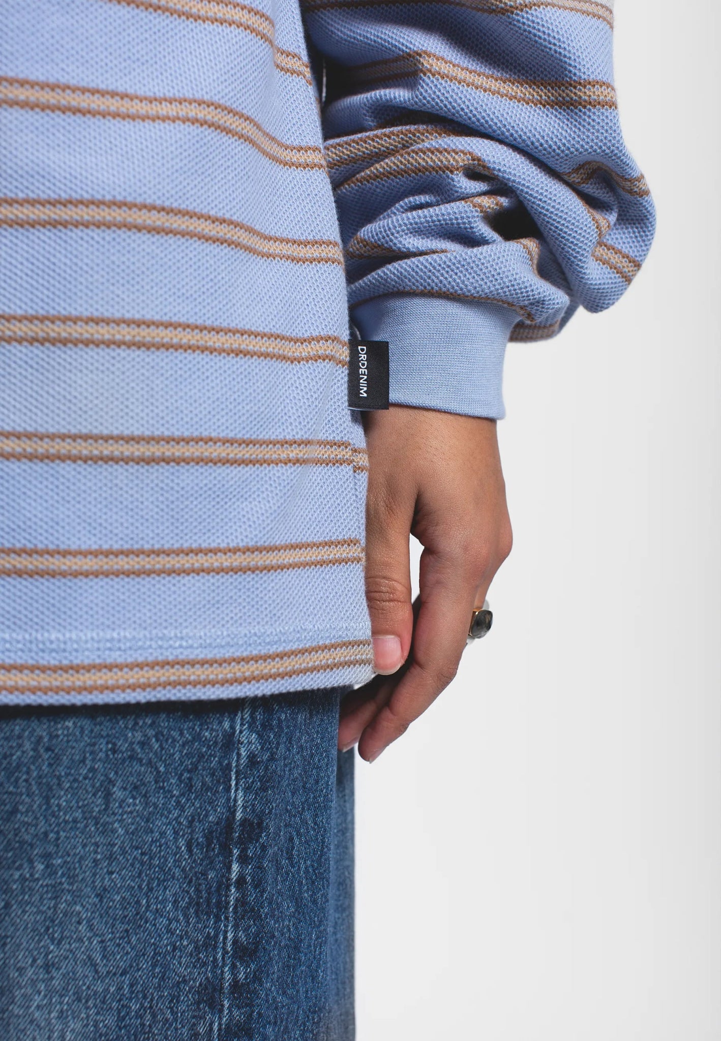 Deze Dr. Denim longsleeve polo heeft een relaxed fit met een rechte pasvorm. Gemaakt van stevig katoen en afgewerkt met een klassieke kraag en knoopsluiting. Het gestreepte patroon in lichtblauw met bruin geeft het shirt een retro uitstraling.