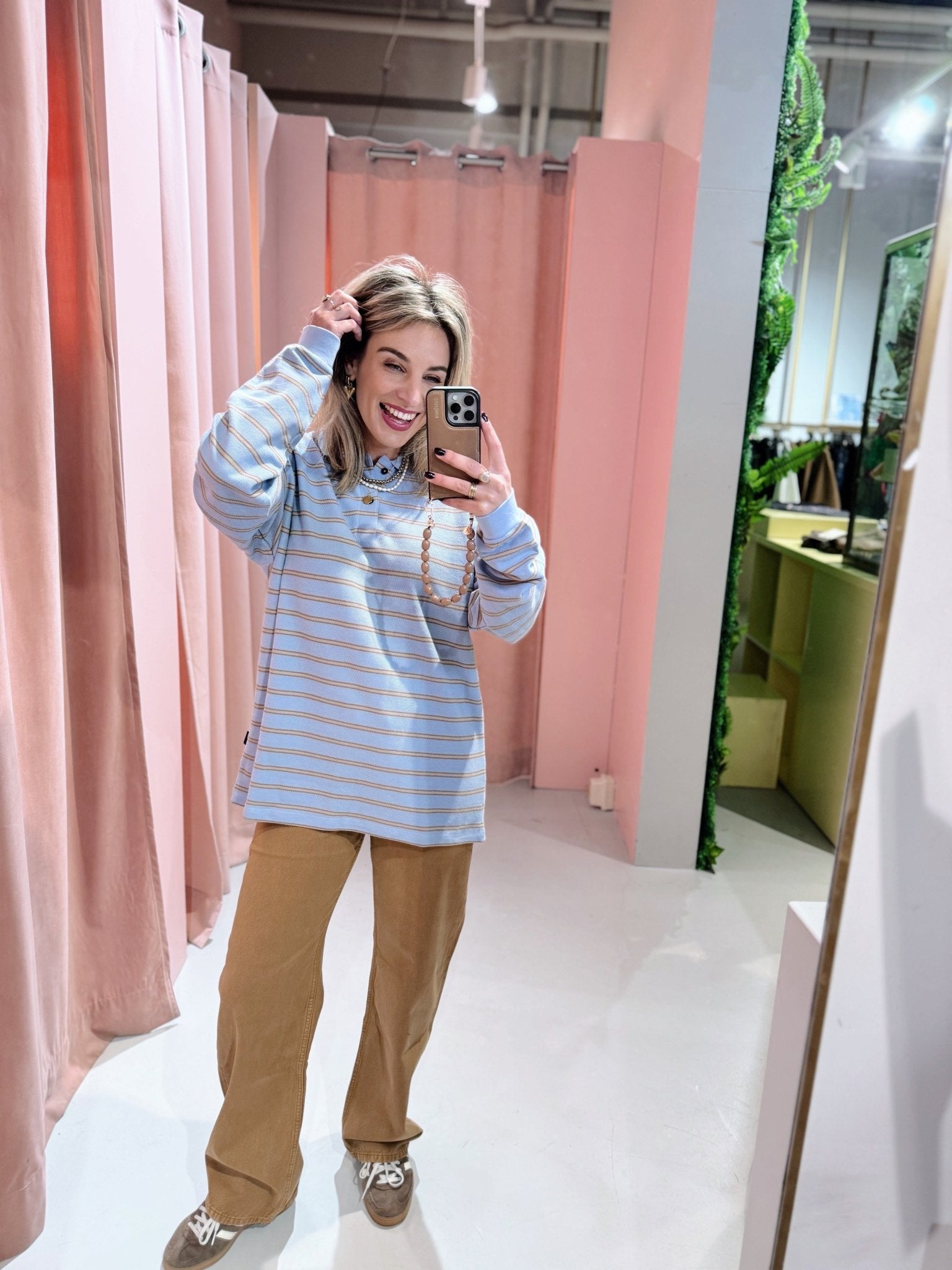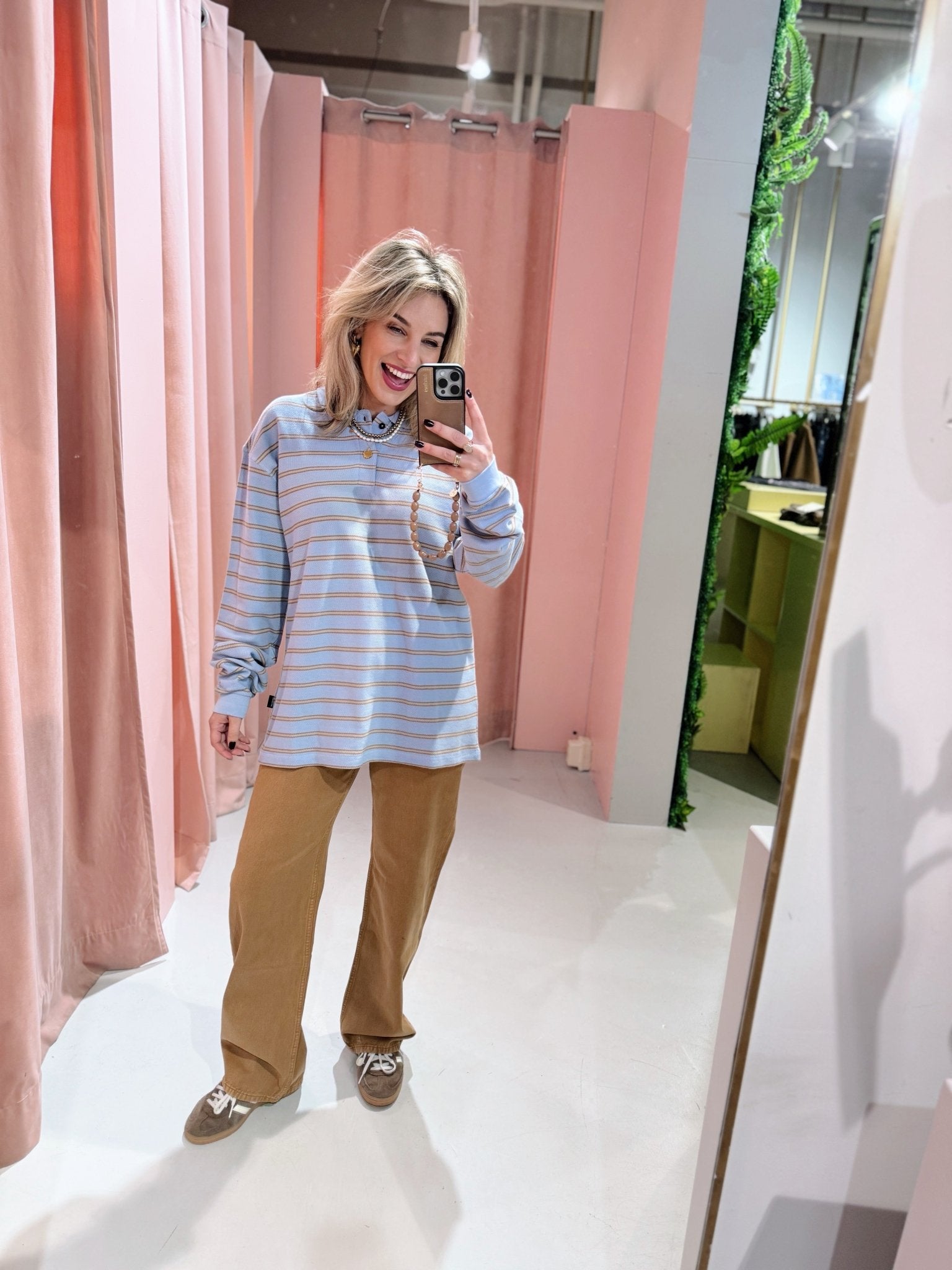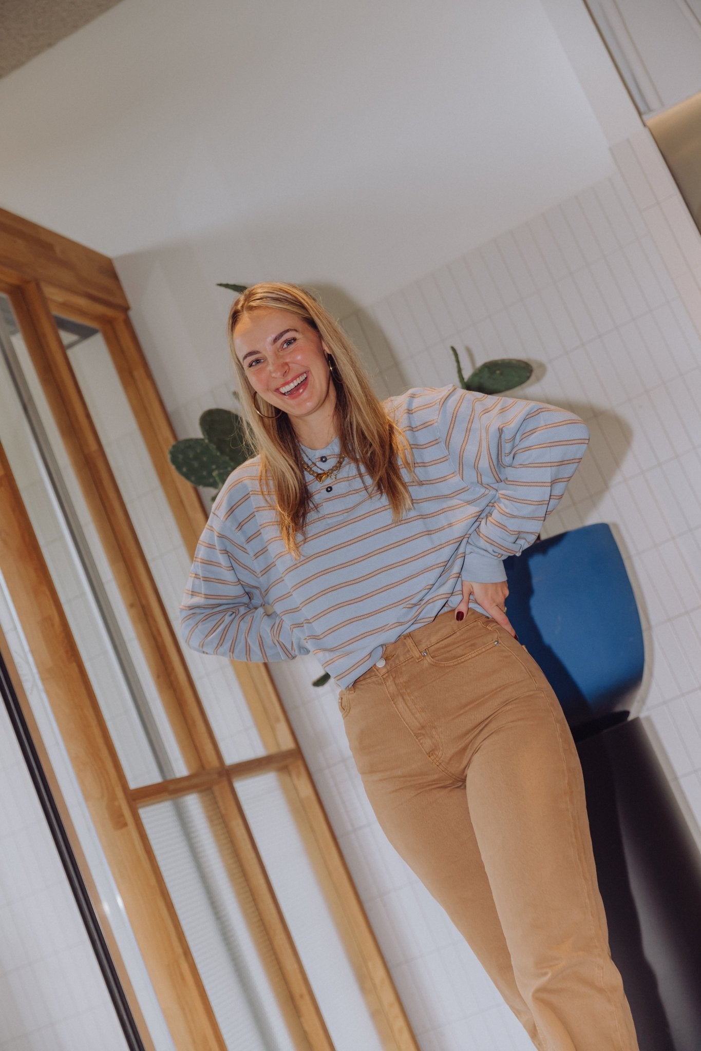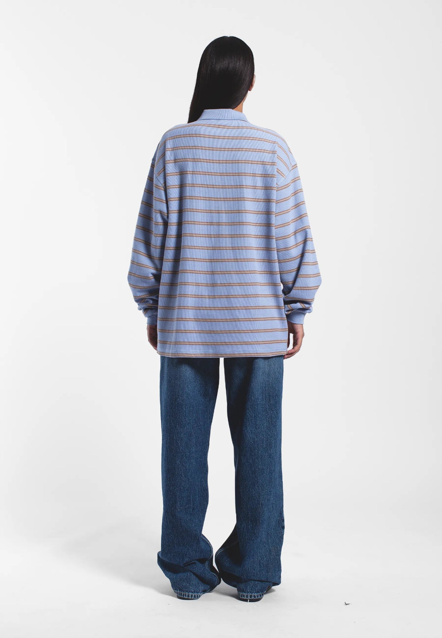 Deze Dr. Denim longsleeve polo heeft een relaxed fit met een rechte pasvorm. Gemaakt van stevig katoen en afgewerkt met een klassieke kraag en knoopsluiting. Het gestreepte patroon in lichtblauw met bruin geeft het shirt een retro uitstraling.