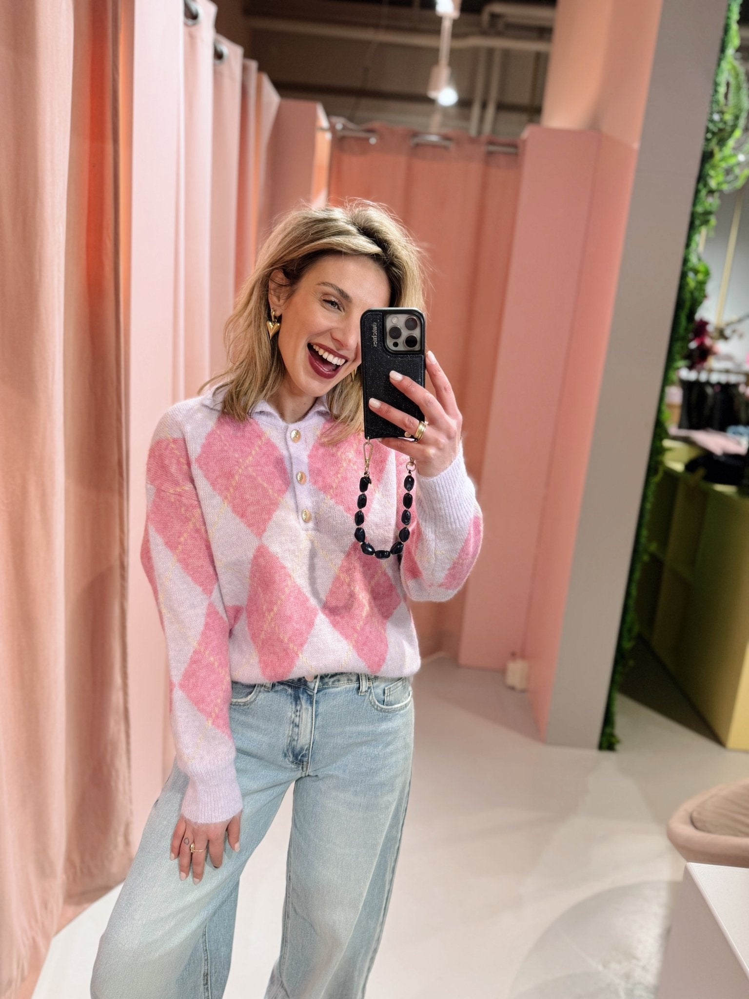 De Rhode Polo in lila is gemaakt van een gebreid materiaal en heeft een kraagje en gouden knoopjes aan de voorkant. De sweater is voorzien van een ruitjes patroon waarin de kleuren combi lila met roze perfect tot zijn recht komt.
