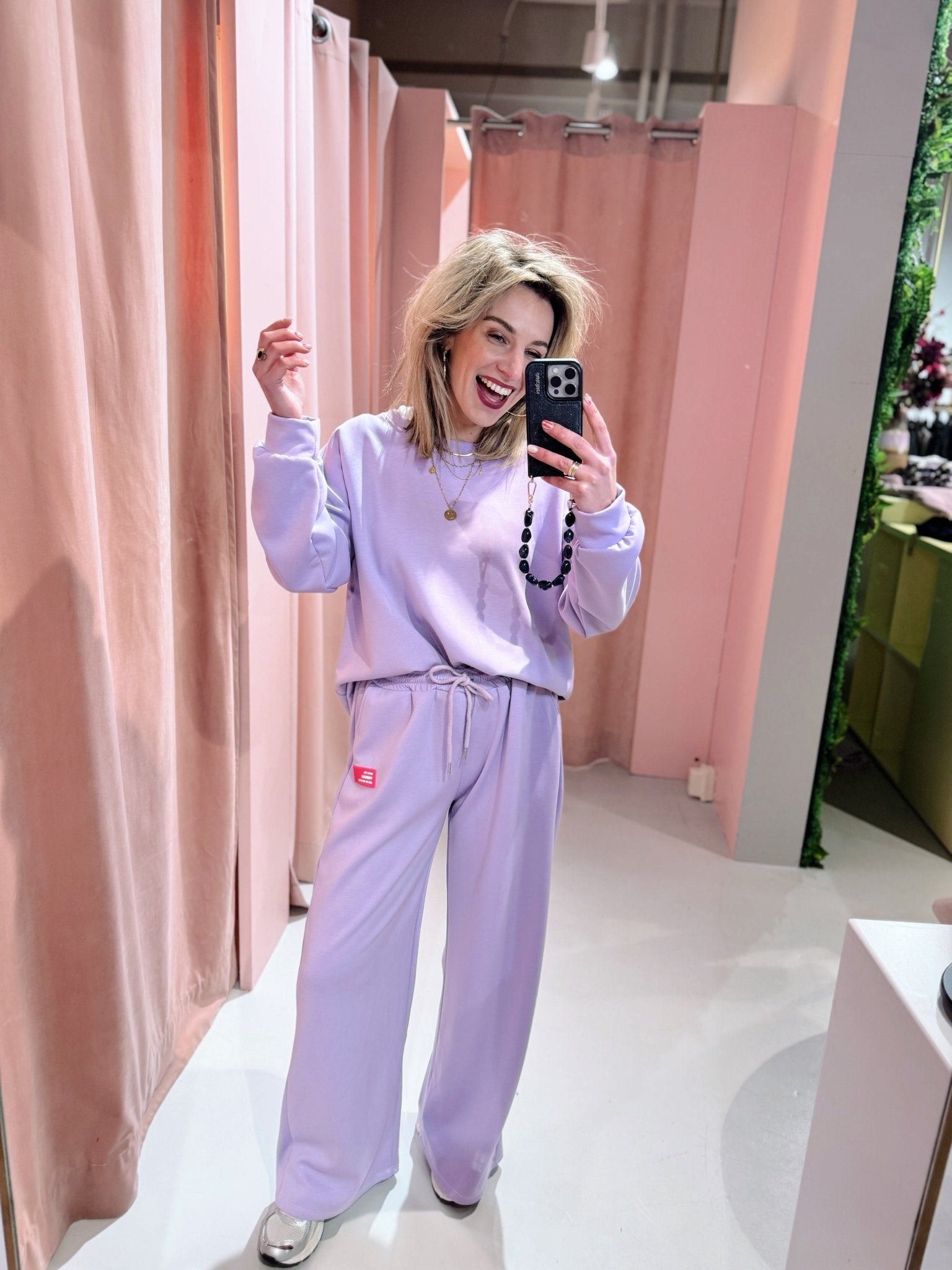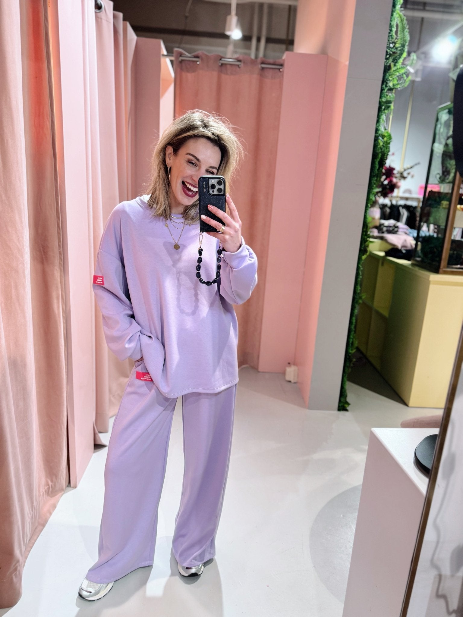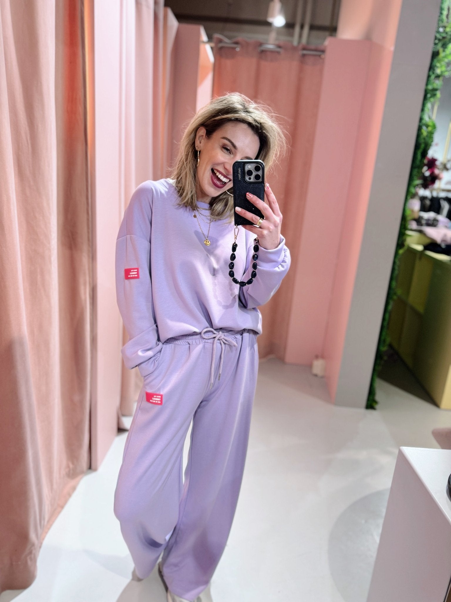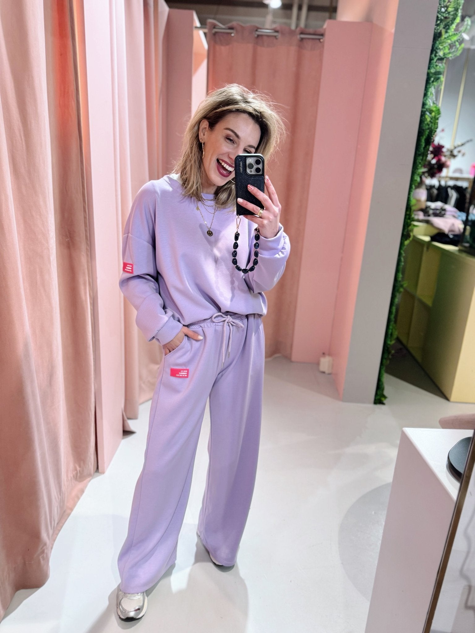 De Robin Set in lila is gemaakt van een heerlijk zacht stofje en bestaat uit een wide leg jogger en een oversized sweater. De broek heeft een elastische tailleband met aantrekkoord en is voorzien van steekzakken, waardoor hij comfortabel zit en praktisch is. De oversized sweater valt lekker los en maakt de look helemaal compleet. Zowel de broek als de sweater zijn afgewerkt met een patch met de tekst “dress for yourself and no one else”. Perfect om samen te dragen als set, maar ook leuk om los te combineren met andere items uit je kast.
