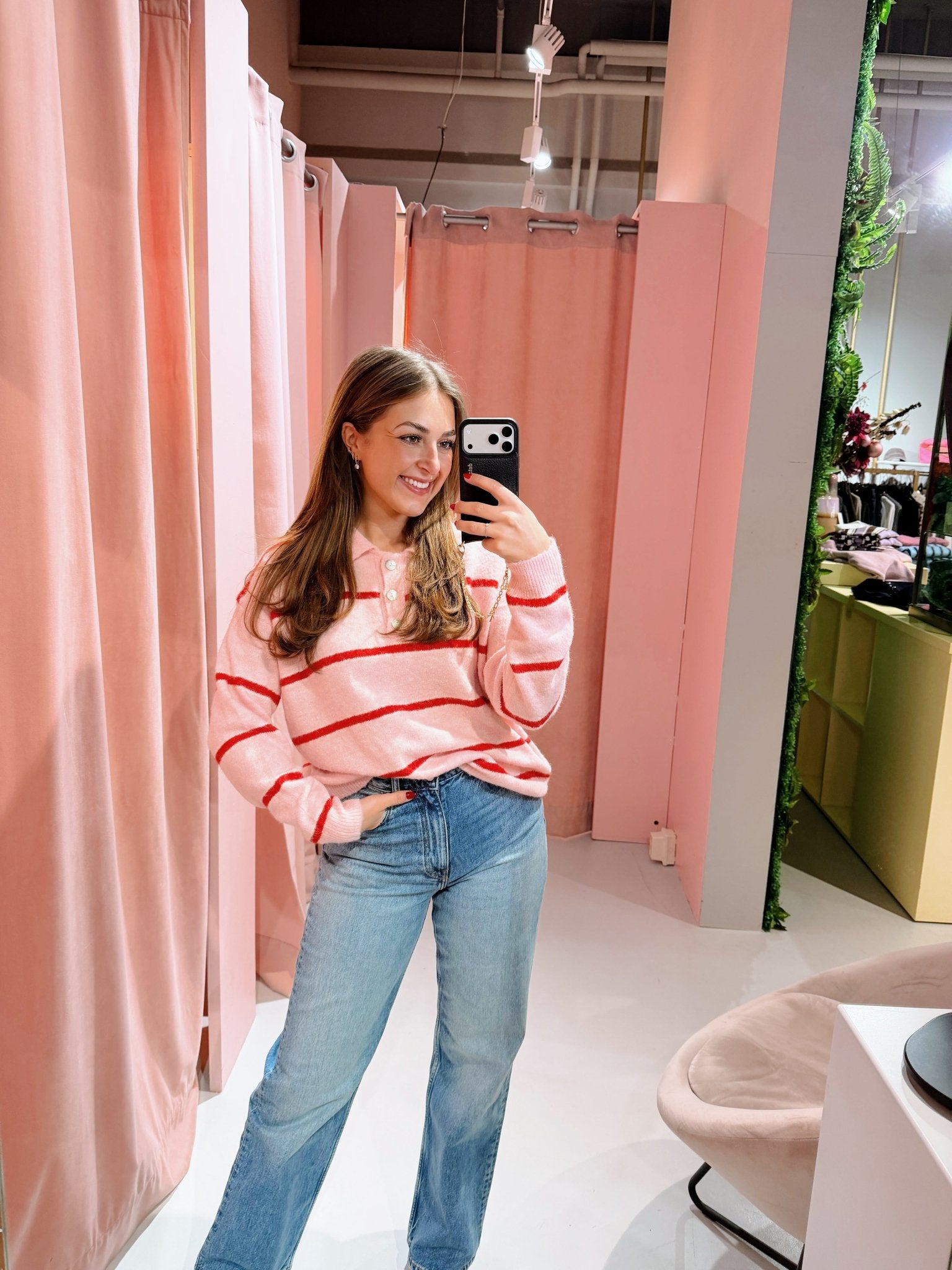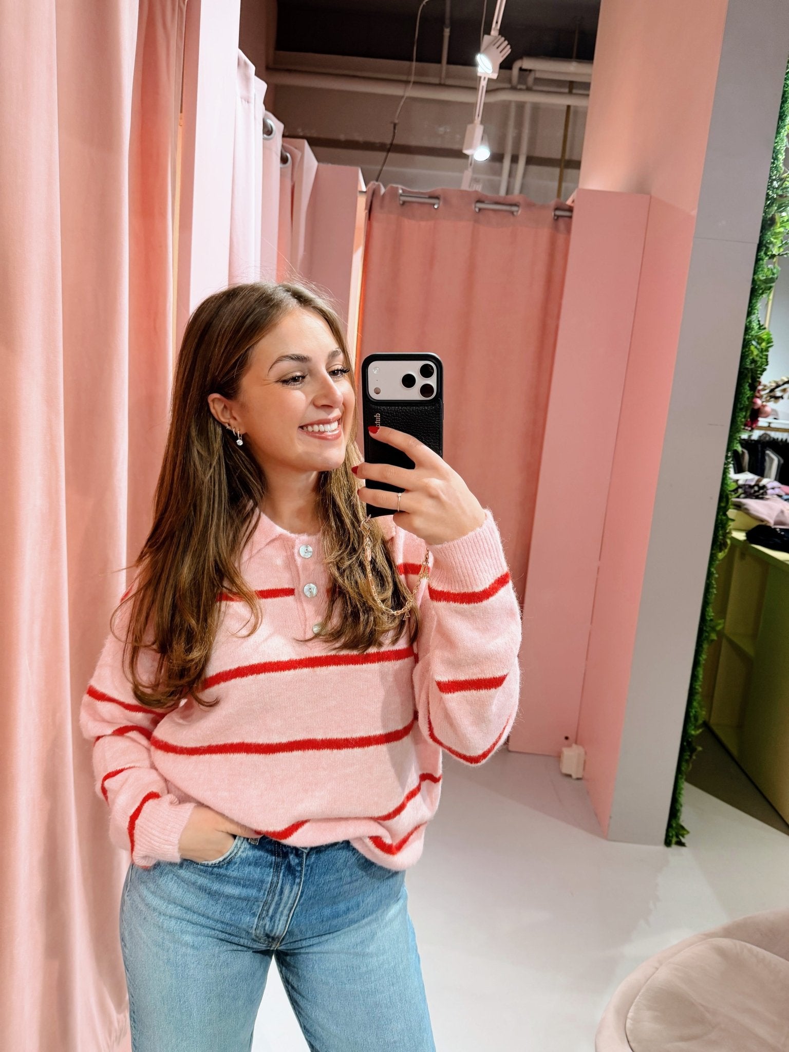 De Romy Polo in lichtroze is gemaakt van een gebreid materiaal en heeft een kraagje en holografische knoopjes aan de voorkant. De sweater is voorzien van een rood streeppatroon, wat zorgt voor een kleurrijke touch.