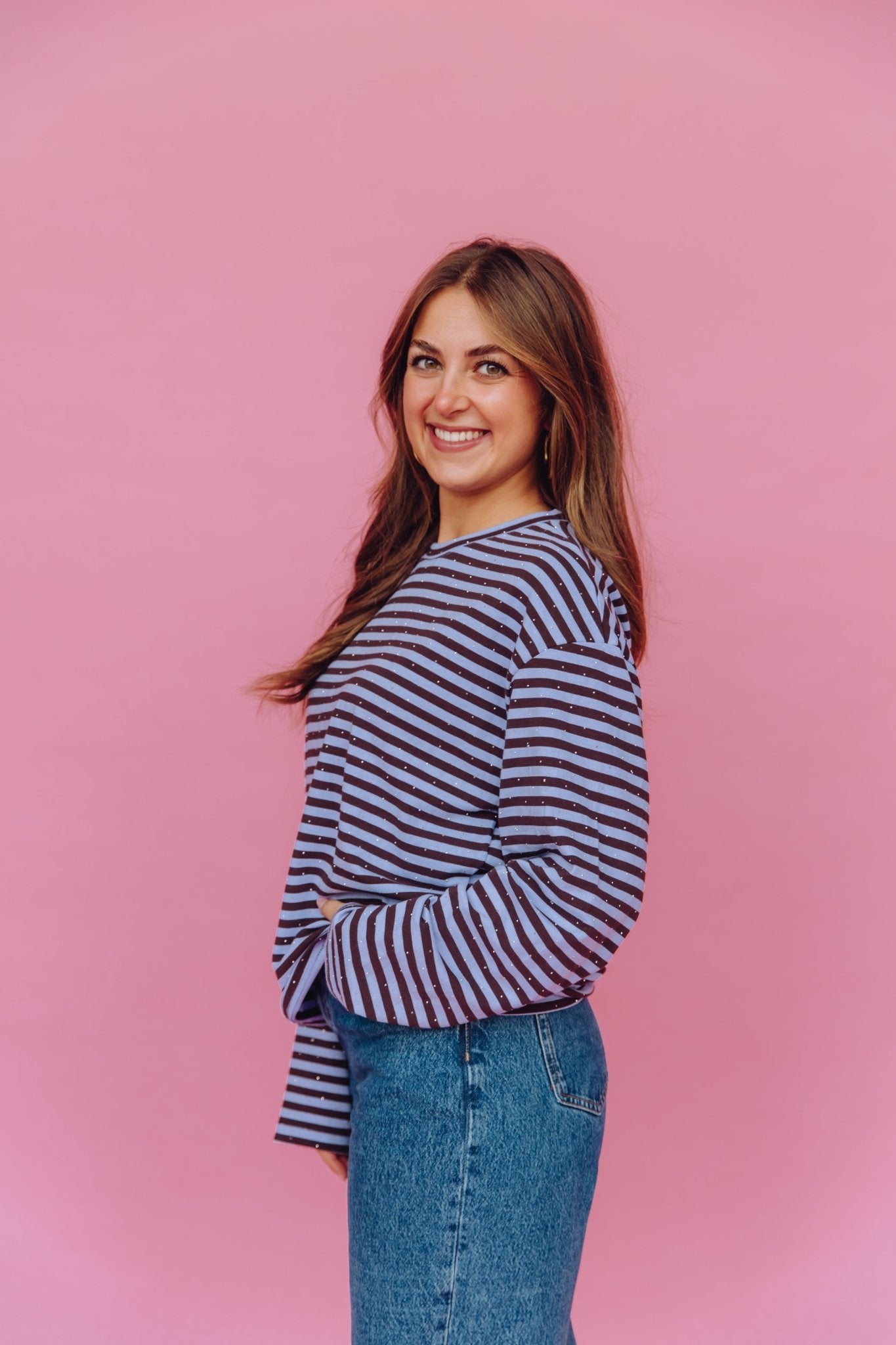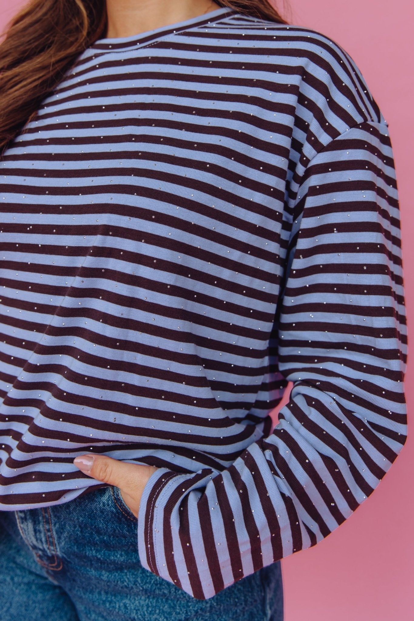 De Rosalia Longsleeve in lila/bruin is een top met een boxy model. De top is gemaakt van een zachte stof, heeft lange mouwen met een hoge, ronde halslijn en een streep patroon. Doordat de top voorzien is van kleine glitter steentjes, is het een échte eyecatcher!