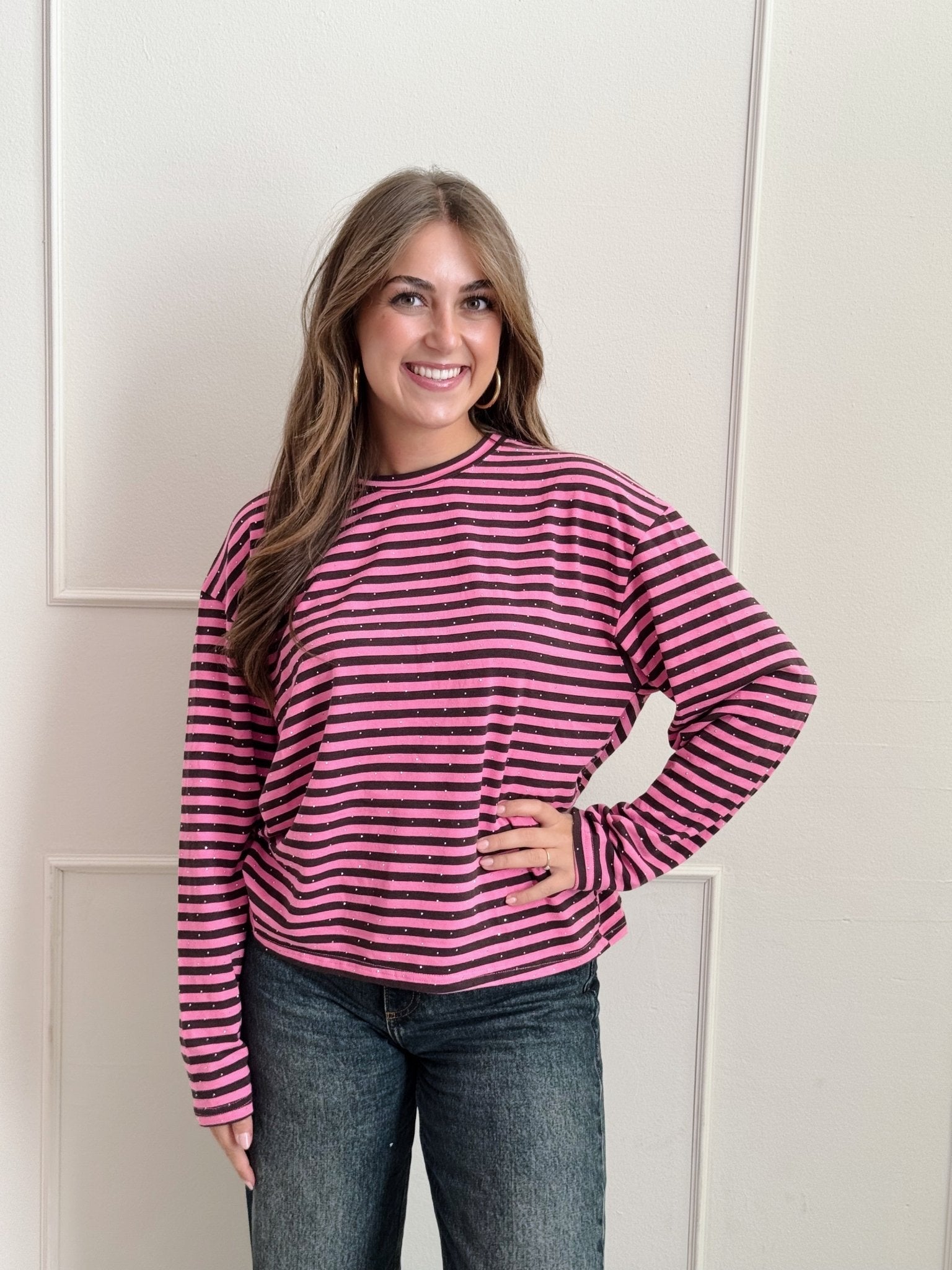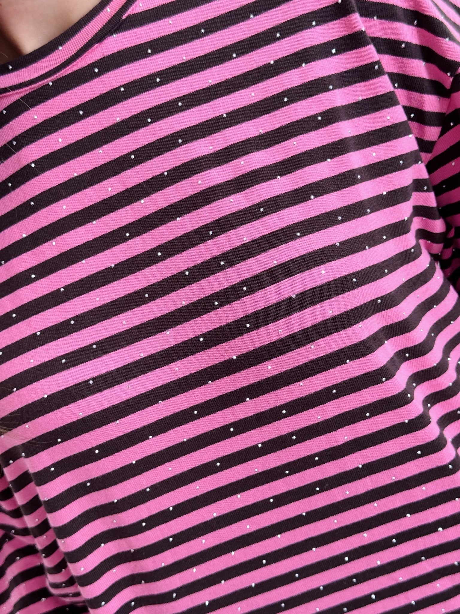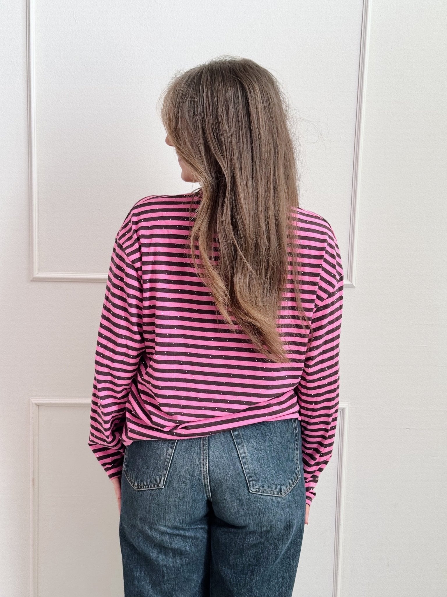 De Rosalia Longsleeve in roze/bruin is een top met een boxy model. De top is gemaakt van een zachte stof, heeft lange mouwen met een hoge, ronde halslijn en een streep patroon. Doordat de top voorzien is van kleine glitter steentjes, is het een échte eyecatcher!
