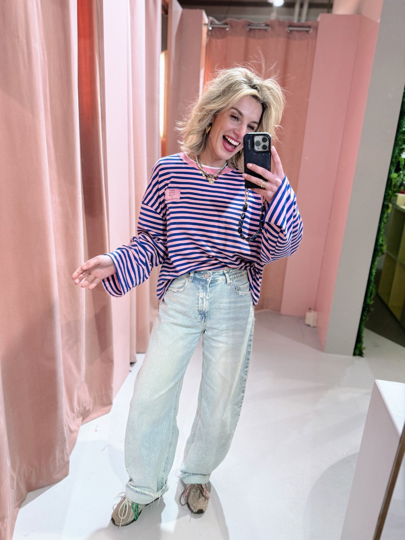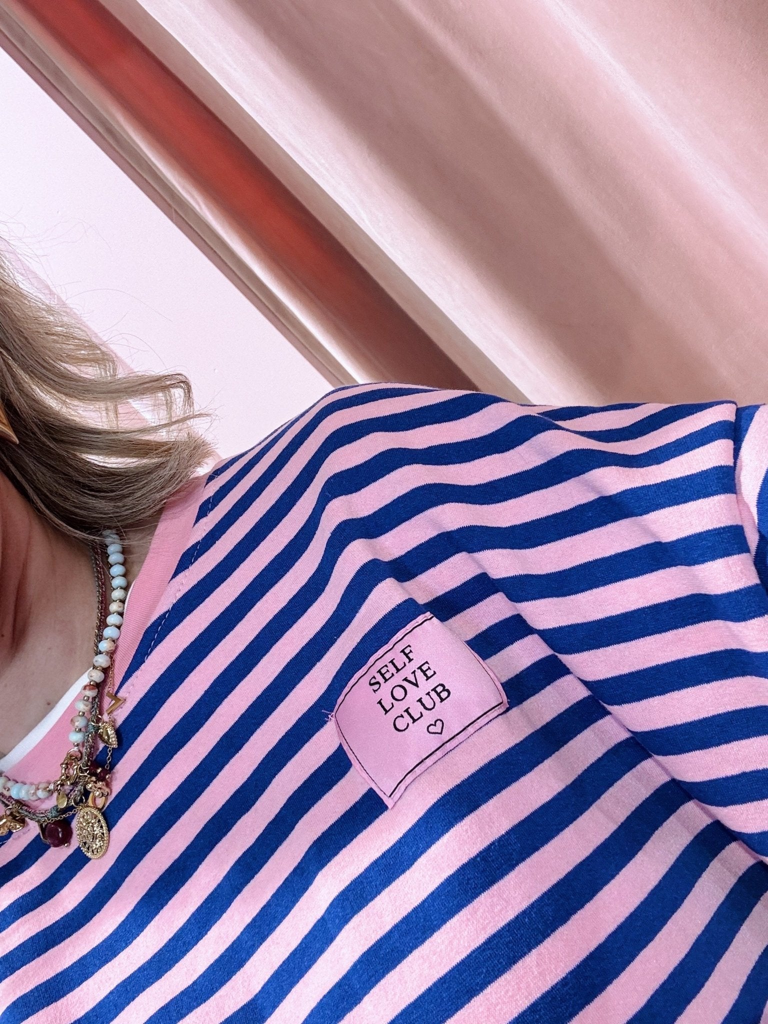 De Selflove Longsleeve in kobalt met roze is een top met een iets wijder model. De top is gemaakt van een stretchy stof, heeft lange mouwen met een hoge, ronde halslijn en een streep patroon. Deze lange mouwen top is perfect om laagjes mee te creëren in het najaar. Op de borst zit een kleurrijke patch, wat zorgt voor een speels detail.