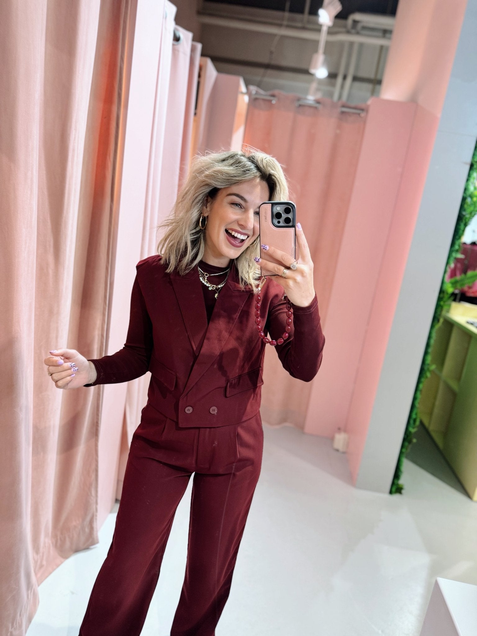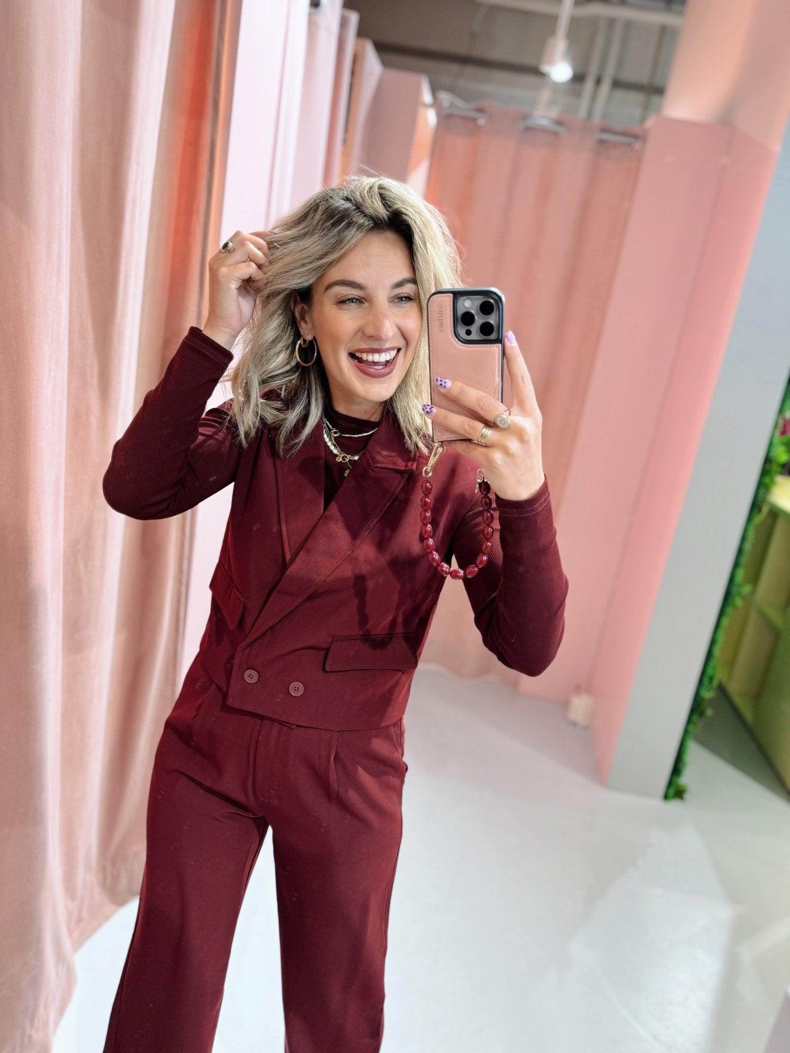 Het Skye Gilet in bordeaux heeft een cropped, mouwloos model en een diepe V-hals. Aan de voorkant zit een knoopsluiting, waardoor je het gilet gemakkelijk kunt sluiten. Combineer dit gilet met de Skye Pants voor een complete set.