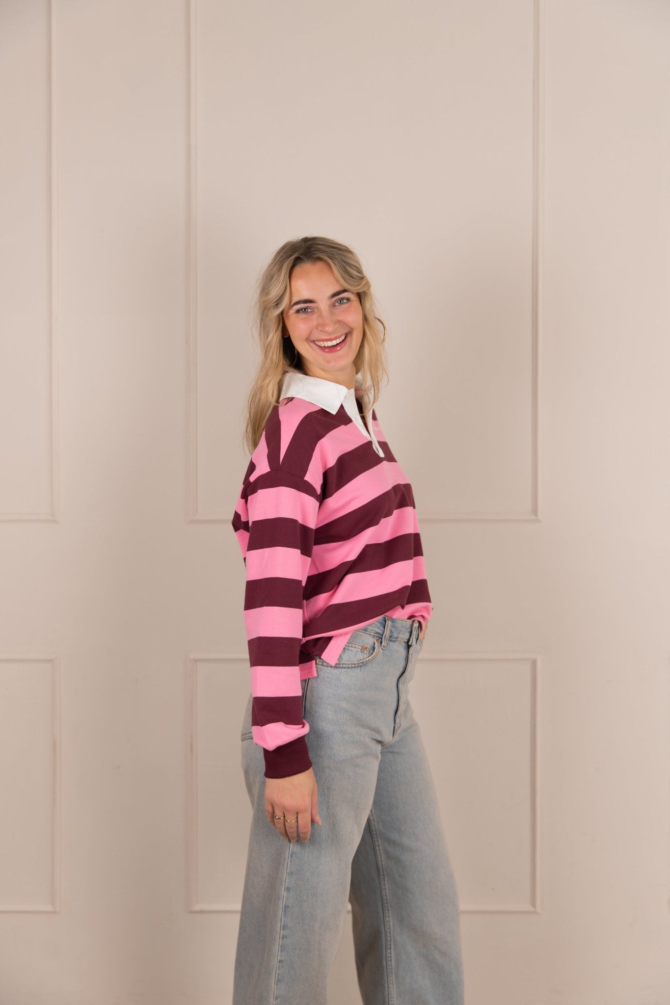 De Skyler Striped Polo in roze is gemaakt van een fijne katoenen stof en heeft een boxy model. Het shirt heeft lange mouwen en een kraagje met knoopjes. De polo is voorzien van een roze streep patroon en een backprint op de rug. Deze polo is perfect voor een kleurrijke touch in je outfit!
