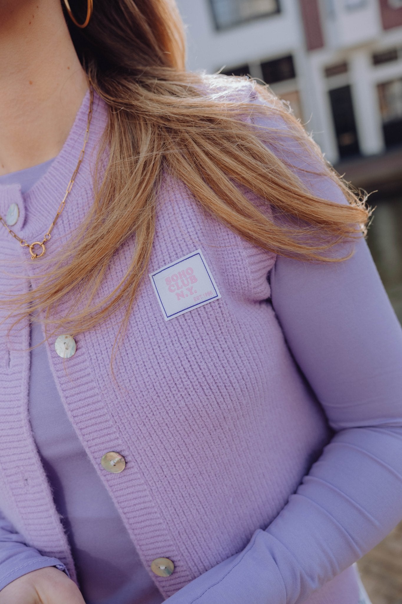 Het Soho Gilet in lila is een gebreid gilet en perfect om te dragen als extra laagje. Het gilet is heerlijk warm en is voorzien van een knoopsluiting aan de voorkant en een patch op de borst.
